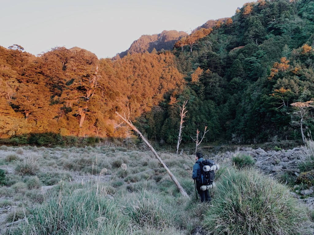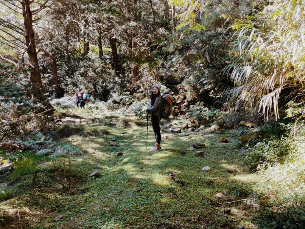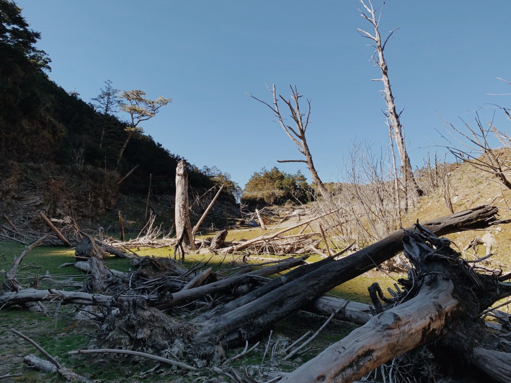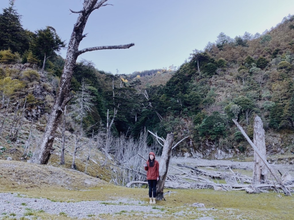 回頭望我們也抵達了堰塞湖營地,這裡已經有好幾帳的人紮營了. 一片草綠色上有許多枯木矗立在此,欣賞完日落後天色也要迅速轉暗. 只能等到明日在好好探索這裡,我們趕緊煮晚餐. 今天我們也是吃羊肉爐,在這個寒冷到不行的溫度之下喝到暖胃的湯真是奢侈. 飽餐一頓後立馬又煮了熱紅酒,臉也跟著暖暖的. 大家在冷颼颼的天氣之下一致決定明天不想去小關山了,只想要好好的享受. 在決定明日不登頂後,大家的心情顯得更輕鬆. 今天營地很熱鬧,有個山友分享了夏天這裡若有水的話就會變成堰塞湖,也是非常的美!