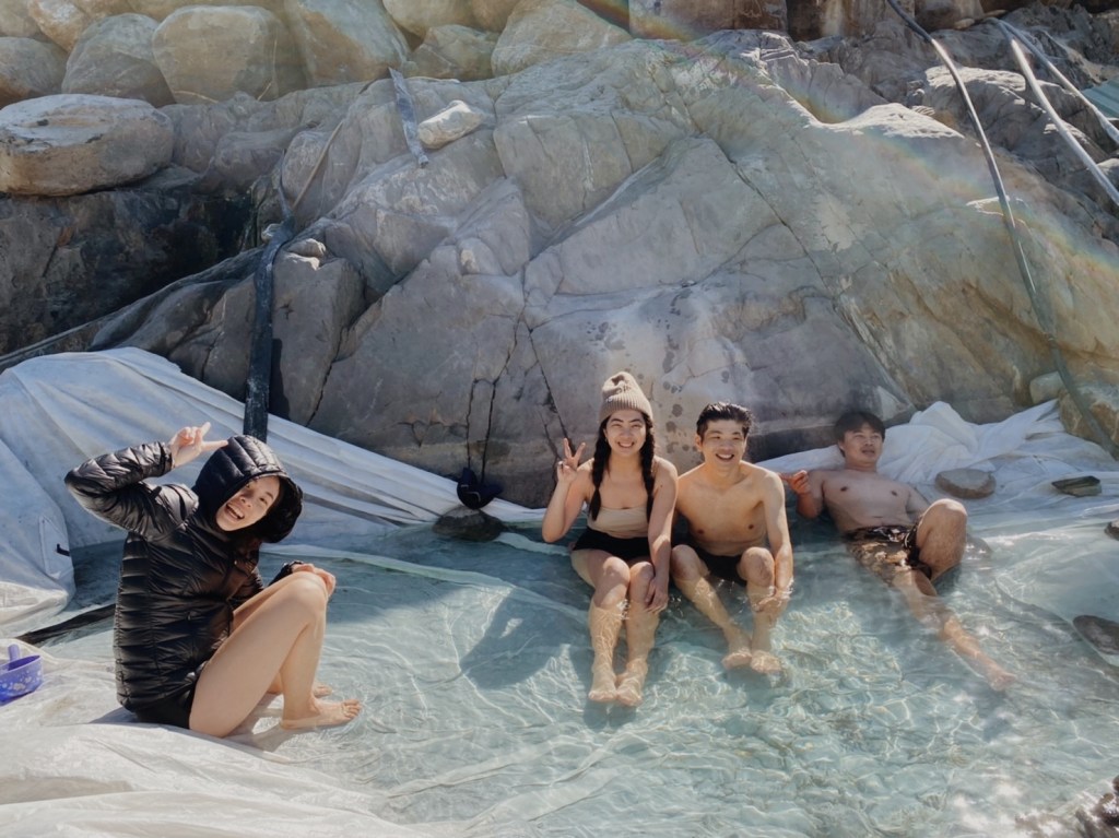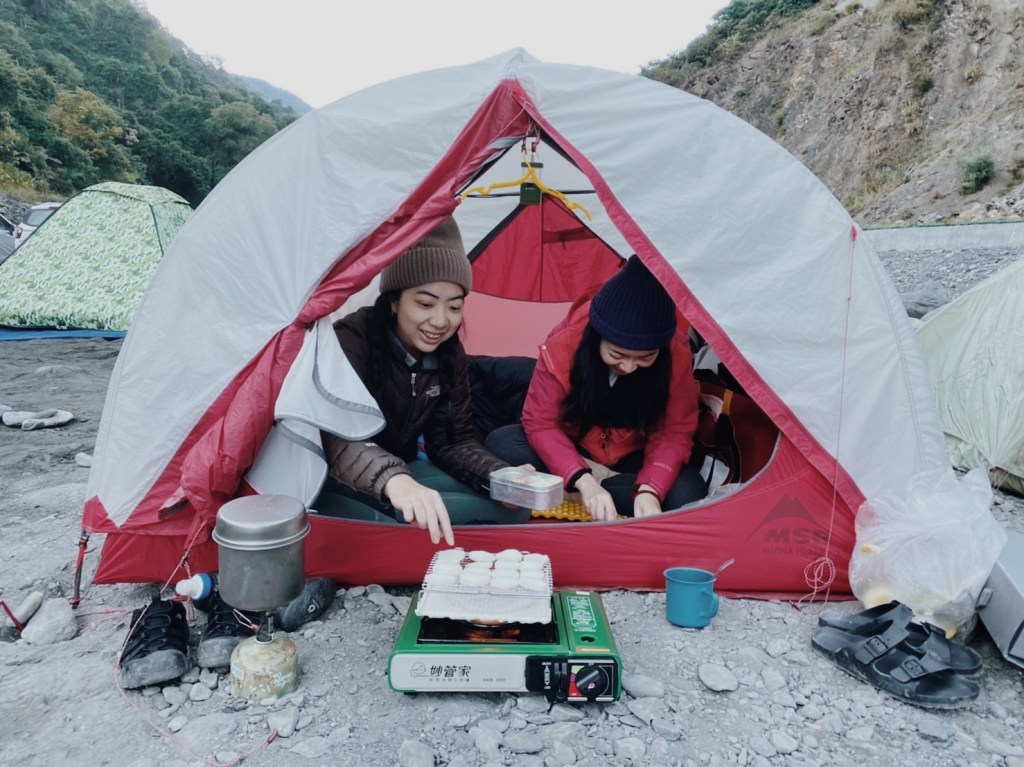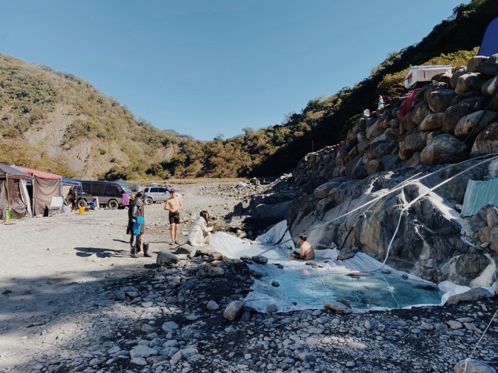我們的車停在上方的空地,若底盤夠高可以在開下去,甚至車子可以溯溪到對面. 我們提著我們的裝備下去找紮營處,這裡真的很寬敞,不過因為都是石頭所以找到平坦處也需要整地. 因為車子可以直接抵達所以這裡真的很熱鬧,大家的設備也都很浮誇. 溫泉在對岸所以我們要涉溪過去,晚上就先來一泡. 溫泉池已經設置的很好,溫度也很剛好超級舒服的! 喝著我們買的梅酒,一掃今天路程會車的緊張感.