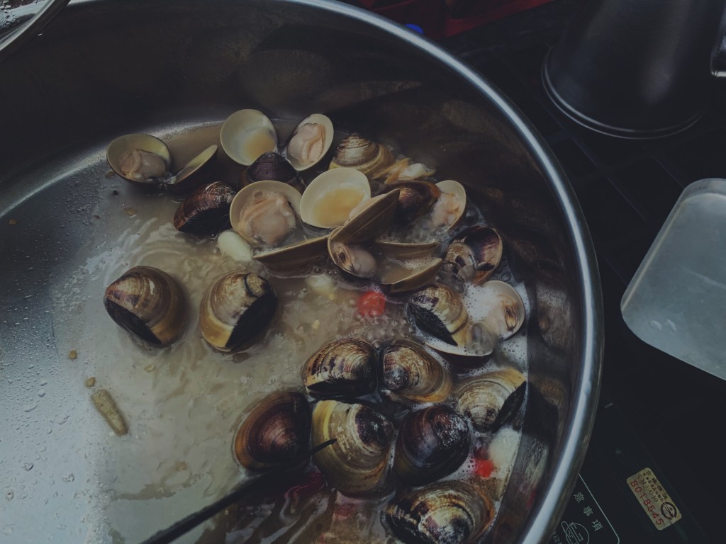 3.加入蛤蜊蓋上蓋子悶煮到蛤蜊打開