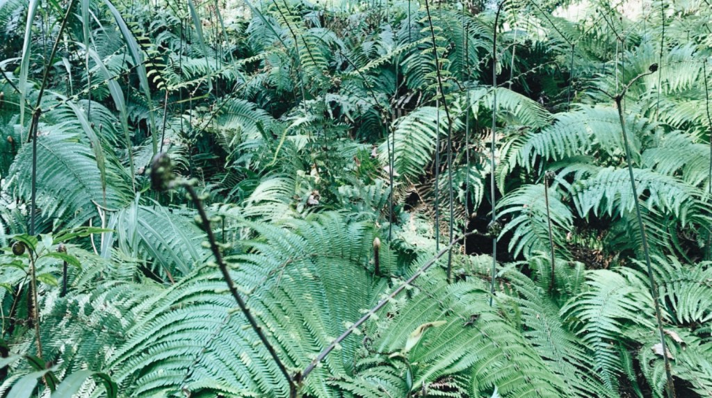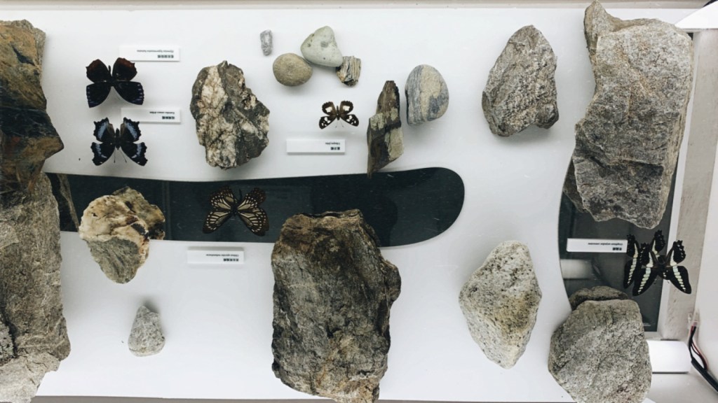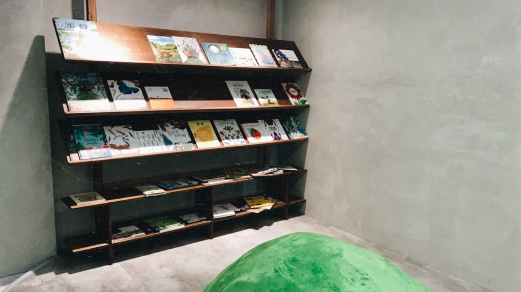 在地下二樓像是走入了微型的混合林,透明的玻璃櫥窗內模擬了林相. 掛著大幅的植物影像,是由廖浩哲團隊在林地中採集所呈現. 另外由「森之形自然教育團隊」將自然環境所見的岩石,昆蟲以標本陳列,可近距離觀察石頭的紋理與昆蟲的姿態. 這裡有一個我很喜歡的角落,書架上放了許多山林相關的插畫書, 中間有著山的裝置,可以脫掉鞋子躺在山上看著繪本. 這個空間讓來訪者能以”生態”的角度去看谷關,就像是書籍的序一般引領我們,接下來的故事與回憶由我們去展開.