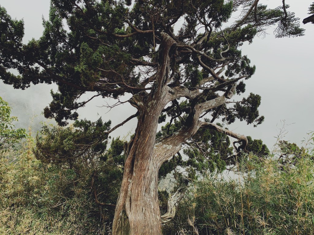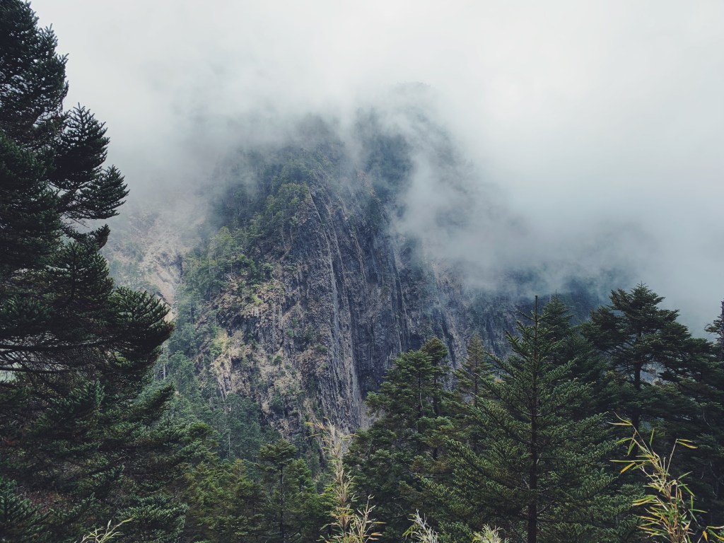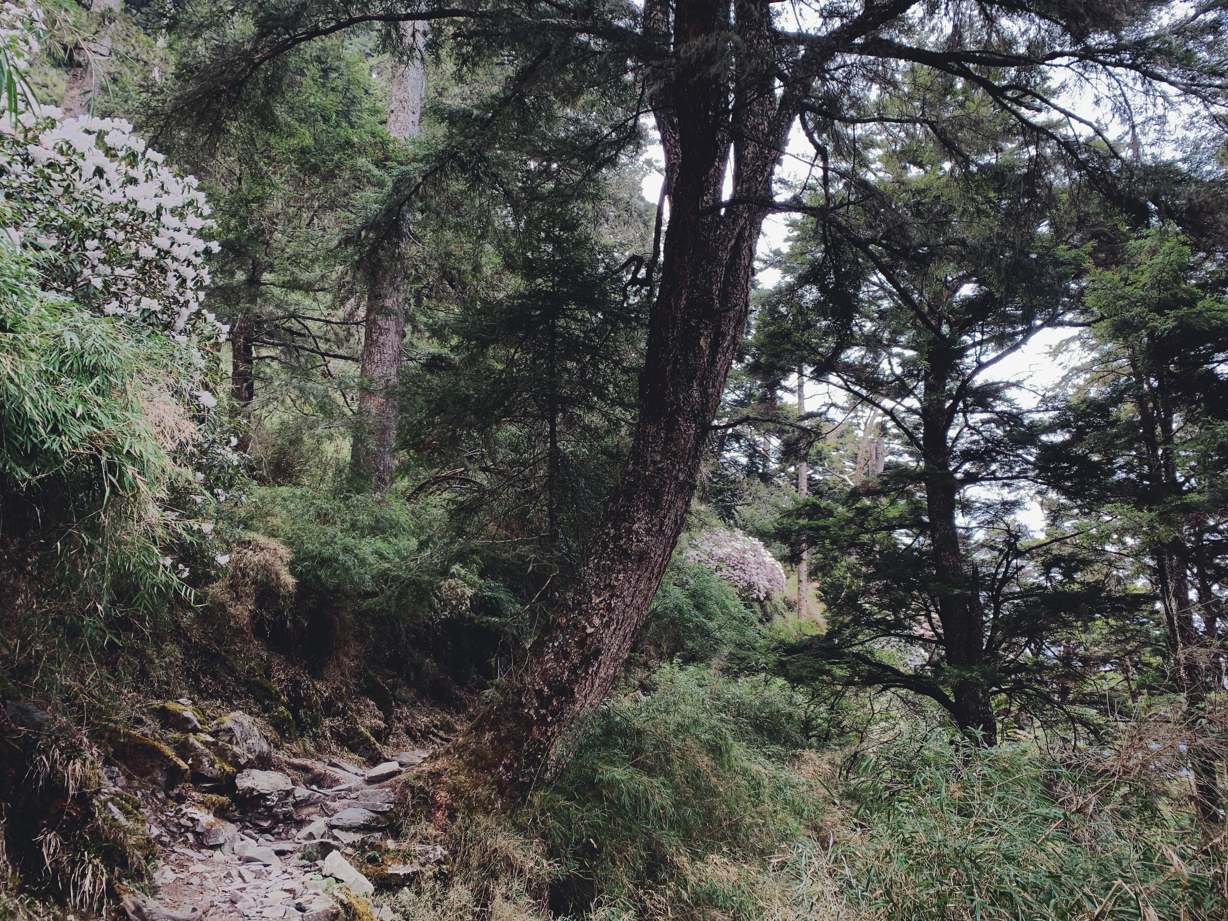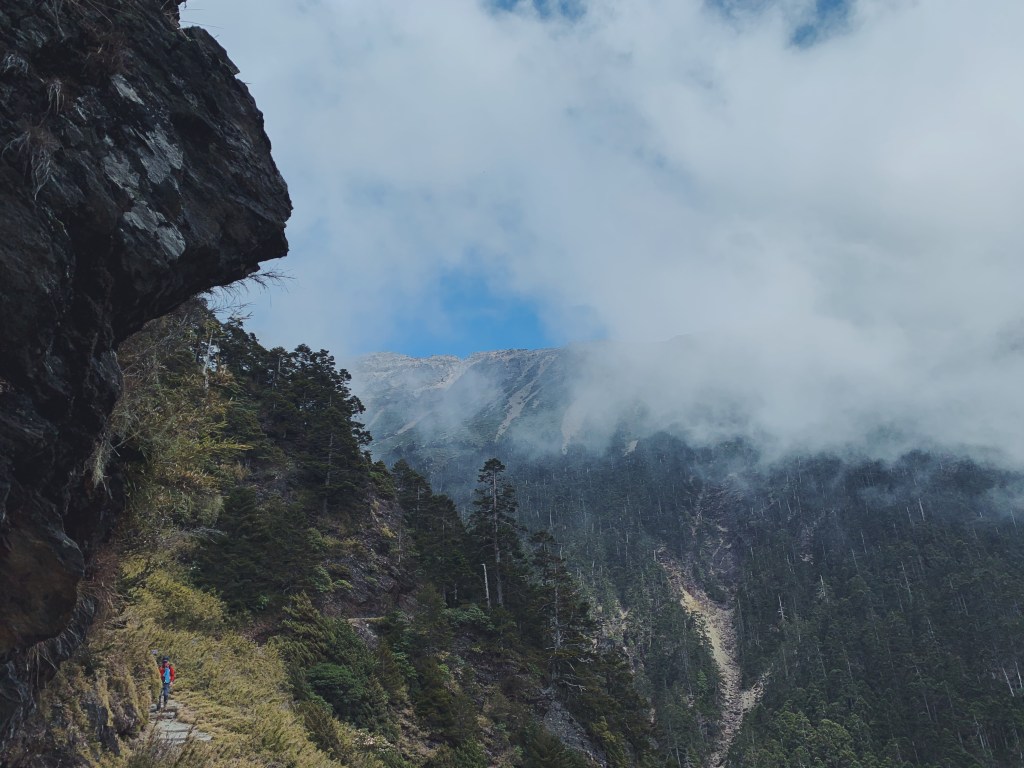 這一路都是緩上坡算是好走,只是海拔比較高特別喘,沿途欣賞冷杉和盛開的高山杜鵑. 我們大約十一點左右在白木林的休息平台大休息補充能量,接近快中午覺得好餓啊! 不怕生的金翼白眉在旁邊跳來跳去,偷吃登山客掉下來的食物碎屑. 鐵杉呈現像是被一陣狂風吹的樣貌一樣,陣陣的濃霧吹來看起來好瀟灑. 大峭壁旁的枯樹屹立不搖,此地質證明了台灣是由歐亞大陸板塊及菲律賓板塊互相擠壓而成. 這時候濃濃的雲時不時的蓋住對面的山頭,矗立在雲霧裊裊中.
