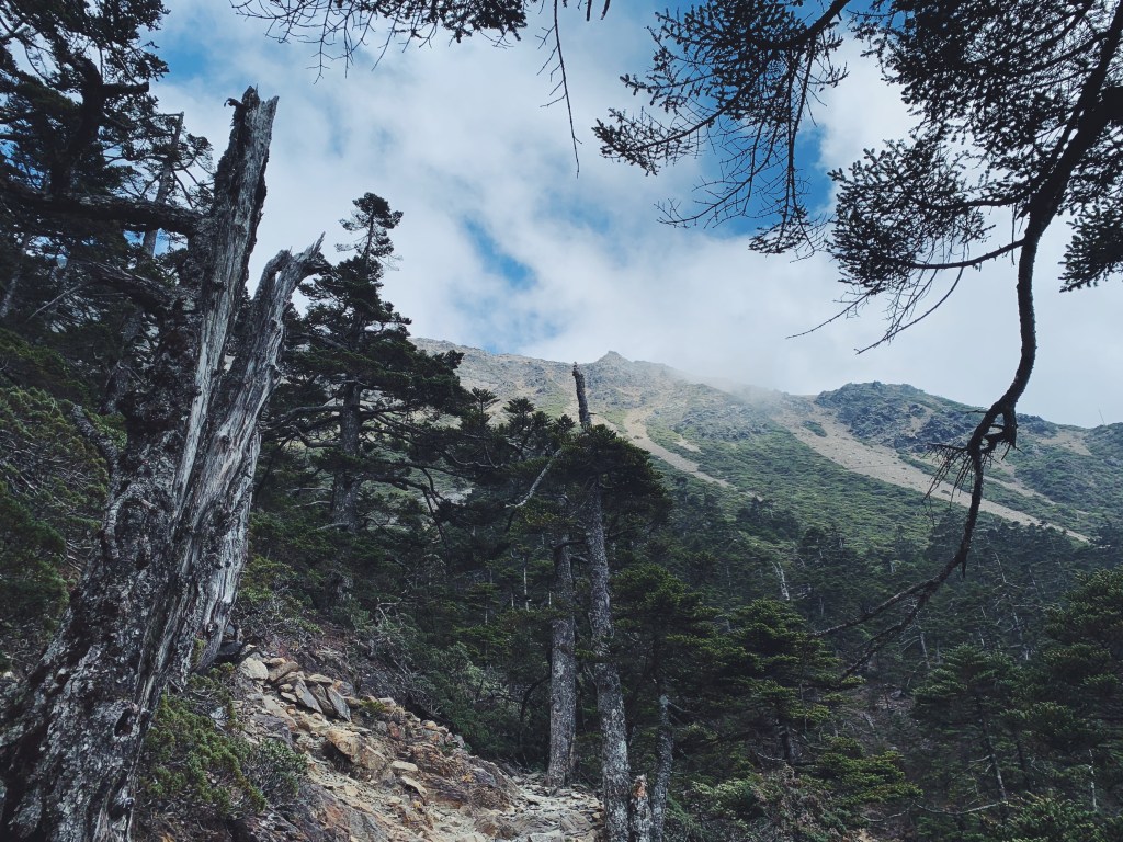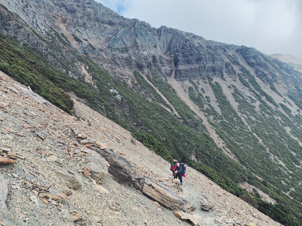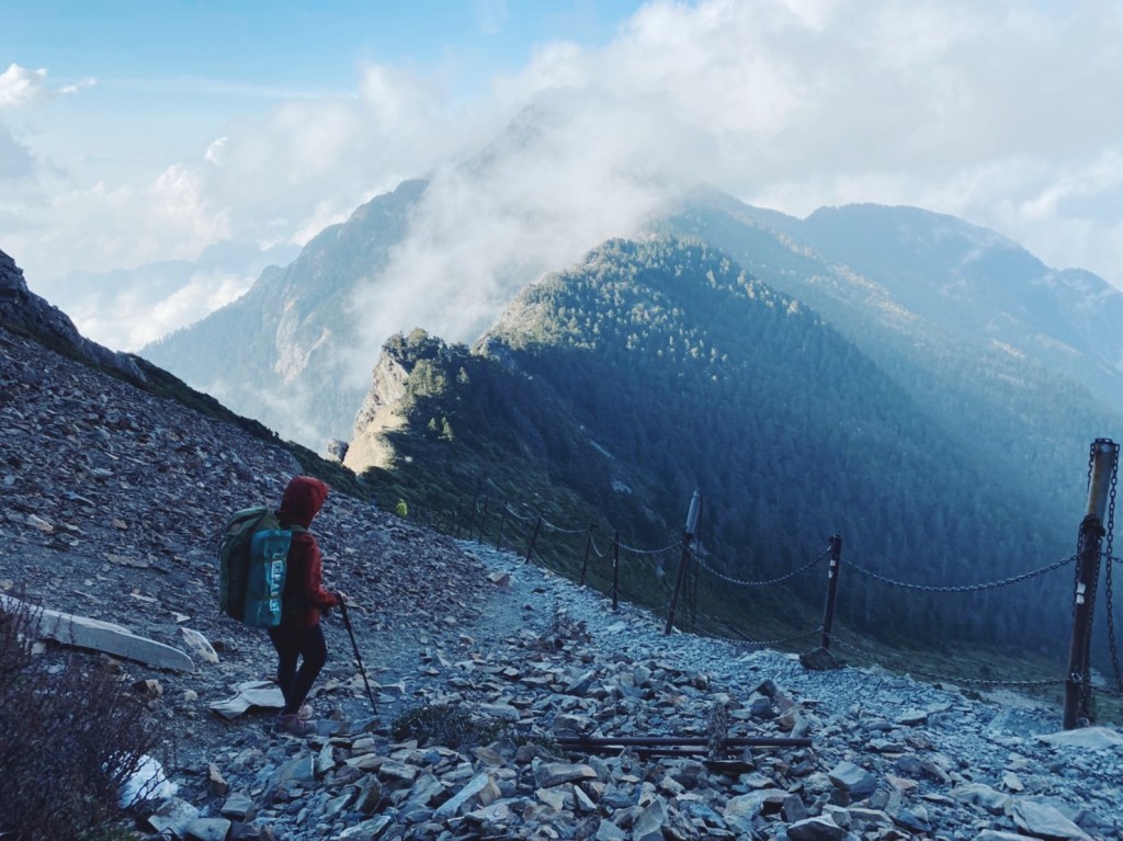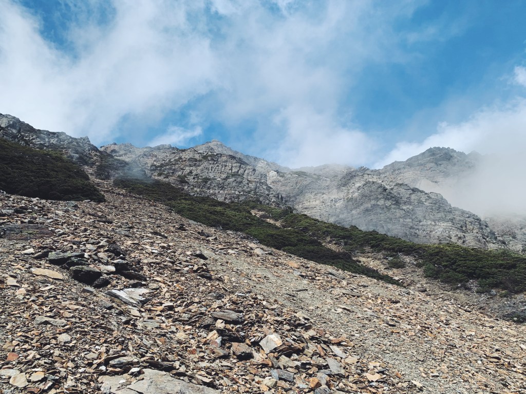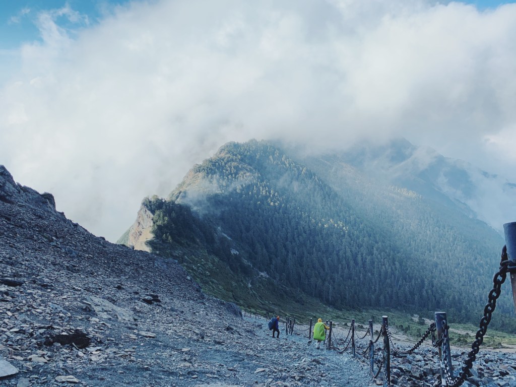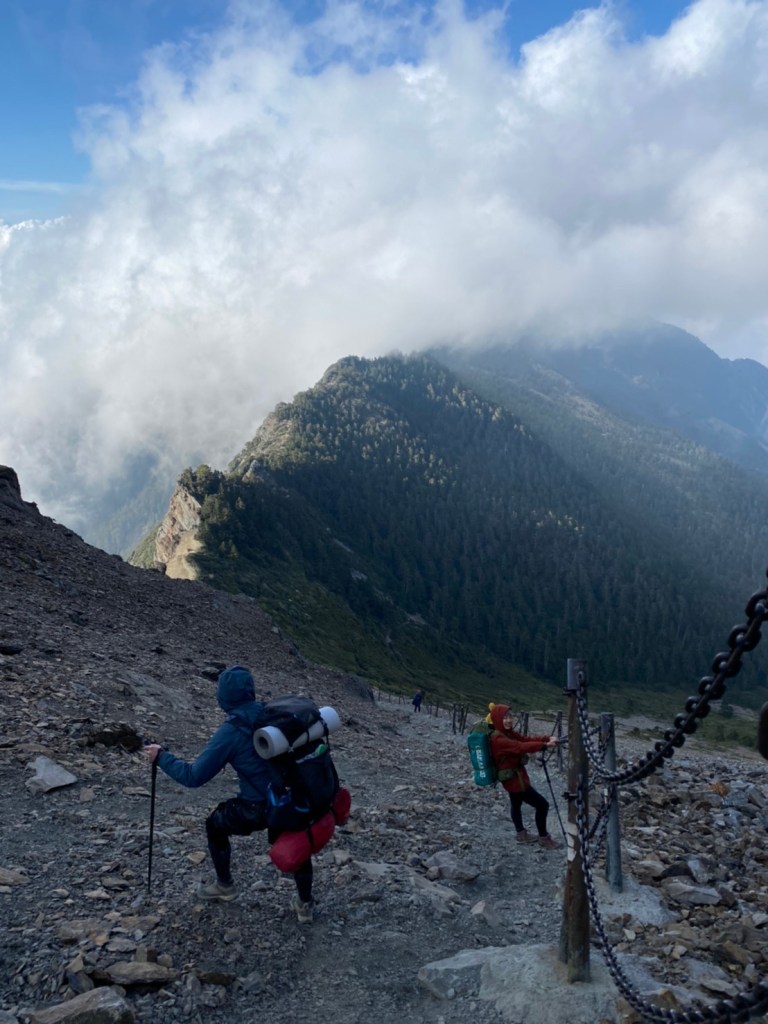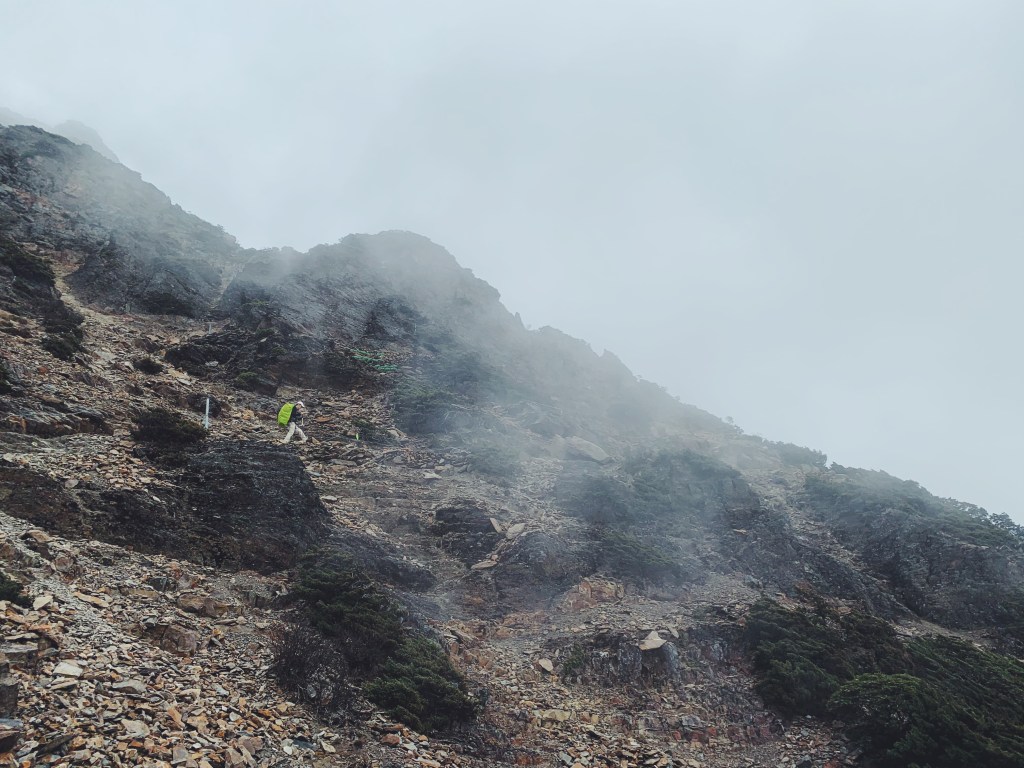 大約下午一點半的時候我們抵達了排雲山莊,在這裡停留休息時能感受寒冷,山莊的管理員很貼心地告訴我們要注意頭部的保暖,頭部是最容易散失熱量的部位,尤其是太陽穴和後腦勺都要有全面的防風. 從這裡我們就要開始走今天比較辛苦的路段, 之字形的上坡,會到前往圓峰山屋的叉路口,我們往主峰峰像續行,接著會出樹林,繼續走著之字上坡,這裡路面都是小碎石,隨著海拔的攀升,背著重裝走一段上坡真的是好喘,每次走個十幾步就要大大的喘口氣.