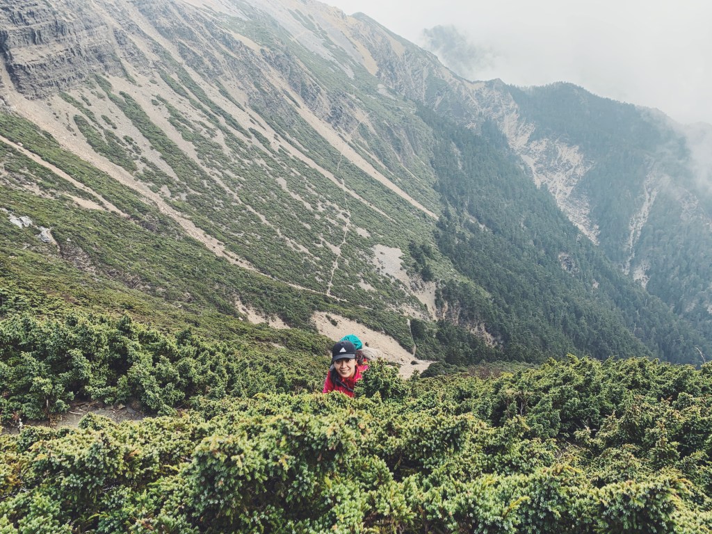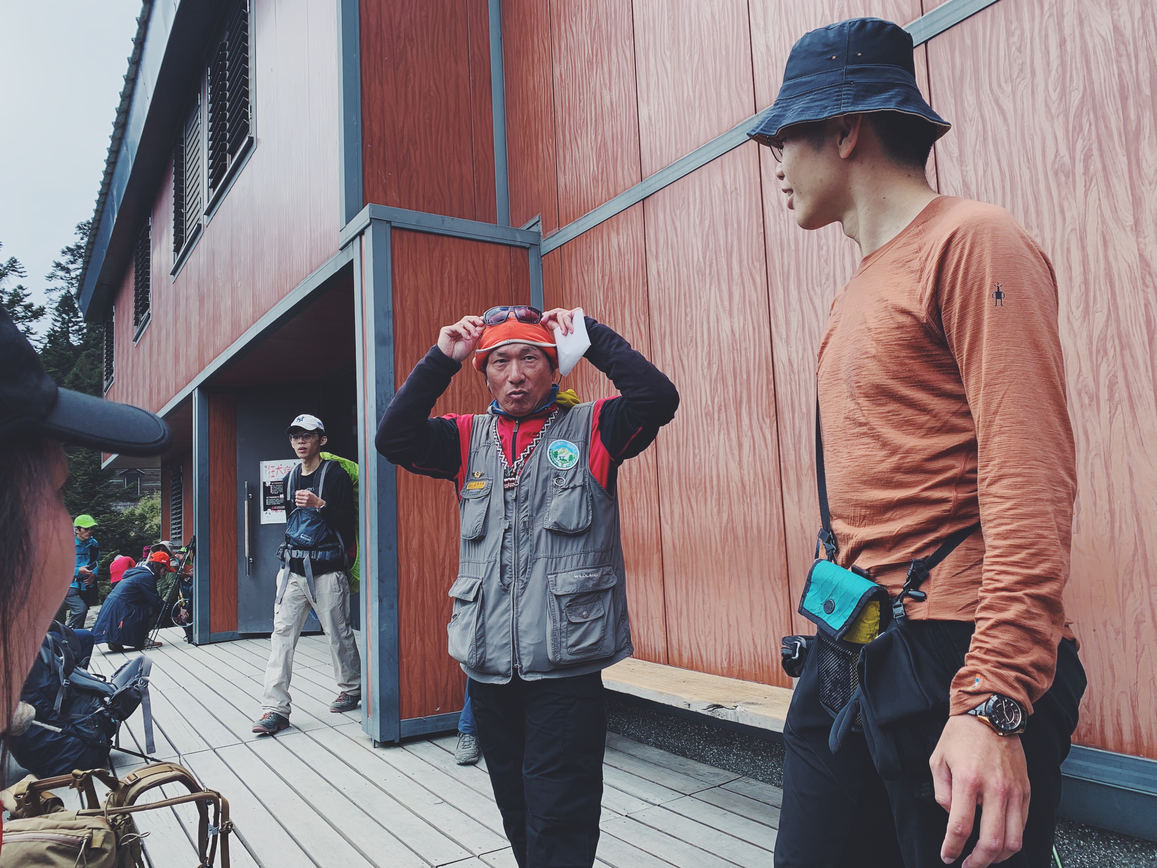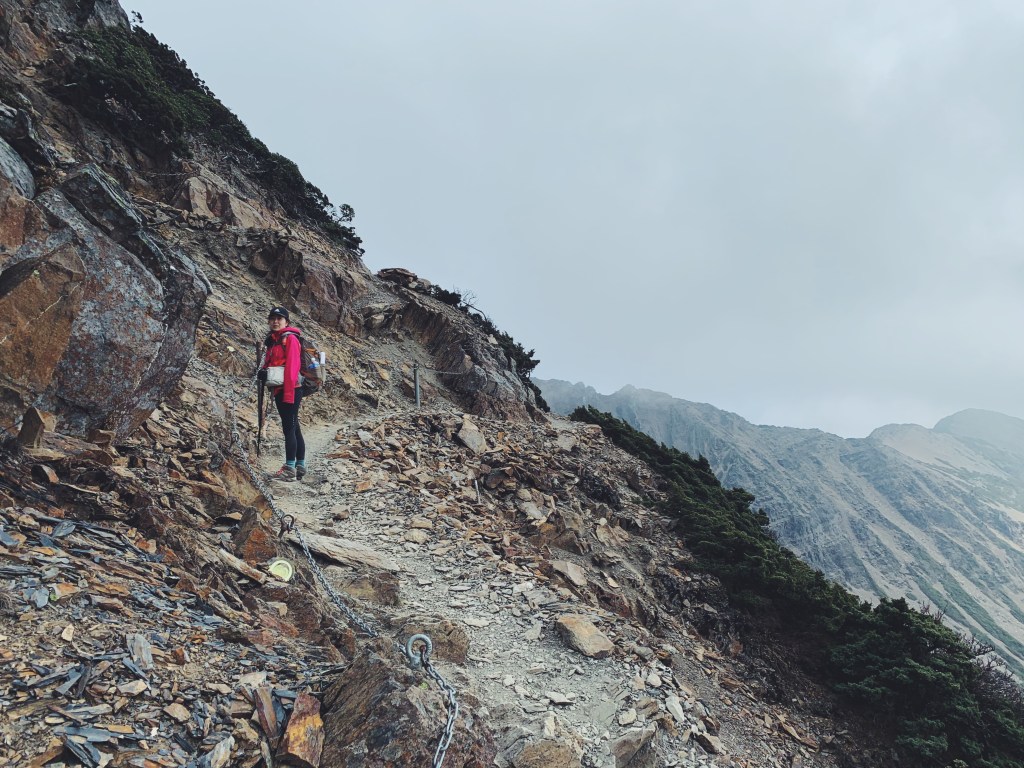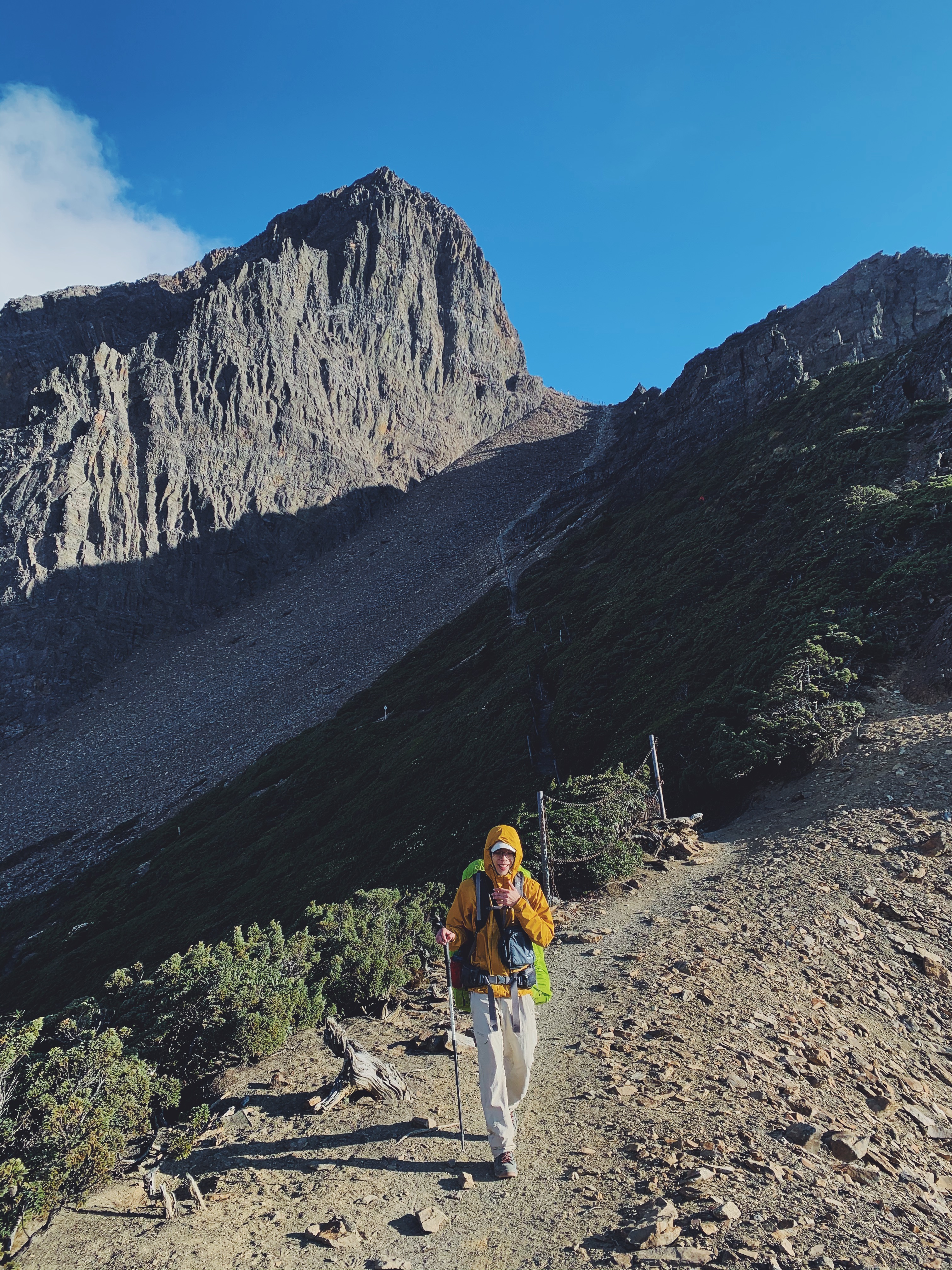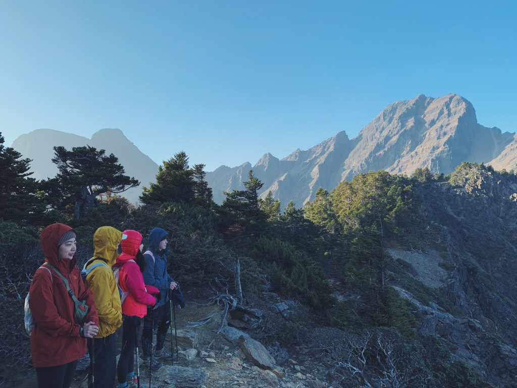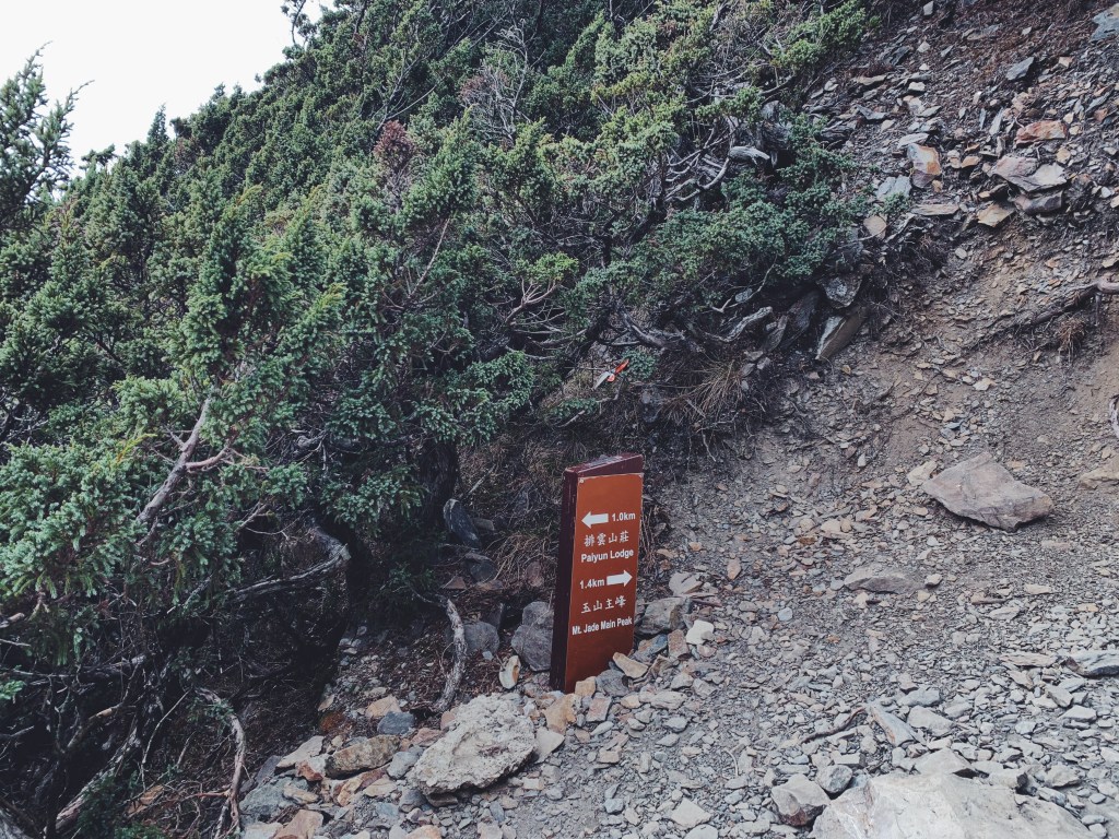 大約下午一點半的時候我們抵達了排雲山莊,在這裡停留休息時能感受寒冷,山莊的管理員很貼心地告訴我們要注意頭部的保暖,頭部是最容易散失熱量的部位,尤其是太陽穴和後腦勺都要有全面的防風. 從這裡我們就要開始走今天比較辛苦的路段, 之字形的上坡,會到前往圓峰山屋的叉路口,我們往主峰峰像續行,接著會出樹林,繼續走著之字上坡,這裡路面都是小碎石,隨著海拔的攀升,背著重裝走一段上坡真的是好喘,每次走個十幾步就要大大的喘口氣.