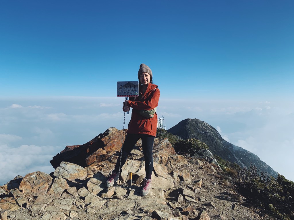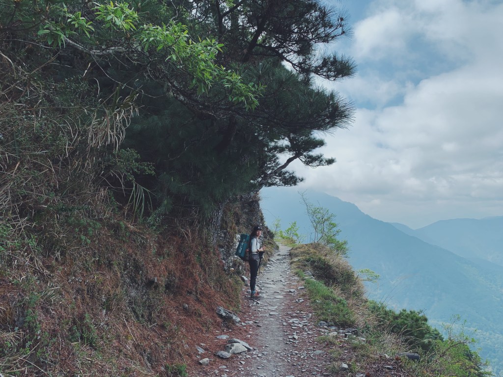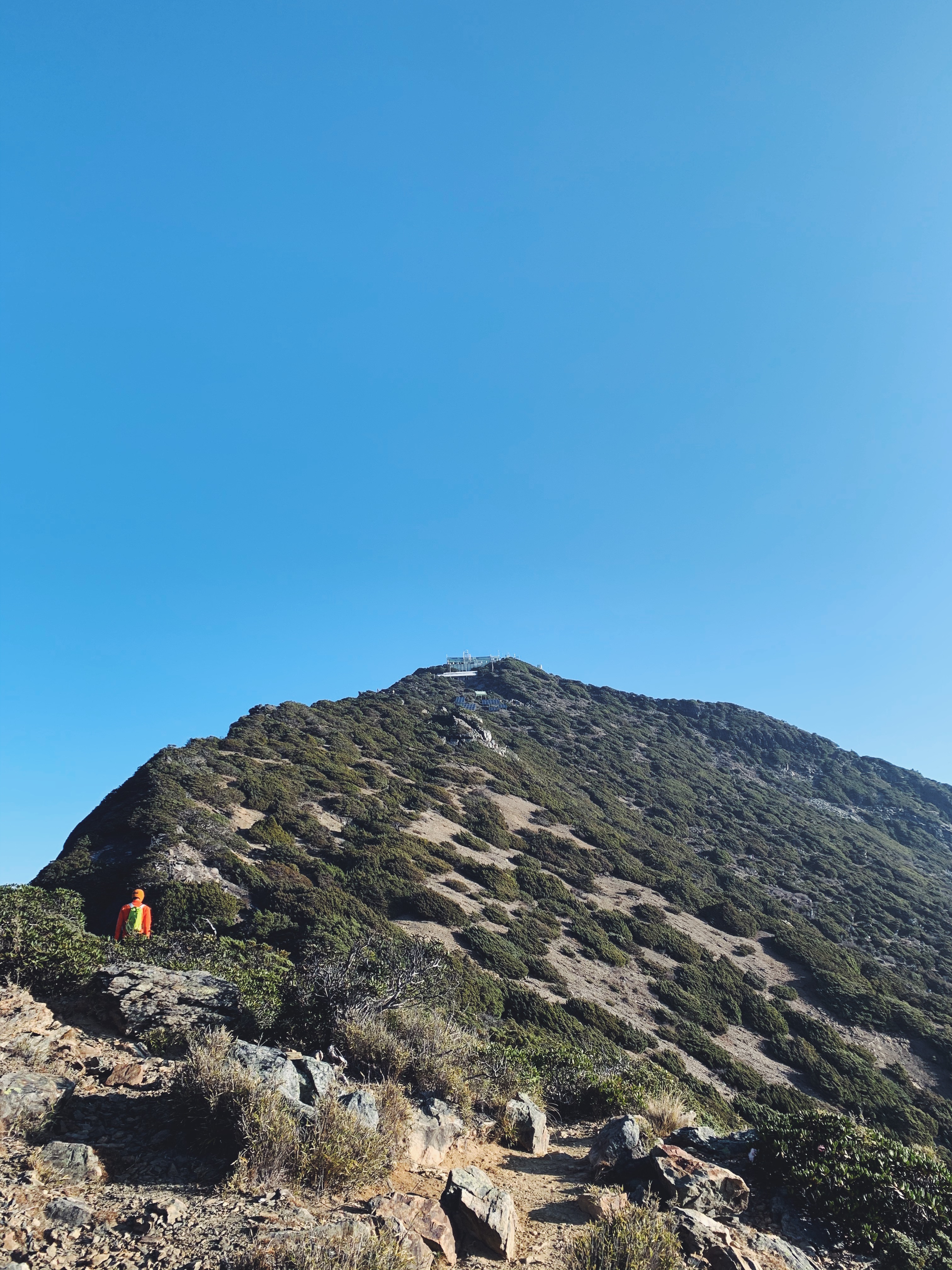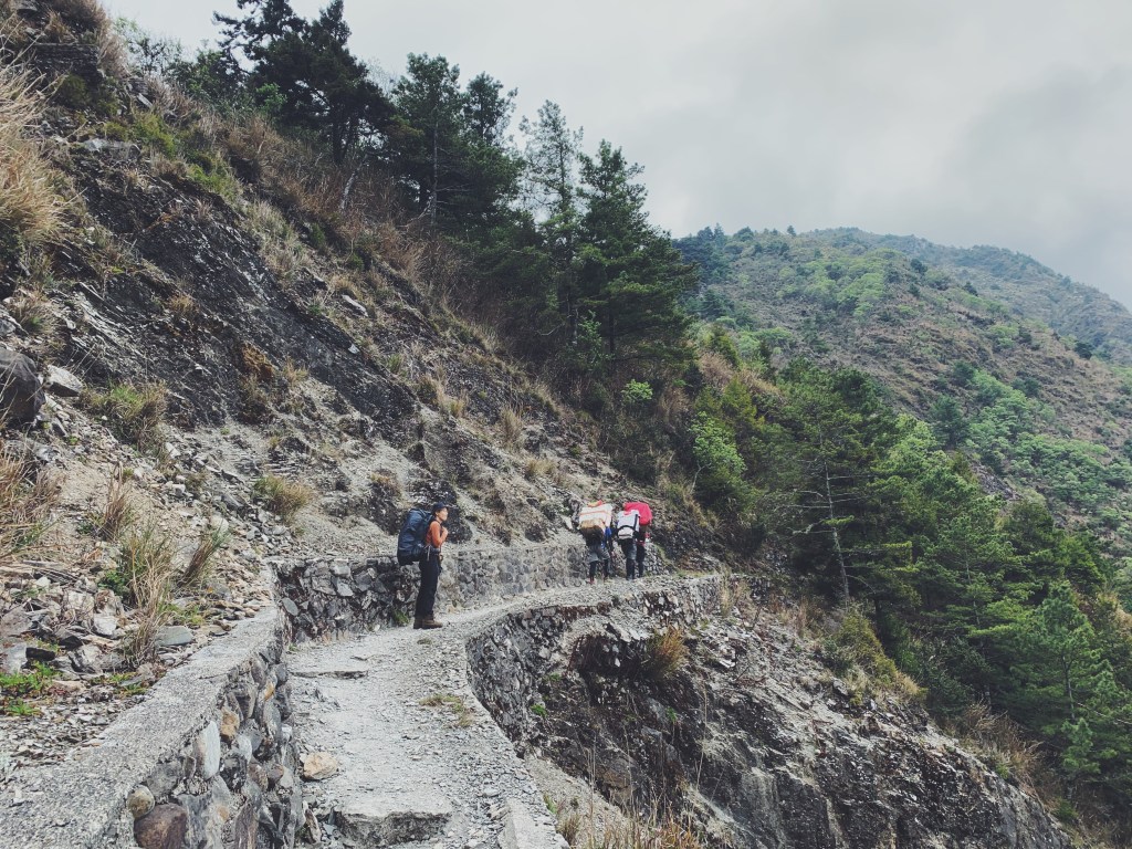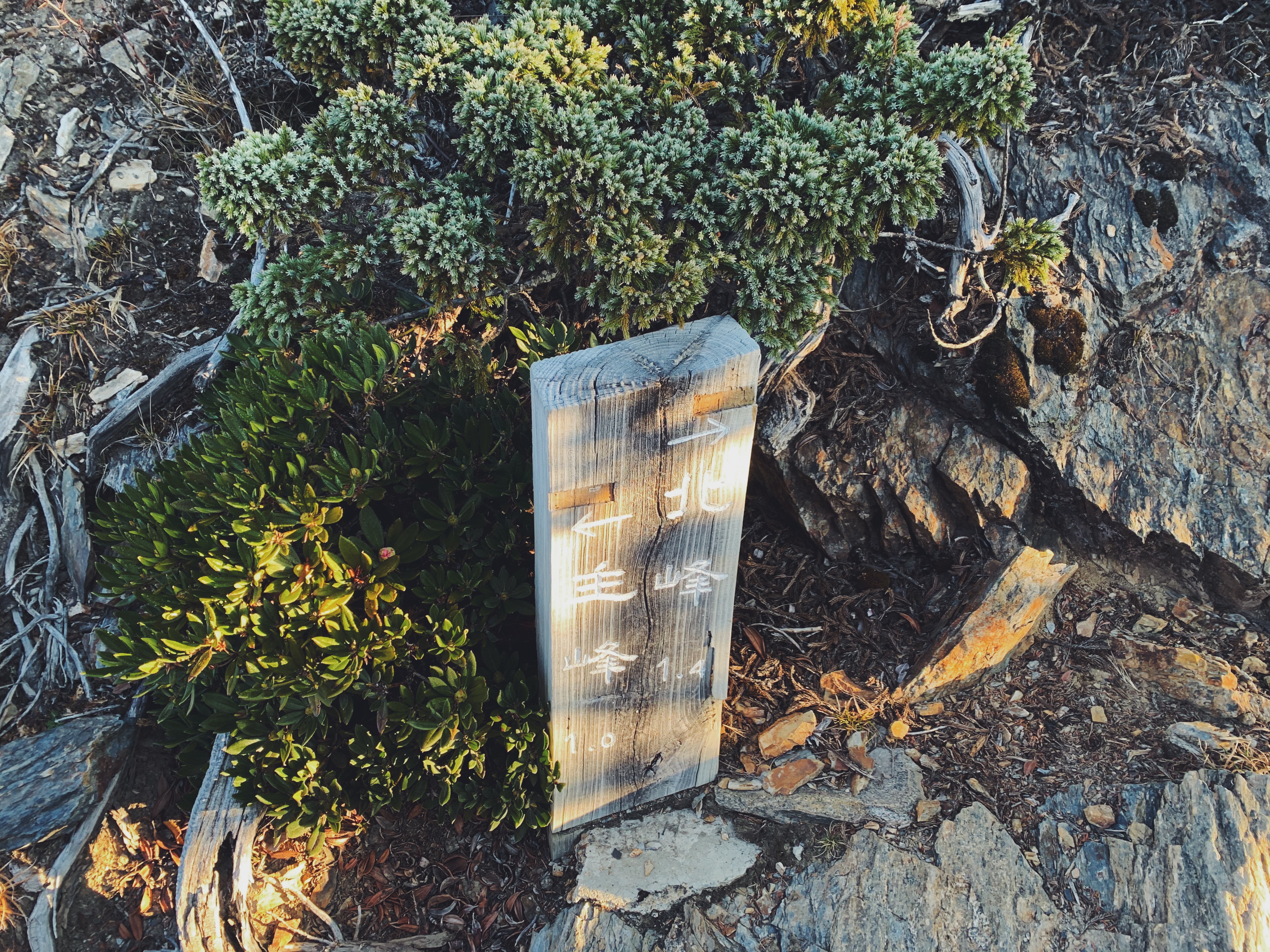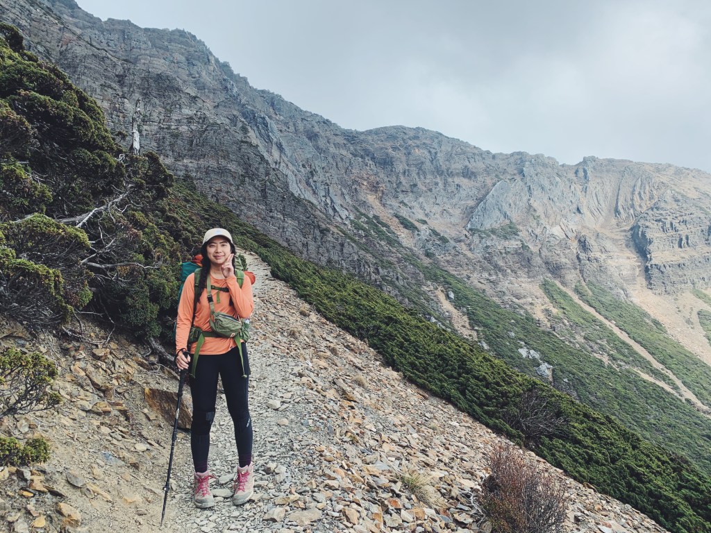 大約下午一點半的時候我們抵達了排雲山莊,在這裡停留休息時能感受寒冷,山莊的管理員很貼心地告訴我們要注意頭部的保暖,頭部是最容易散失熱量的部位,尤其是太陽穴和後腦勺都要有全面的防風. 從這裡我們就要開始走今天比較辛苦的路段, 之字形的上坡,會到前往圓峰山屋的叉路口,我們往主峰峰像續行,接著會出樹林,繼續走著之字上坡,這裡路面都是小碎石,隨著海拔的攀升,背著重裝走一段上坡真的是好喘,每次走個十幾步就要大大的喘口氣.