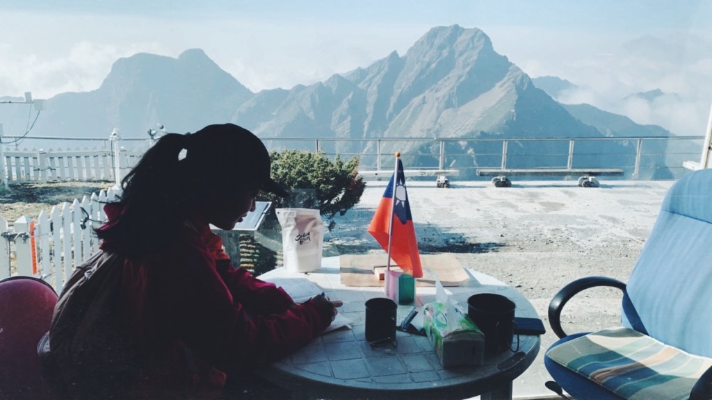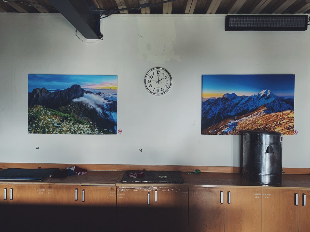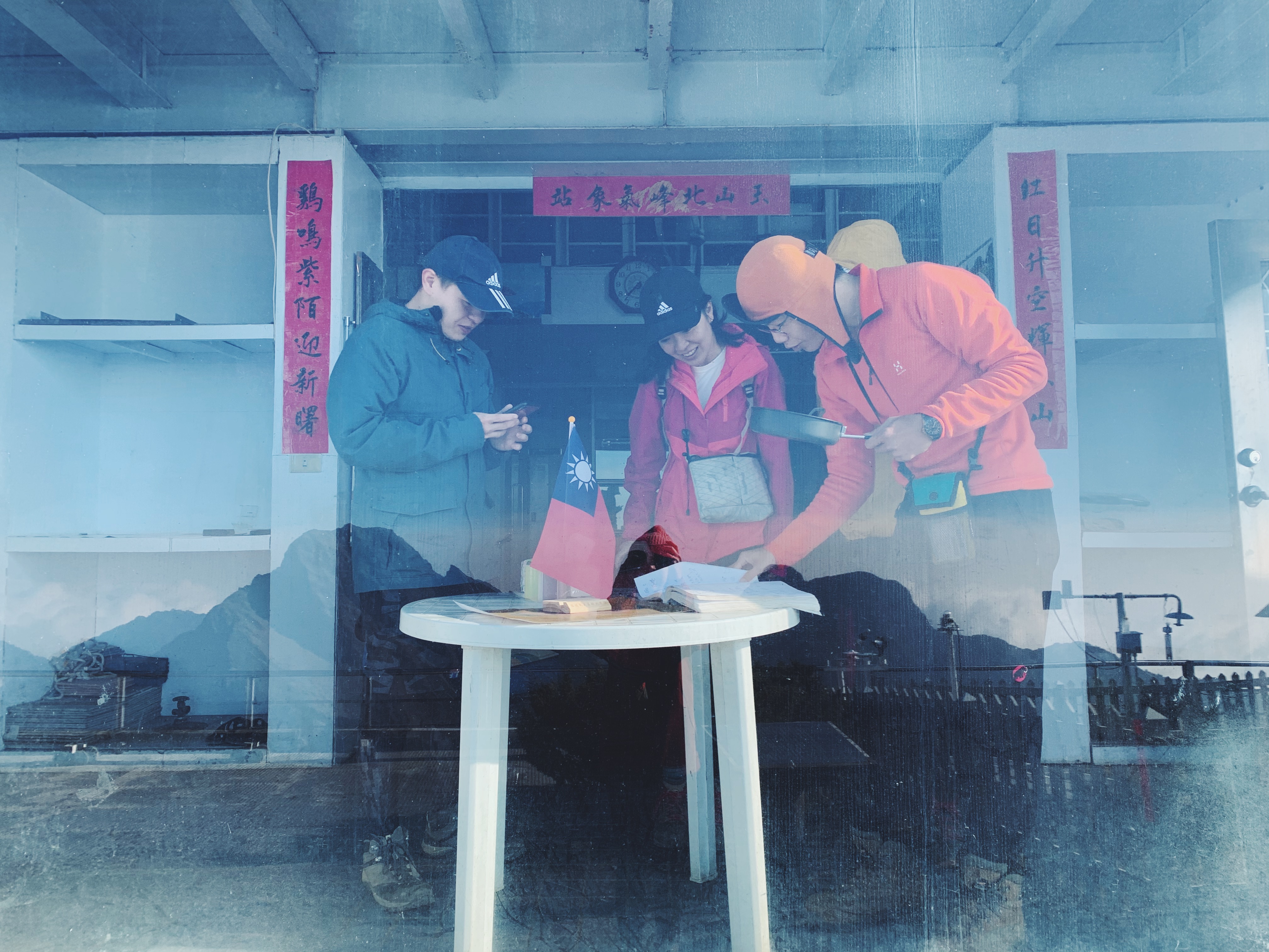 看著氣象站外的門牌就覺得特別酷,是全台最高門牌,上面為玉山北峰一號. 我們在氣象站外吃著早餐,整個平台就只有我們,獨享了玉山主峰最棒的觀賞角度. 看到氣象站的人員來到外面器材進行觀測,我很不好的意思前去跟他說要把我設計的海報送給他們,氣象站的員工拿著海報說這個要貼在氣象站裡. 當他拿進去後其他員工走出來拿著海報叫我簽名,我們就這樣進去一探氣象站的內部了. 裡面的員工把桌子搬到大玻璃窗旁邊,從片窗看出去就是玉山主峰.