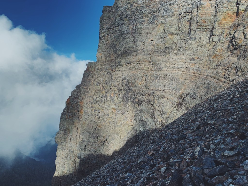 看到鐵鍊的時候就知道快要到主峰下了,這時候霧壟罩著,冷冽的風吹來,緩步走著終於來到了北主峰叉路口. 我又來到這個痛苦的碎石坡了,拉著鐵鍊要雙腳踩著剎車往下走,這時候強烈的風吹著,往下走的同時回頭望上主峰不禁讚嘆著. 剛剛那些雲霧都被吹開了! 玉山主峰襯在就在清晰的藍天之下,裸岩層在太陽光下清晰可見其褶皺,這個角度看主峰真的是很壯觀.