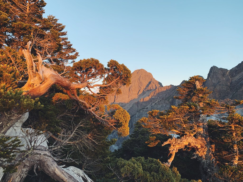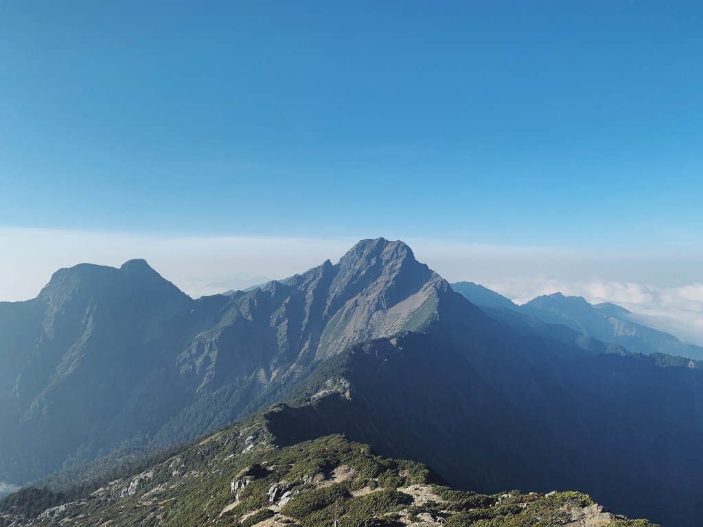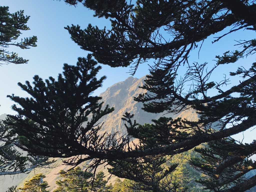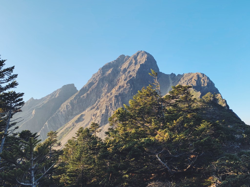 好在早上醒來之後覺得精神恢復,頭也不痛了! 可以如計畫的上北峰,因為都再次走到這裡來了,天氣又這麼好,沒有上去真的是會扼腕. 早上六點天空非常明亮,呈現透徹的藍. 玉山主峰因為陽光的反照所以有點像是隔著一層薄紗一般, 往北峰的路蠻好走的,只是依舊喘吁吁啊! 深深覺得要前往氣象站上班的之路還真是辛苦啊. 沿途的玉山圓柏擁有著阿娜多姿的樣貌,樹形是那麼有魅力, 回頭望諾大的玉山主峰就這樣在眼前展開.