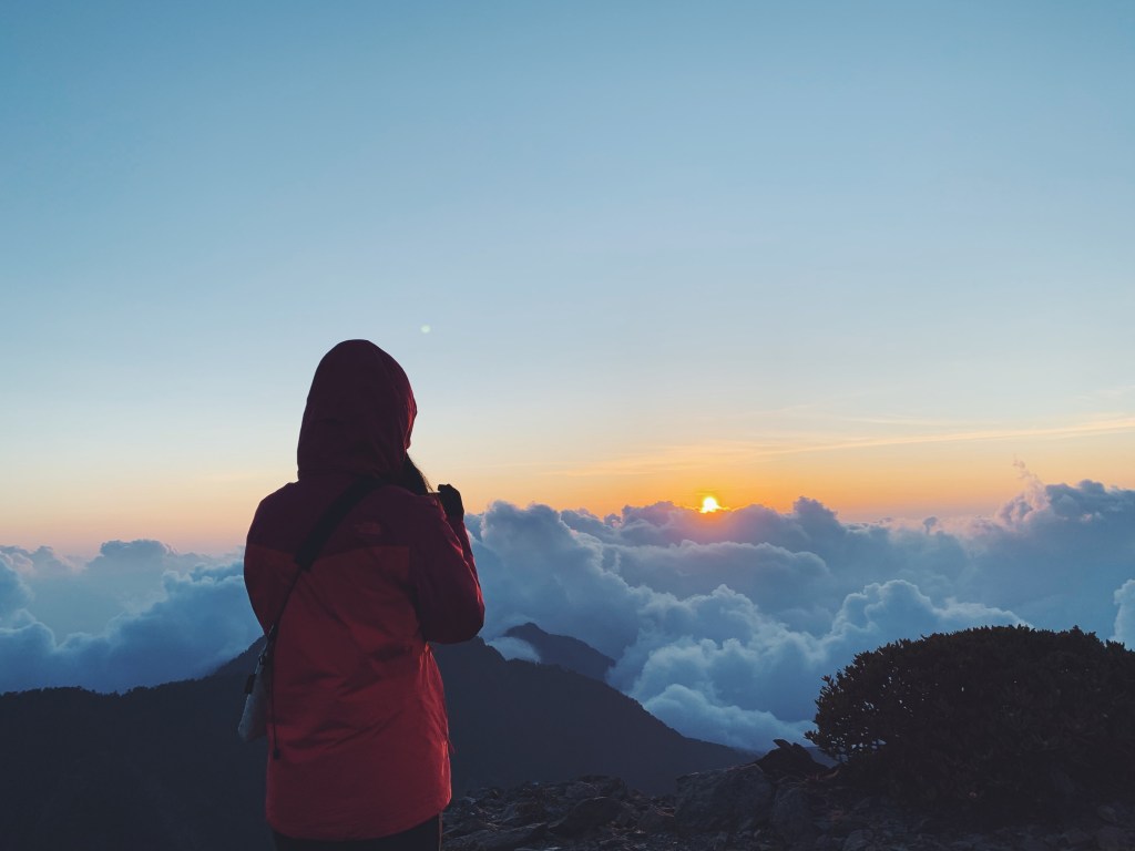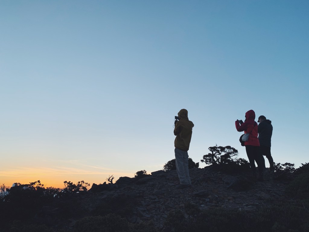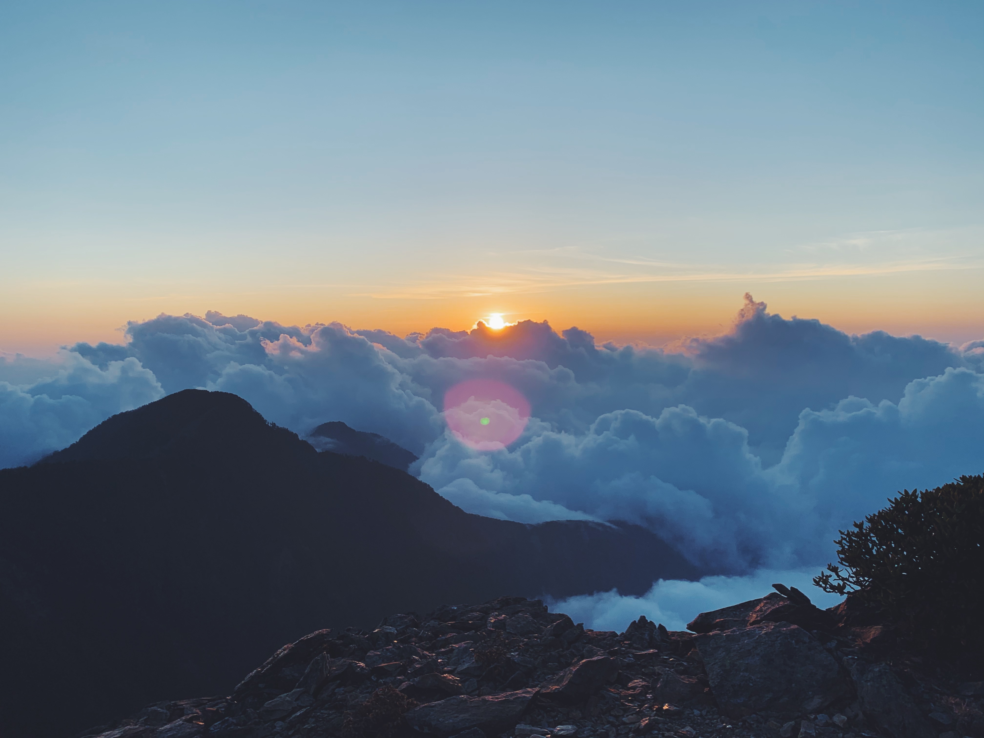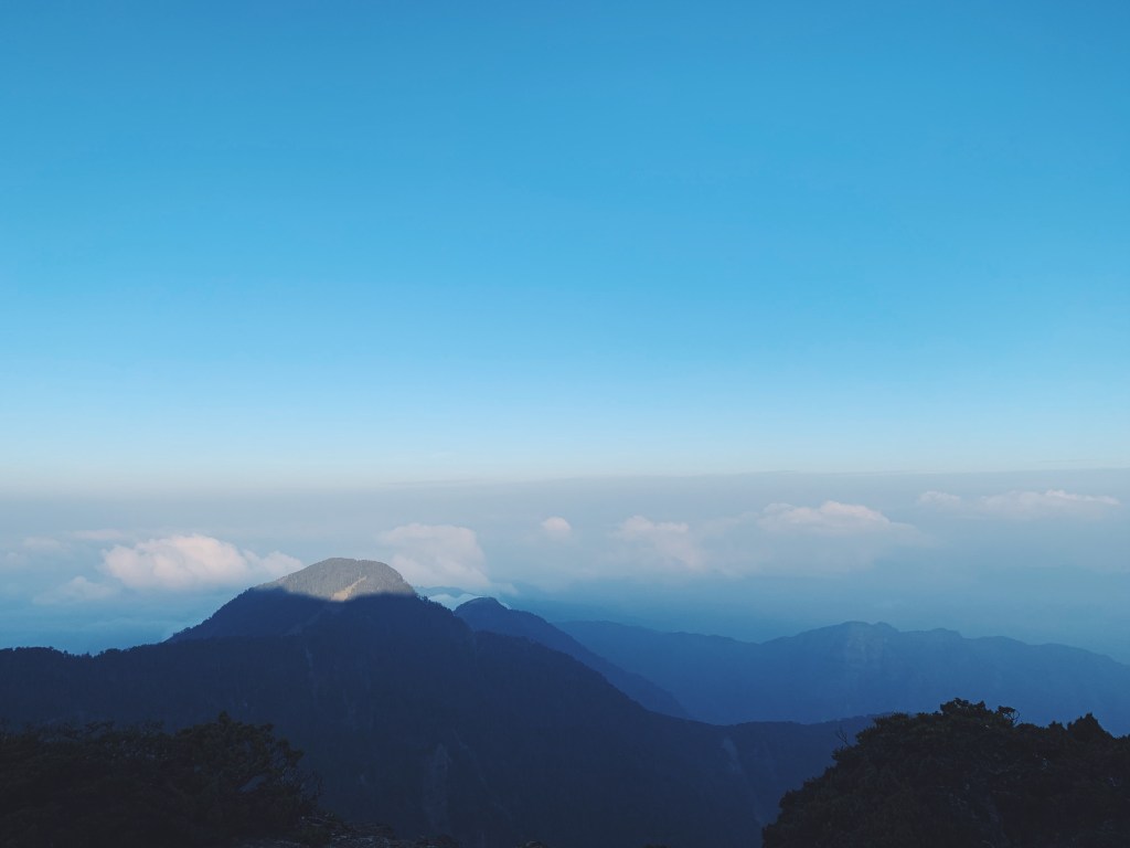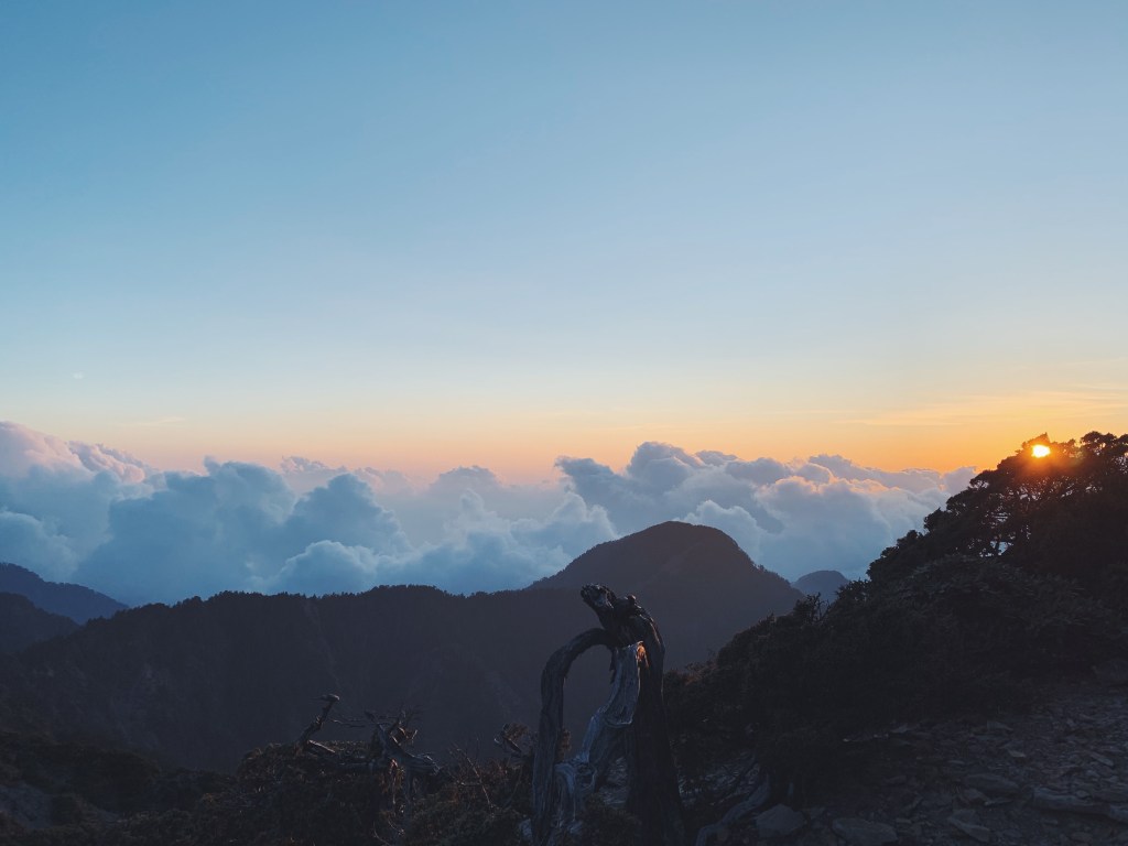 接近黃昏太陽西下,滾滾的雲層形成雲海,橘紅色光芒讓天空形成一個從橘色,黃色到藍色的漸層. 橘黃色的光芒撒在樹林上,玉山主峰也換上橘紅色的衣裳再次華麗出場,這個百萬夕陽美景讓我們無法自拔. 今日不確定是因為海拔的快速攀升抑或是在走碎石坡往下時那強風導致我高山症發作,到了營地後躺在帳篷裡沒有任何食慾,吞了感冒藥後只好一直躺著休息,心裡有點擔心明日我的北峰是否還有力氣前往,心裡默默的祈禱能在明天之前轉好.