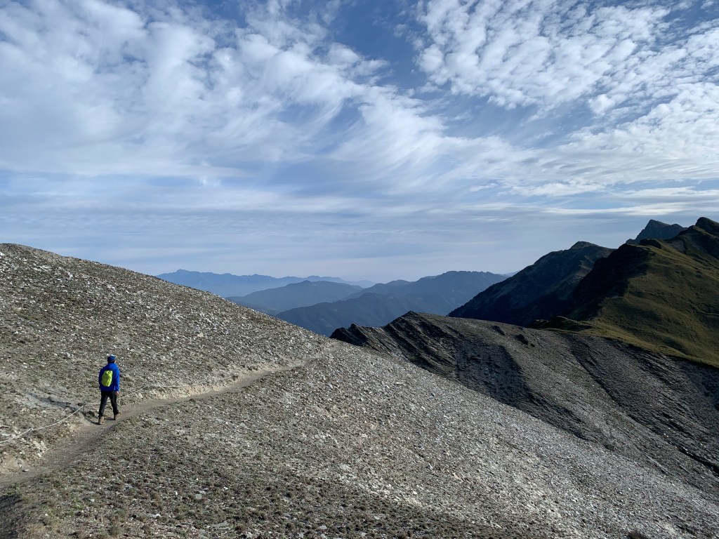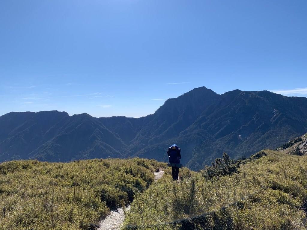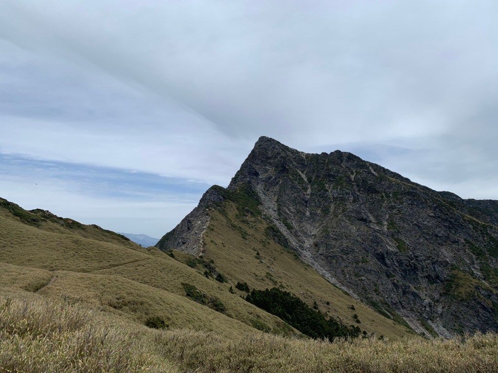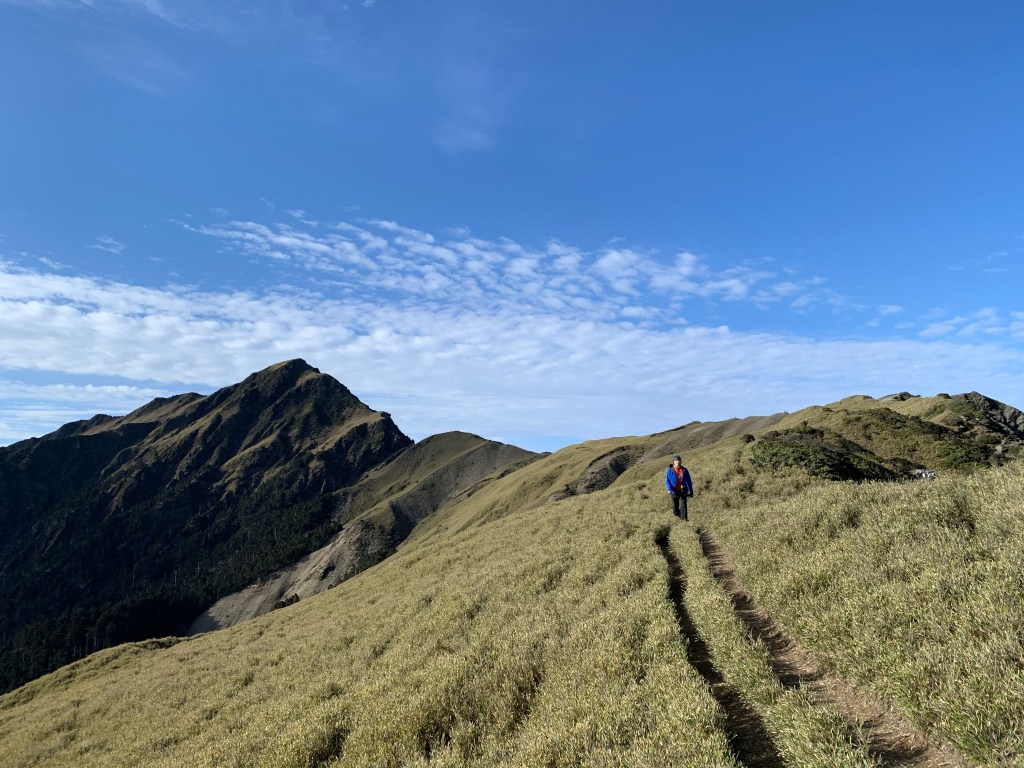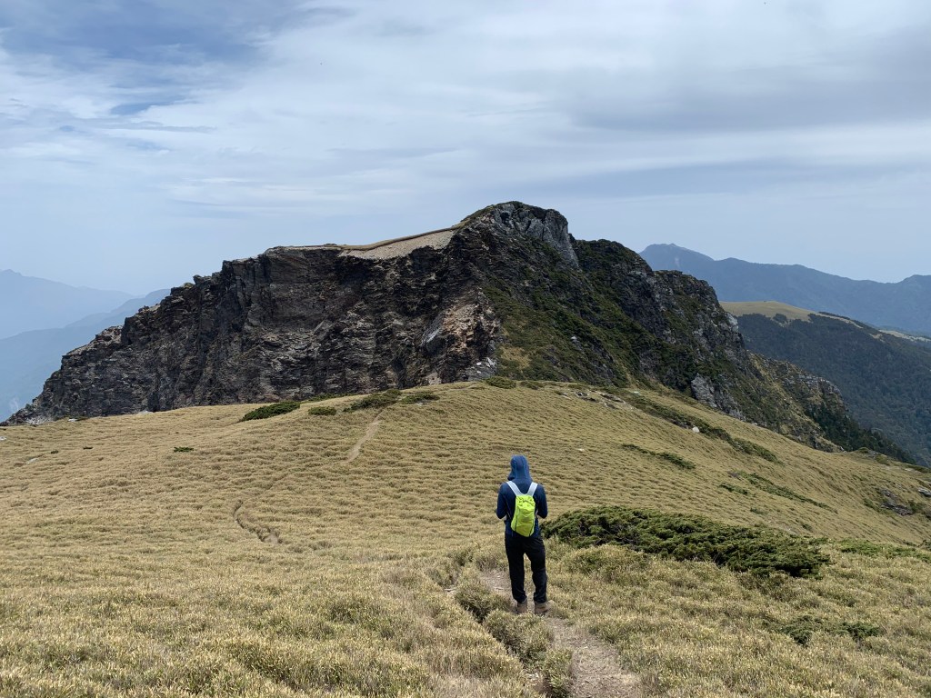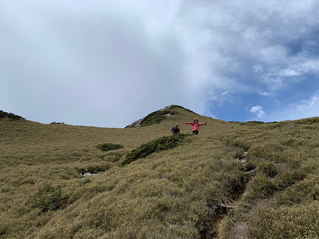 回到營地大休息後出發前往奇萊北峰,由於北峰地形後段較為陡峭,被列為「十峻」之一的山,有懼高症的我帶著既期待有緊張的心情前往。從紮營處往上稍微爬升小段後,沿著平緩的草原邊行走,偶爾回頭望著那彎曲延伸的稜脊,時時刻刻都在讚嘆著。越來越接近北峰的基座,取而代之的是陡升的碎石土坡,越靠近更能感受北峰那壯碩山體的氣勢。如果將奇萊主北峰比擬成人的話,我會說奇萊主峰就像是個看似柔美的女人但也有剛強那一面,而北峰就是像是充滿威嚴的男人不苟言笑但卻默默守護。