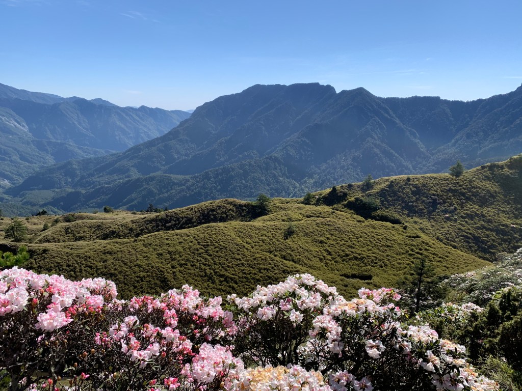 約七點半,沿著松雪樓旁的柏油路走下去就會到小奇萊的登山口,從平緩的碎石步道進入上下的冷杉林中,這裡由於陽光照不太進來所以地會較泥濘濕滑一些,在出冷杉林的後段會有需要簡單的拉繩和梯子。從樹林中出來,小奇萊那綠意的草原在眼前展開,對面奇萊山脈的剪影毫無遮蔽的綿延。草坡上開滿了爭奇鬥艷的高山杜鵑,粉紅白相間灑滿了整個綠地,一道飛機雲劃過了藍天,陽光毫不保留的照滿了整面山林,通過小奇萊,我們漸漸地遠離了喧鬧的人群。