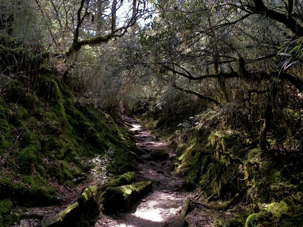 從這裡到黑水塘山屋一路下切,黑水塘山屋所在地點為路程的最低點,海拔約2710公尺,一出發我最不喜歡的就是下坡,因為我都會想著回程這麼累還要上坡真的很痛苦。過了黑水塘山屋後開始就是上坡,這裡可說是暖身,但怎麼已經氣喘吁吁了! 這一段樹林像是奇幻森林一般,樹幹枝條都覆蓋著軟綿綿的植披,踏著形成階層的蜿蜒的樹根持續往上走。早上約10點20分我們來抵達了成功山屋,我們在嘩拉拉的水源旁休息。
