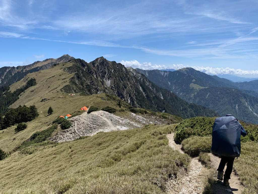 天空已經全亮,返回營地的路途終於可以清晰的看到這片壯觀的金色大草原,這一段真的是美到爆表,再加上路途平緩可以好好的欣賞周圍。中間有一段是猶如在外星球上的碎石頁片,光禿的樣貌跟旁邊的綠草如茵形成對比。一覽無遺的奇萊主峰就這樣與眼前的稜脈相連,氣勢磅礡且挺拔,那個壯闊感要親眼所見才能感受。迎面而來也有許多山友要前來登頂,也有要走奇萊連峰的勇猛隊伍。各色的帳篷在稜線營地上散落著,遠看奇萊北峰就可感受到那陡峭的山壁的險峻。