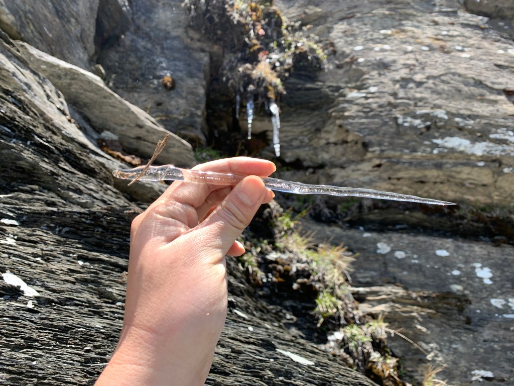從樹林中出來迎面是碎石坡,旁邊的落石沿著山壁呈現白色細縫,高山杜鵑也生氣勃勃的穿插其中。通過這一片碎石坡後來到了往稜線的岔路口,這裡我們取右,會經過一個崩壁,岩石塊在山坡上錯落著。這裡雖然地勢比較裸露,只要注意腳下的路徑,並且小心通行即可。山壁上流下來的水已成為條條的冰柱,可見晚上非常的冷。最後上稜線之前的岩石陡坡真的是最陡的一段,遠看那個坡根本就是山羊在走的坡度啊! 好不容易來到了稜線上,那綿延的山脊就出現在眼前好令人感動。
