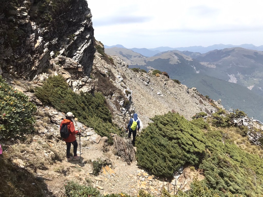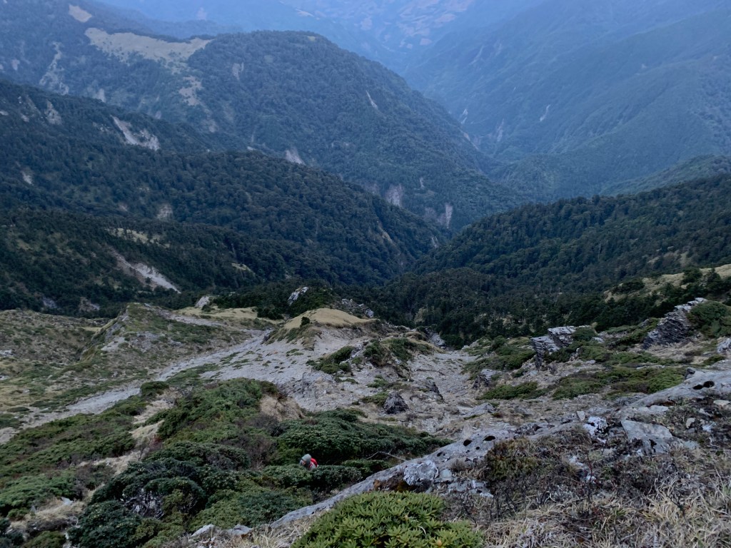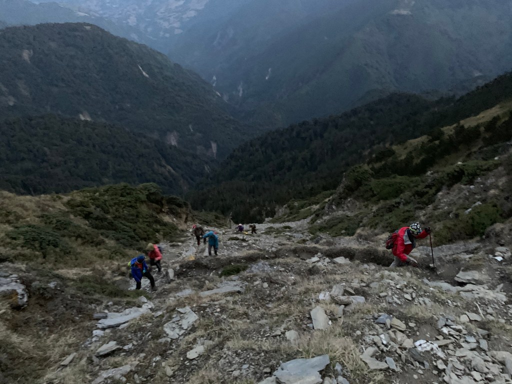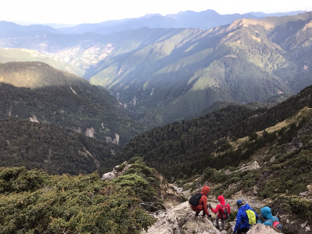 成功山屋可以容納約34個床位,周圍也有人紮營但腹地不是很大。我們要到稜線上紮營,所以必須重裝迎接等下一路的陡上。從成功山屋到稜線這一段我覺得是這一趟最辛苦的一段,各種陡上沒有在跟你客氣。離開成功山屋我們穿越堆疊石頭的溪溝,跟隨布條的引導來到上坡路段,近乎90度的岩塊就這樣無盡向上。好在有拉繩和鐵梯的輔助,用盡四肢的力量努力往上爬。看到樹林側邊的展望,站在這看著山景大口喘氣。