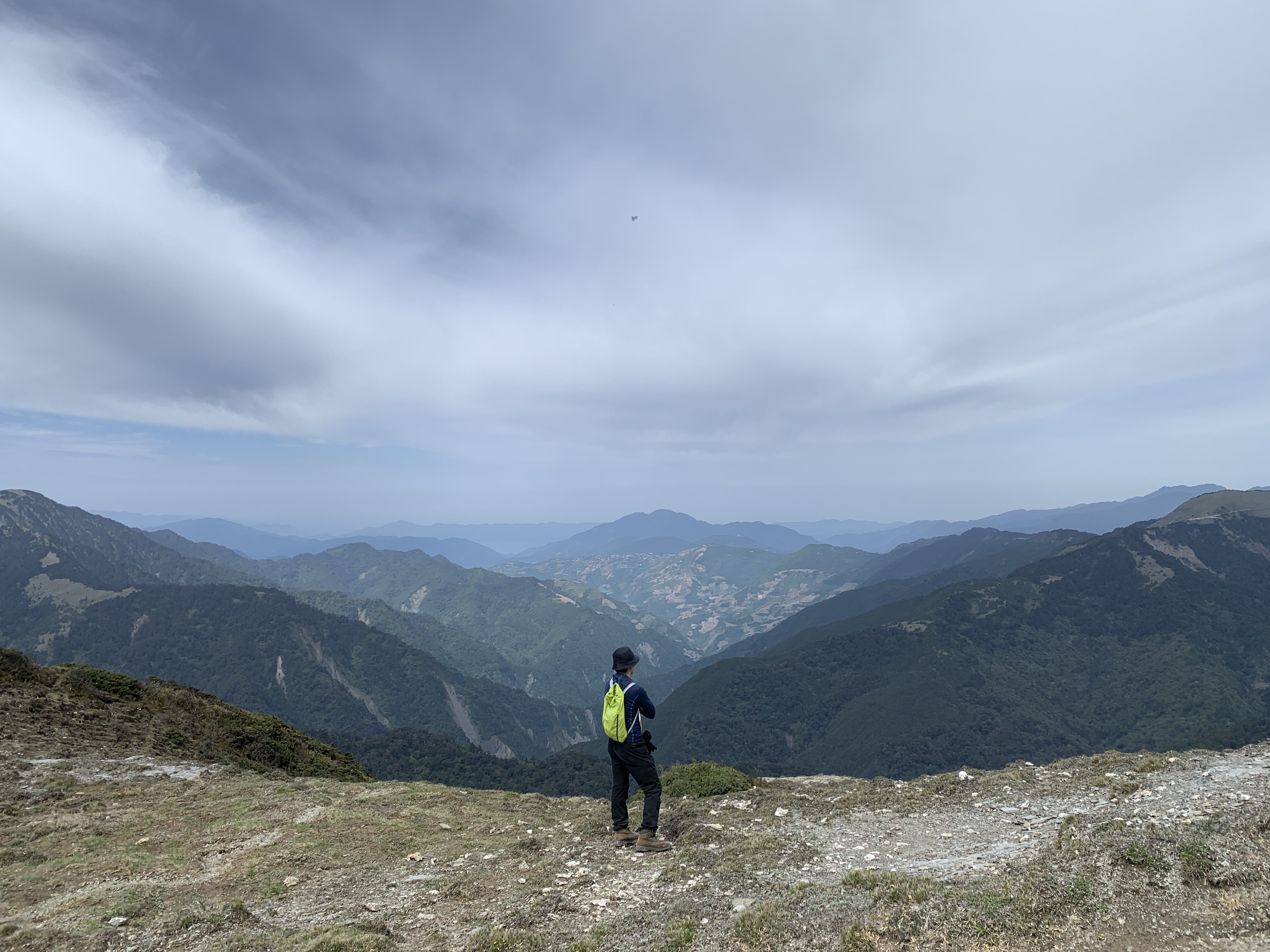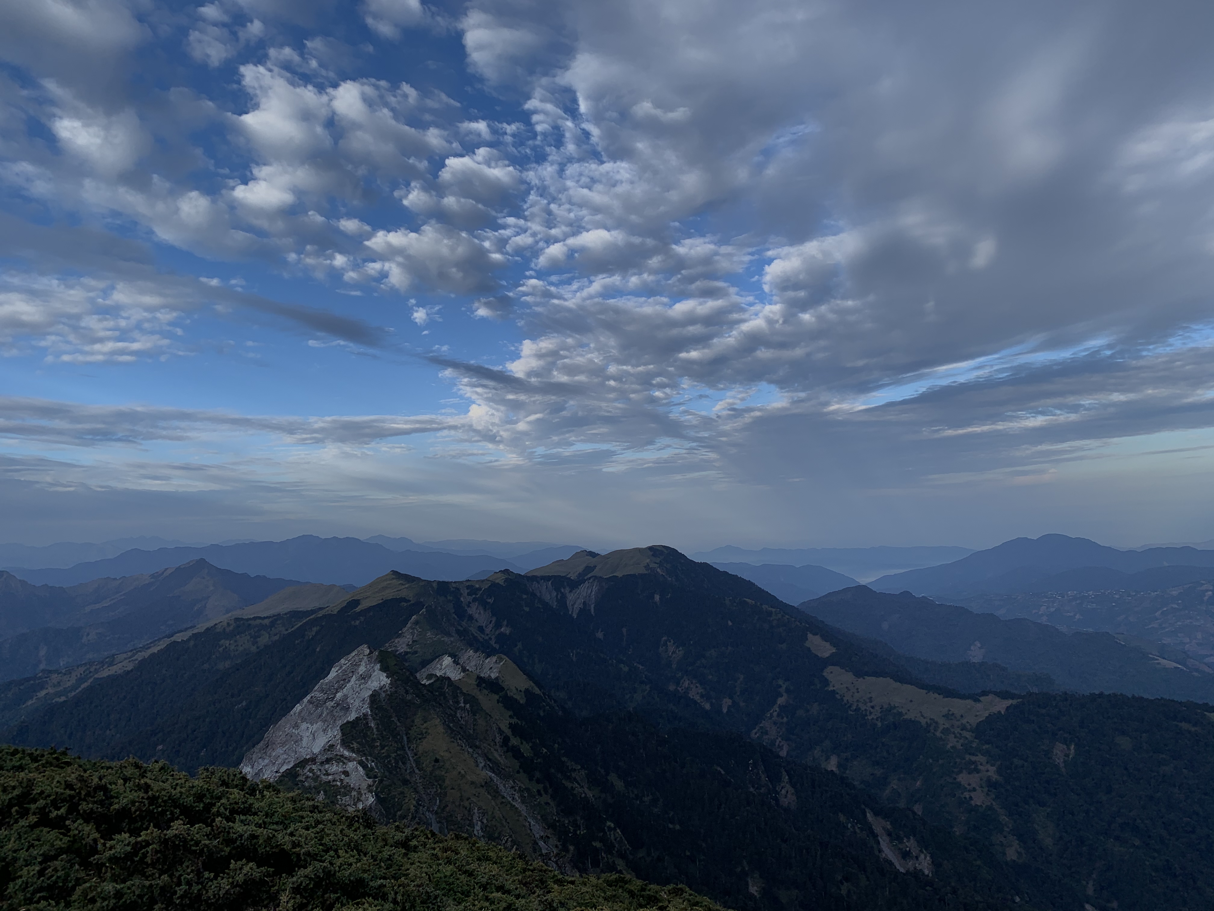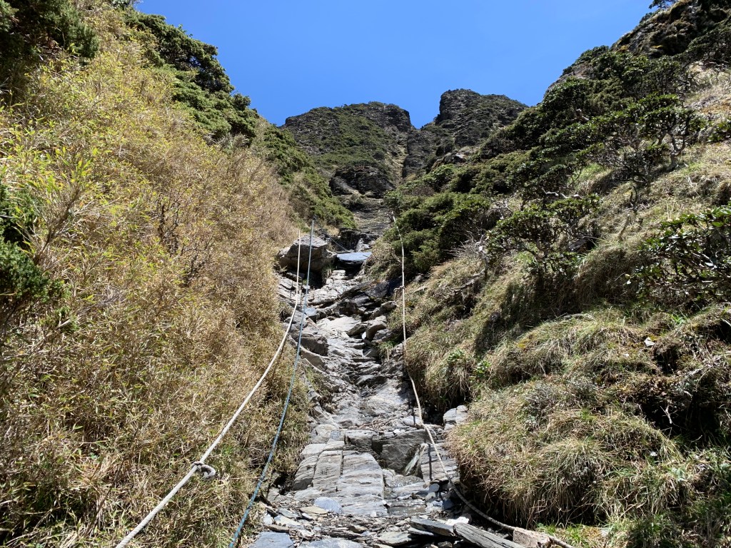 成功山屋可以容納約34個床位,周圍也有人紮營但腹地不是很大。我們要到稜線上紮營,所以必須重裝迎接等下一路的陡上。從成功山屋到稜線這一段我覺得是這一趟最辛苦的一段,各種陡上沒有在跟你客氣。離開成功山屋我們穿越堆疊石頭的溪溝,跟隨布條的引導來到上坡路段,近乎90度的岩塊就這樣無盡向上。好在有拉繩和鐵梯的輔助,用盡四肢的力量努力往上爬。看到樹林側邊的展望,站在這看著山景大口喘氣。