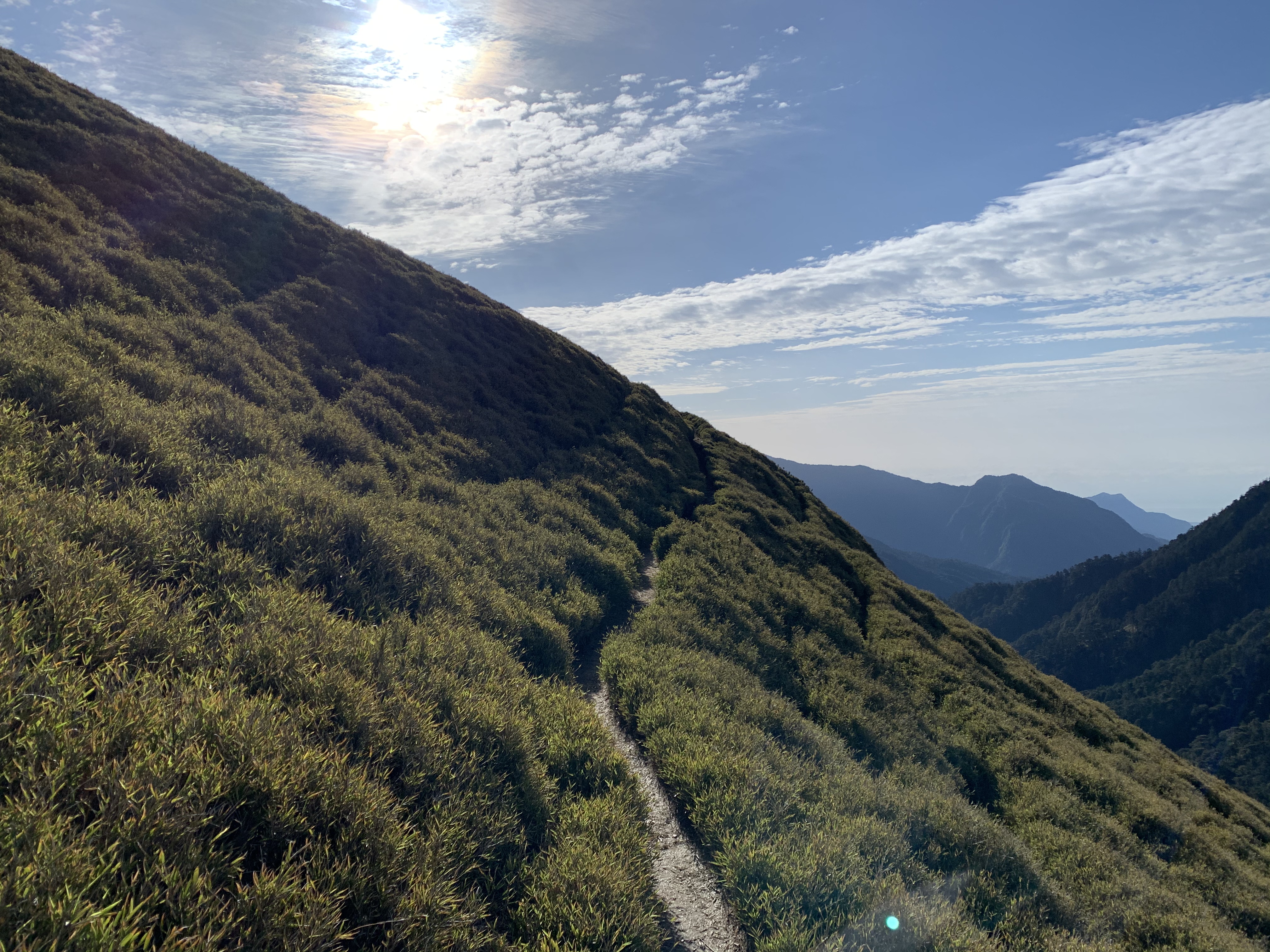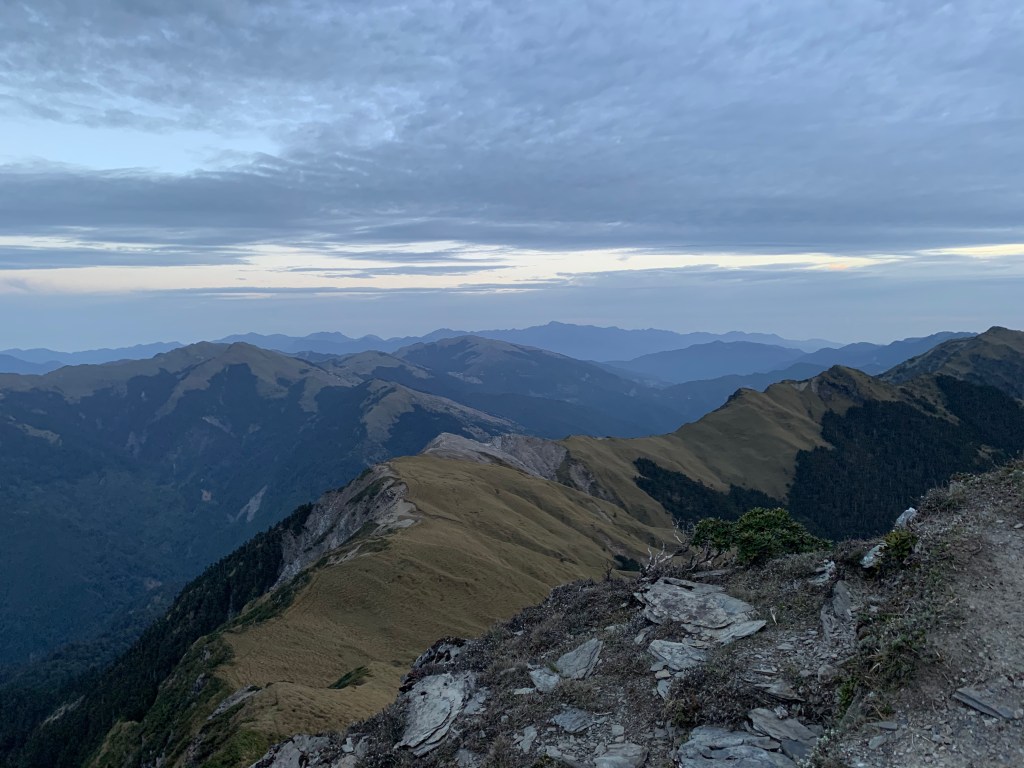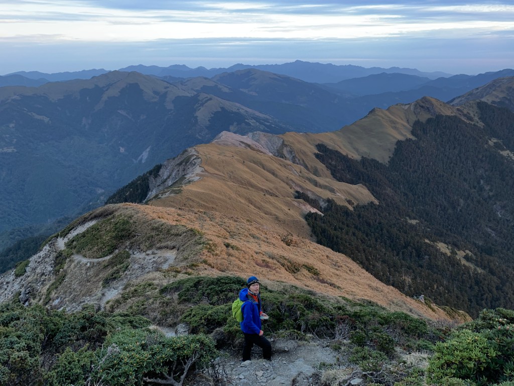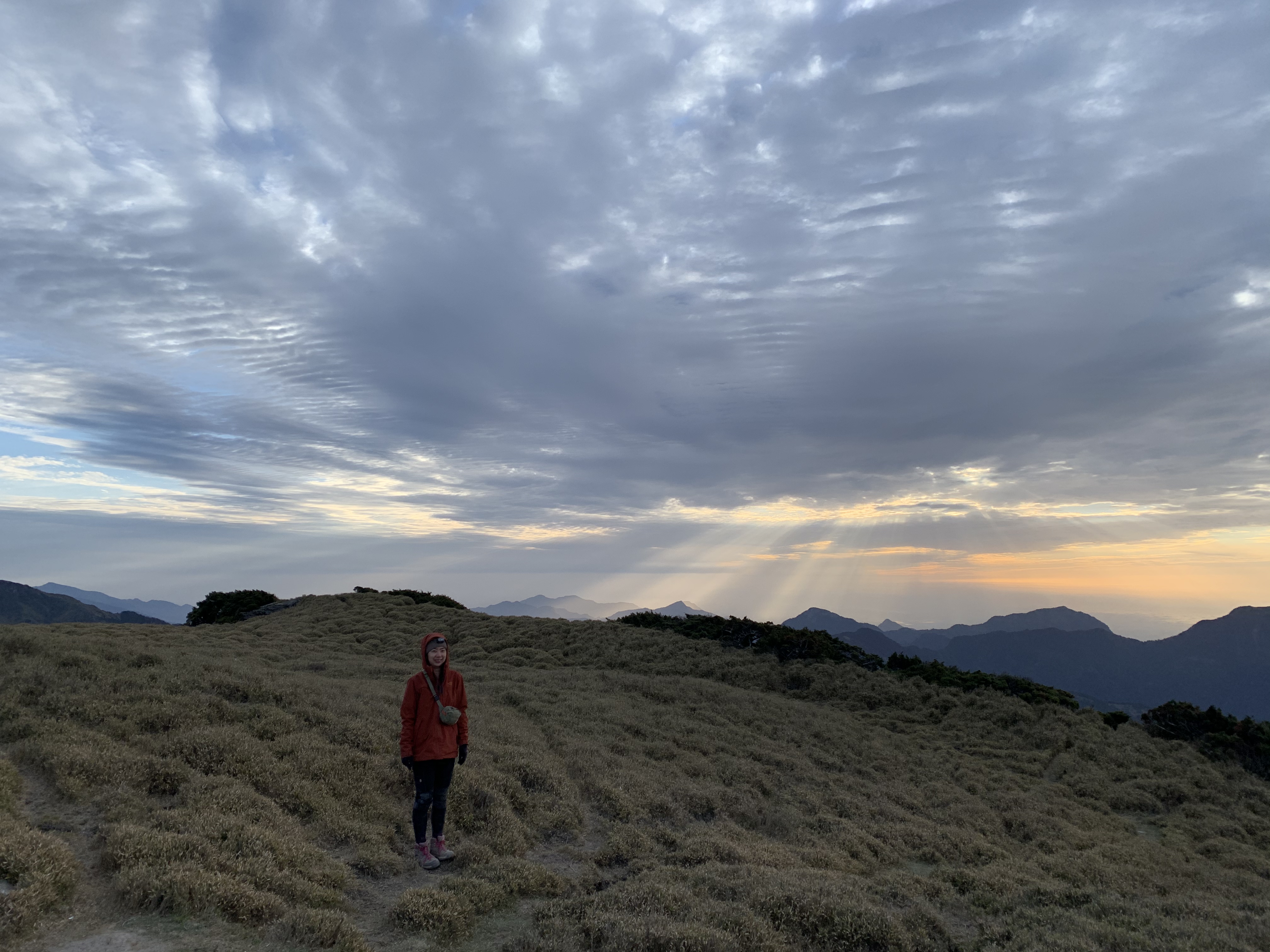 在登頂時太陽從東方緩緩升起,天空轉亮時,站在登頂前的山壁回望來時路,連綿的稜線是如此的壯闊,深綠的山谷相間。奇萊連峰山壁的肌理清晰可見,那灰白色如雪的層次從山頂滑落,猶如綠茶口味冰淇淋上灑滿了白色糖霜。從制高點可以清楚看到往奇萊主峰的山左邊是金黃草原,右邊是峭壁懸崖。太陽從朦朧的雲層後散出橘黃色的光芒,我抵達了靜謐的奇萊主峰山頂。