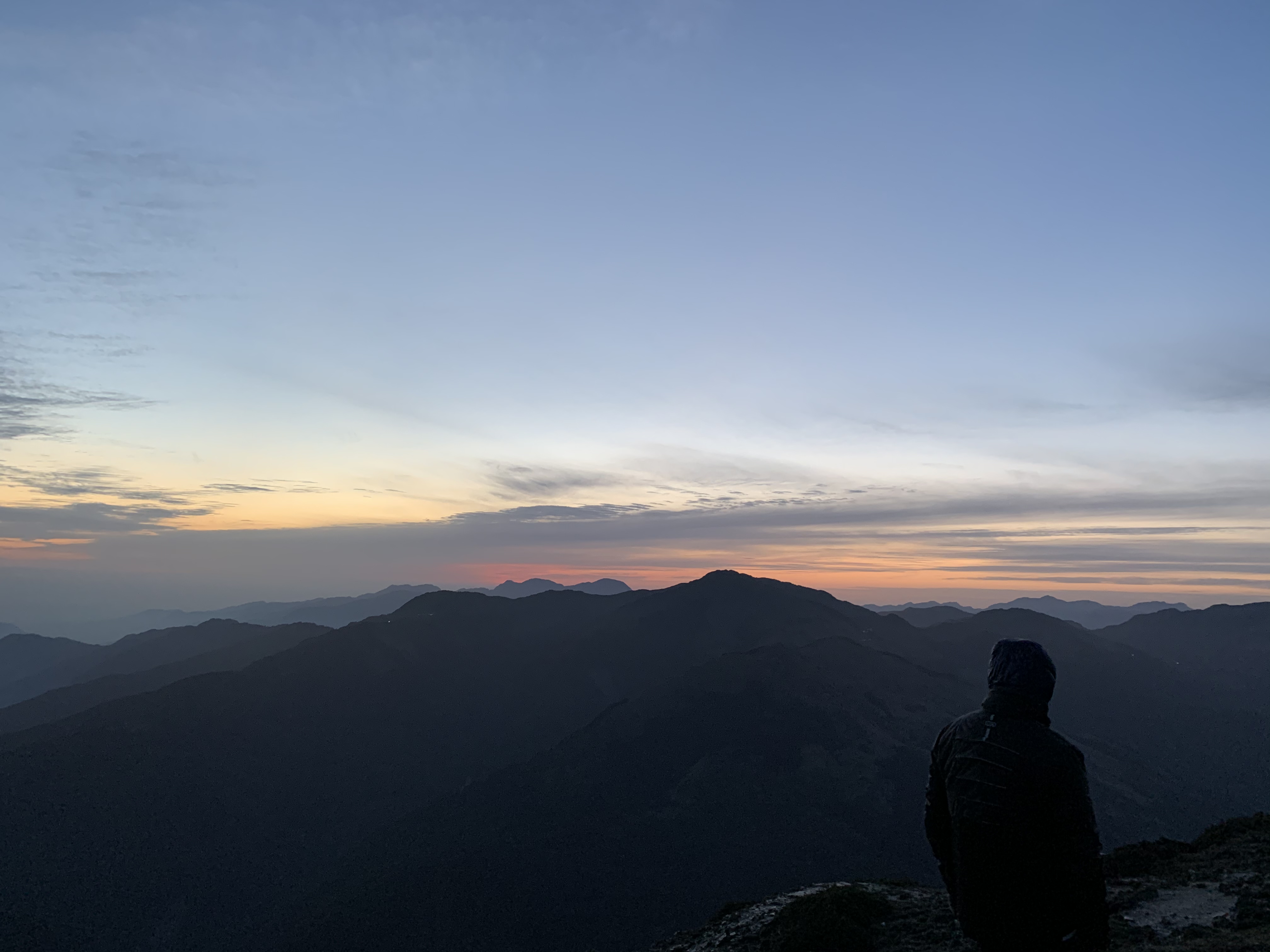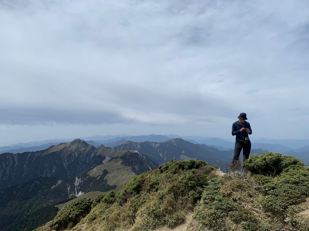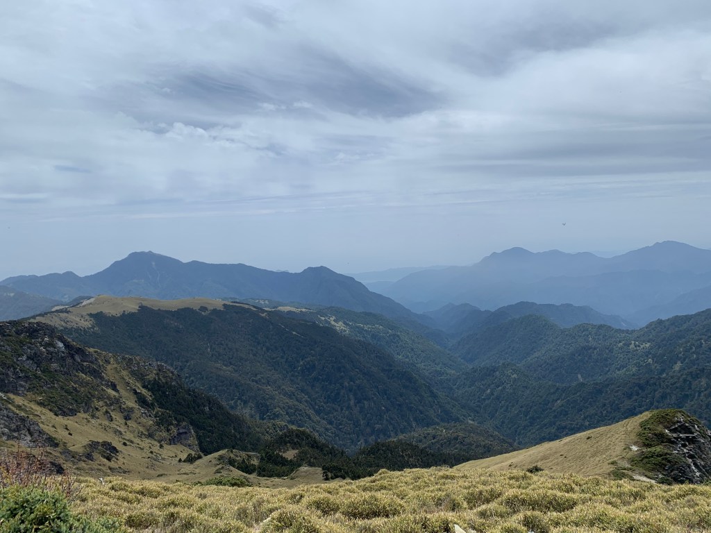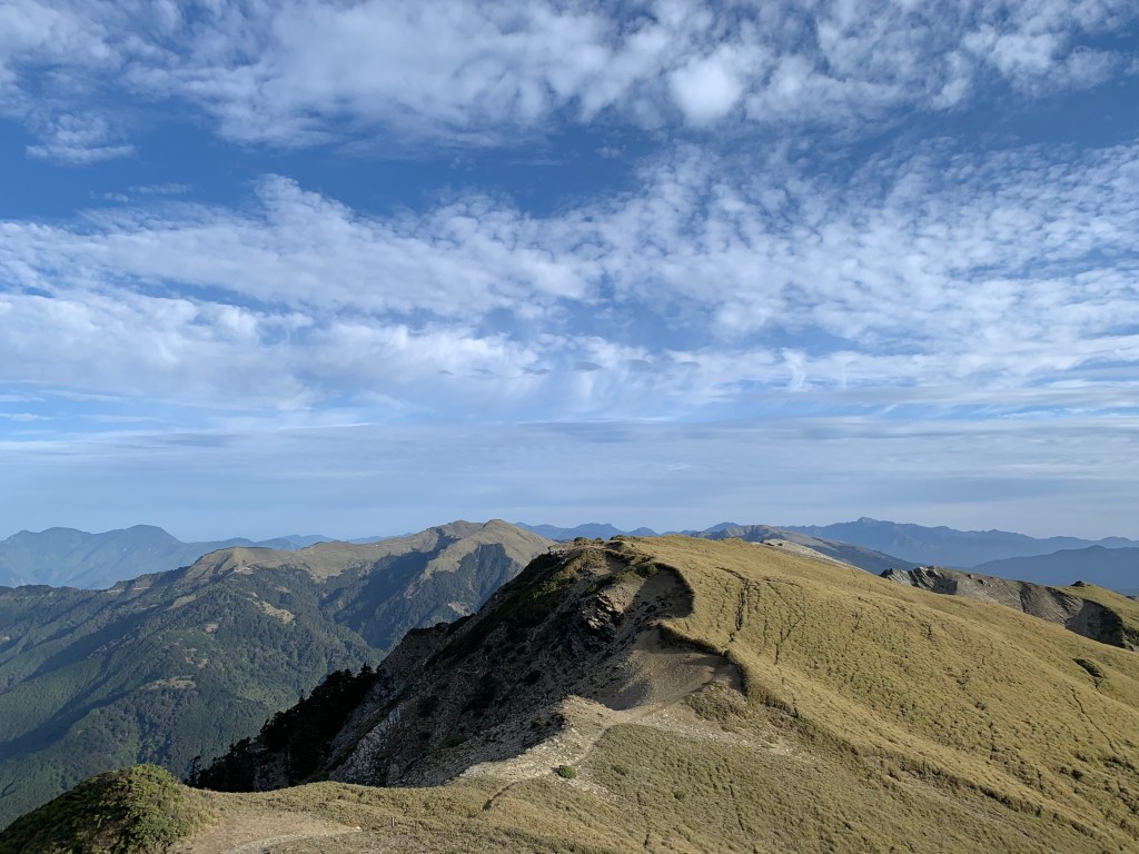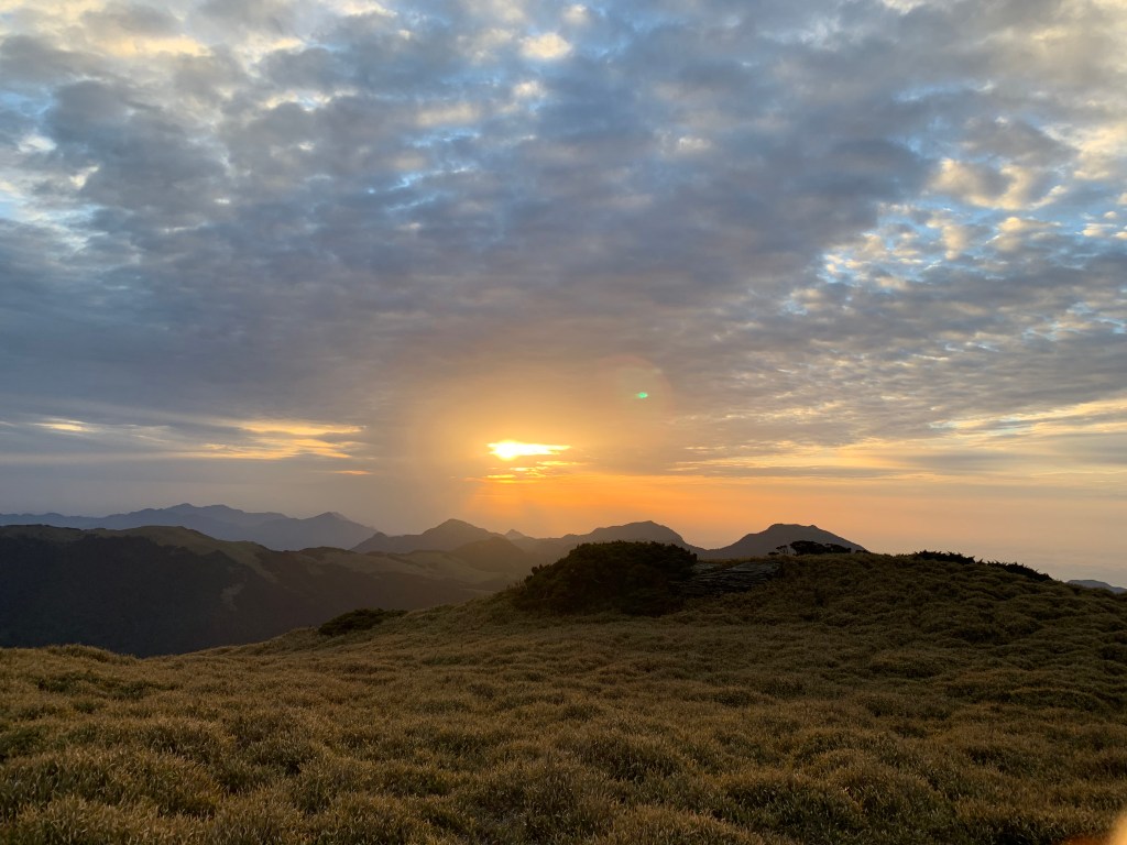 在登頂時太陽從東方緩緩升起,天空轉亮時,站在登頂前的山壁回望來時路,連綿的稜線是如此的壯闊,深綠的山谷相間。奇萊連峰山壁的肌理清晰可見,那灰白色如雪的層次從山頂滑落,猶如綠茶口味冰淇淋上灑滿了白色糖霜。從制高點可以清楚看到往奇萊主峰的山左邊是金黃草原,右邊是峭壁懸崖。太陽從朦朧的雲層後散出橘黃色的光芒,我抵達了靜謐的奇萊主峰山頂。