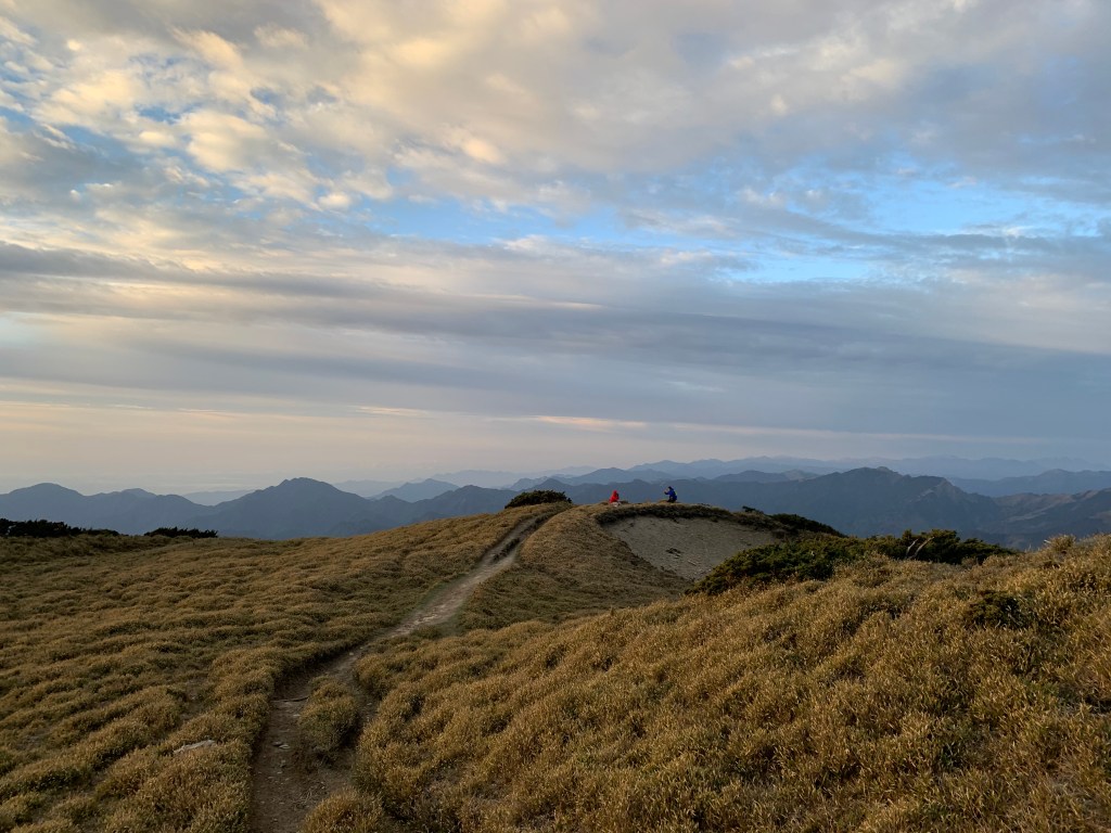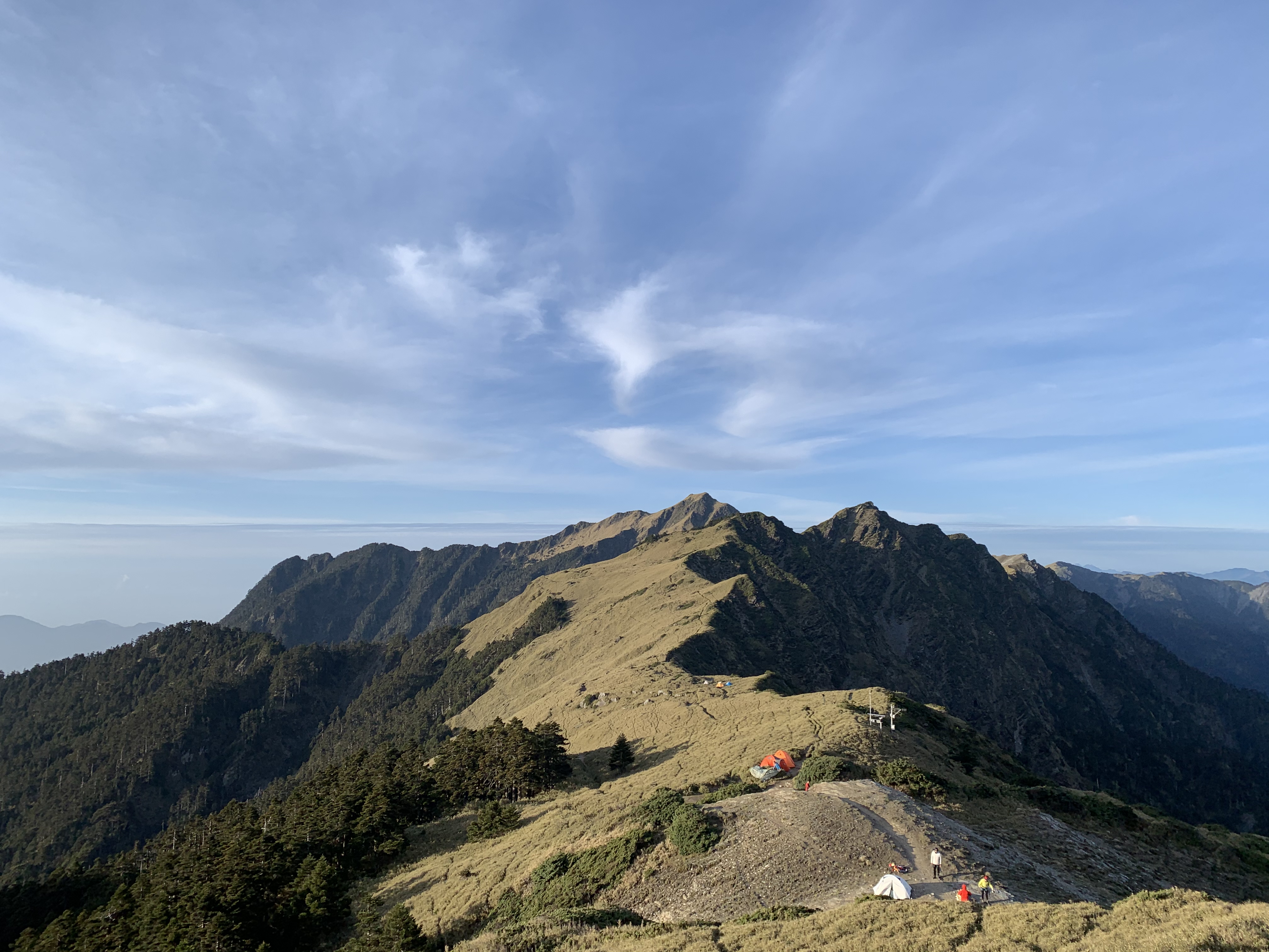 稜線上已經有好幾個帳篷,找了一個比較適合的腹地後在陣陣的冷風下將帳篷搭牢。我們抵達稜線時才下午一點左右,我們悠閒的吃了泡麵,有一整天的時間可以在這裡耍廢。雖然要重裝上最辛苦的一段,不過也相當值得,可以在有著全方位展望的稜線上看一日的景致轉換。接近黃昏時,我們這個區塊也充滿了營帳,日落的漸層光芒染橘了天空的雲,層層的薄雲在下方翻騰著,我就像站在漂浮的天空之城上。這一夜外面的風呼呼的吹著,隱約聽到水鹿在深夜裡的叫聲。