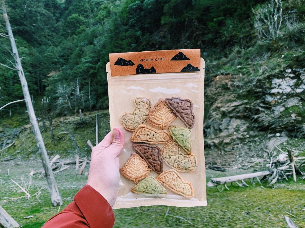 之前走巒安堂膝蓋受傷後,在休養期間設計出這款山型餅乾,描繪了玉山北峰、雪山主峰、大小霸、中央尖山以及一個蕨類的輪廓。各別的口味為台灣抹茶(香菜)、香料起士、伯爵紅茶、海鹽巧克力和清香檸檬,後來也帶上去小觀山神池享用,用烤網加熱後餅乾溫溫的感覺在山上吃起來相當療癒! 山型餅乾也有接受預訂唷,可以在家裡看著戶外電影吃著餅乾來場山型下午茶吧~