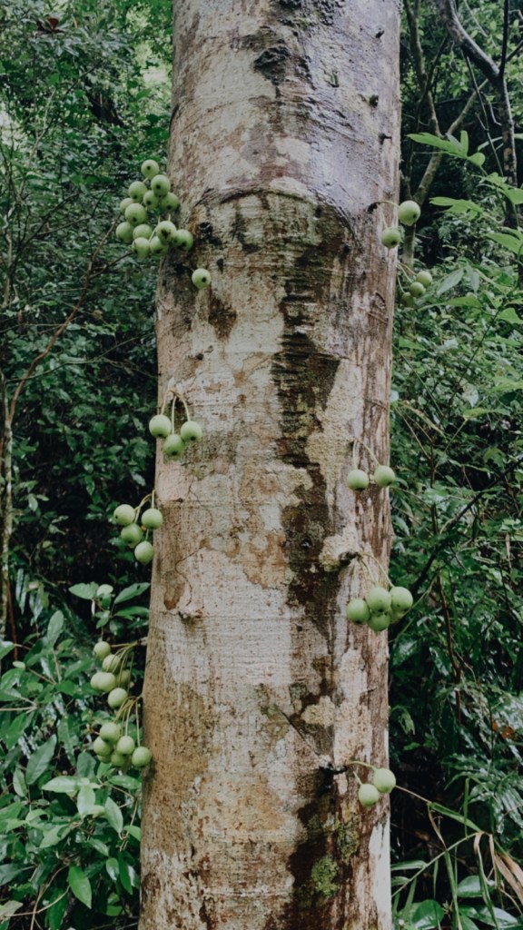 這次我還認識了一個神奇的樹木叫幹花榕,當時在地面上看到一顆顆青綠色的果實,好奇這些果實從哪裡來的,後來才發現他們竟然長在粗枝上,而且他們長得像果實卻是花,植物真的是很神奇。裡面有許多植物都有標示及介紹,頗具教育的意義。在看到瀑布之前就聽到水落下轟隆隆的聲音,雙流瀑布曾被票選台灣第二美的瀑布,在平台上看著水直衝而下有種沁涼感,空氣中瀰漫著水霧。返程時我們走瀑布步道,會經過踩石的涉水區超好玩,我看小孩走這裡的時候都很興奮,滾滾的水從腳邊流過。這裡真的是老少咸宜的好地方,簡單的路線就可以享受山林的氣氛。