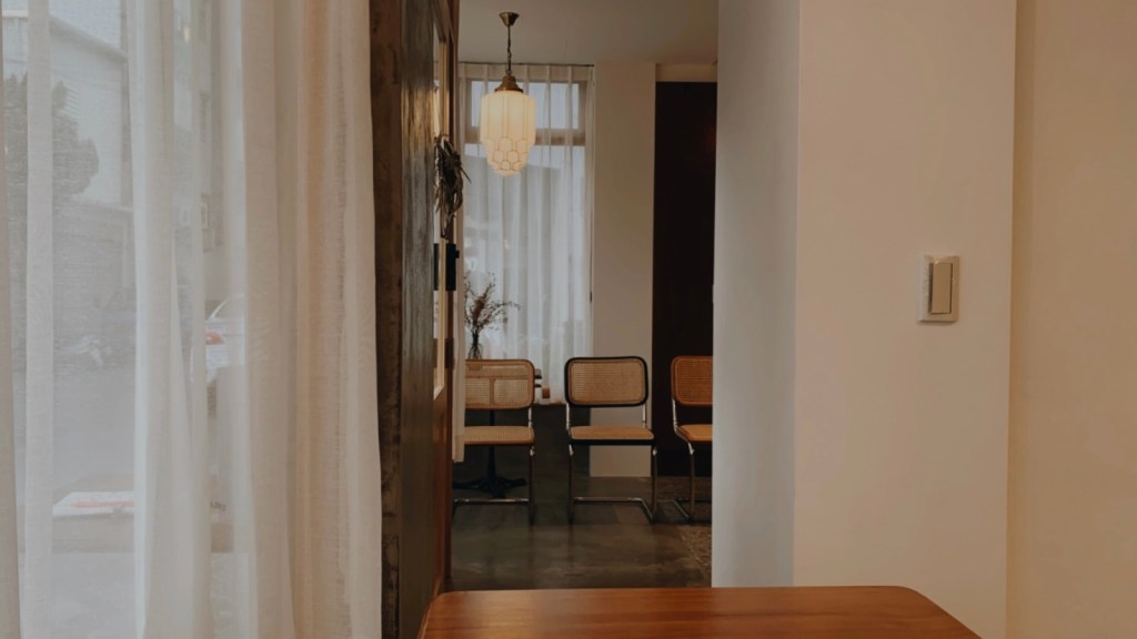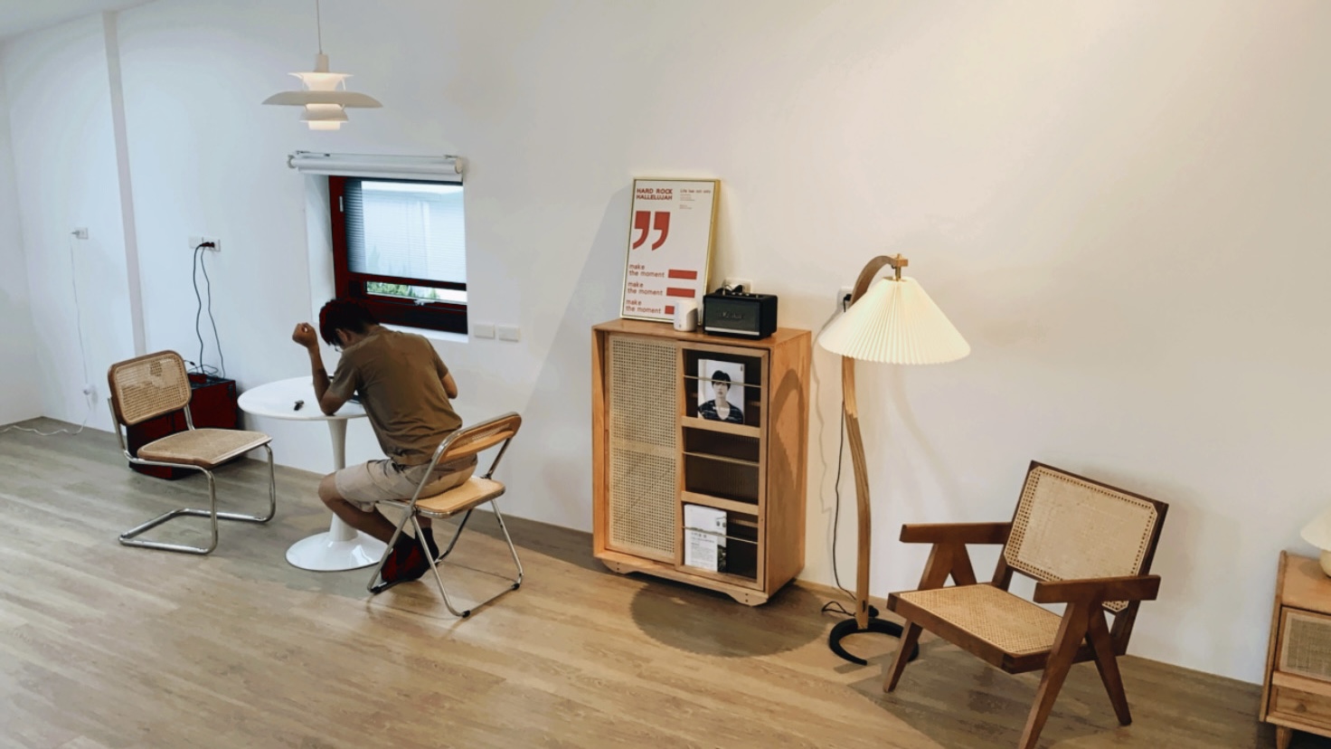 到了三樓真的是令人驚艷,有著開闊的前庭和玻璃的天景,擁有一個超美的入口,就彷彿擁有一個設計感的家。房間的空間有夠大的,裡面的家居選品都別具用心,每一個角落都可以拍好幾張照片。我朋友(老闆)細心的跟我們解說房間裡的設備,有Marshall的音響,還有投影機、香氛機可以使用,哪有民宿這麼有品味,我看到目前為止真的是只有他了!我們整頓好東西後下樓吃下午茶,入住就含一套下午茶,每天老闆娘都會製作不同的甜點menu可供選擇,還有他們共同調製的各類飲品,在這個充滿設計感的空間享用下午茶真的是太幸福了!後面還保有他們之前的特色-書籍區,可以讓來這裡的人不要只是滑手機,而可以好好的enjoy台東的慢活。