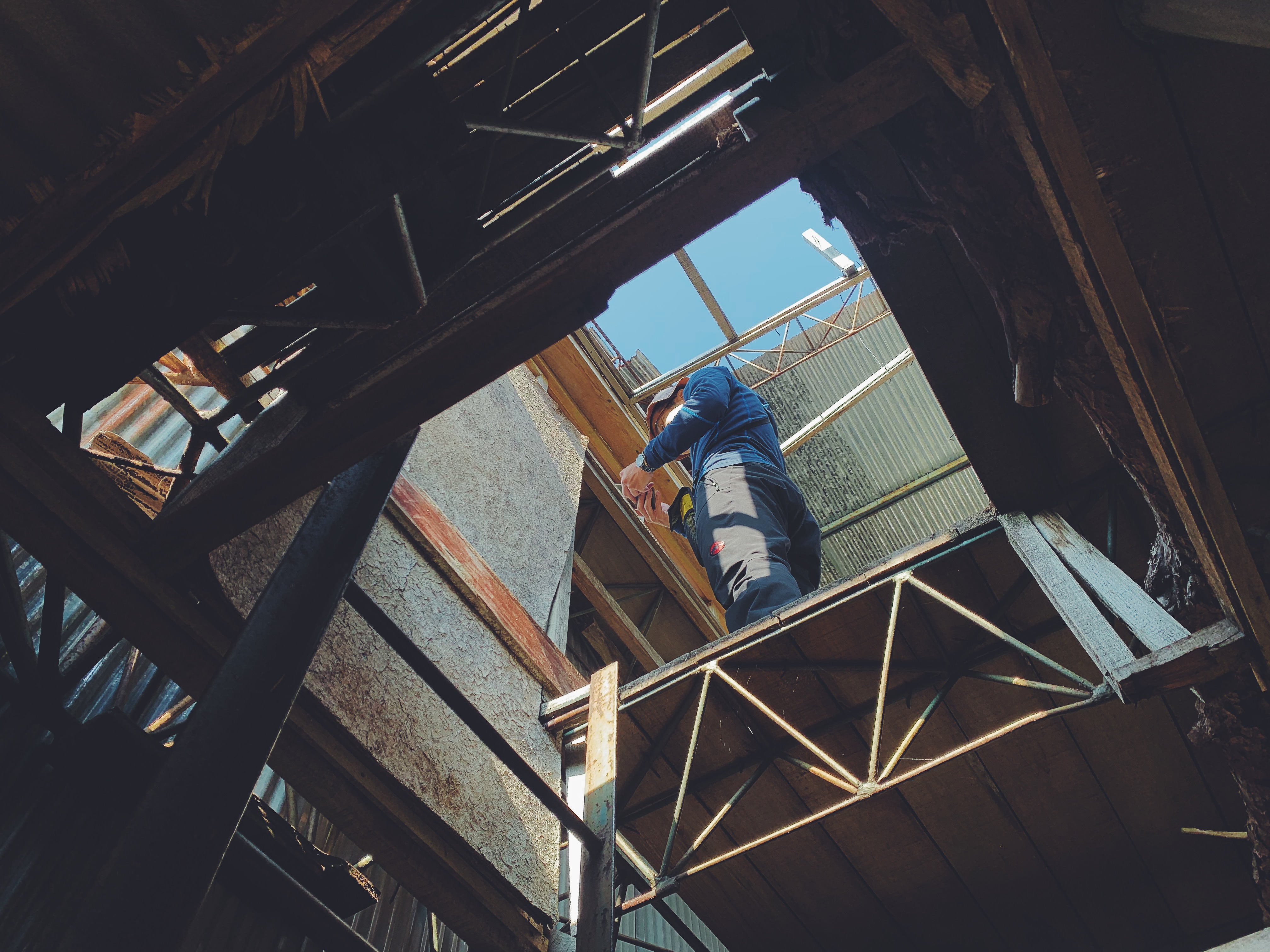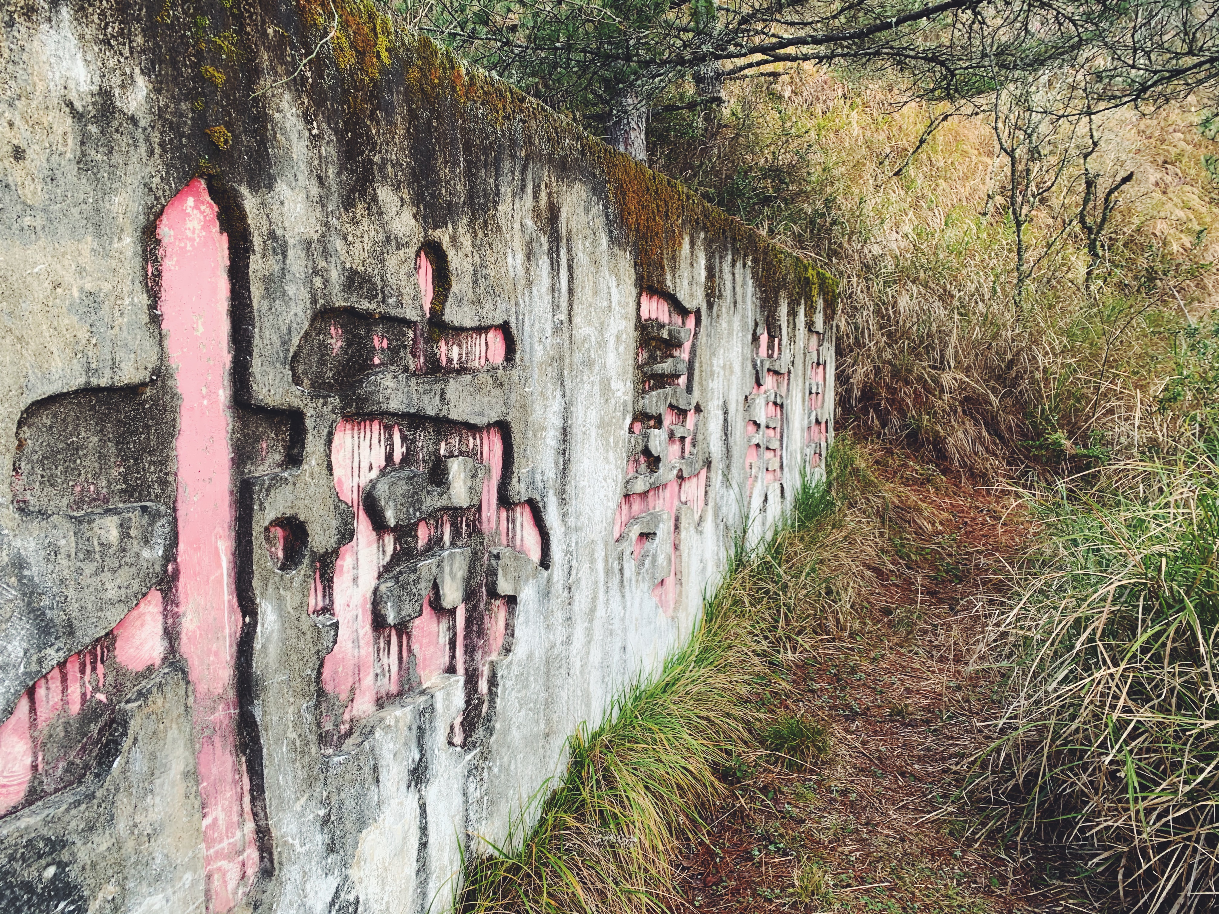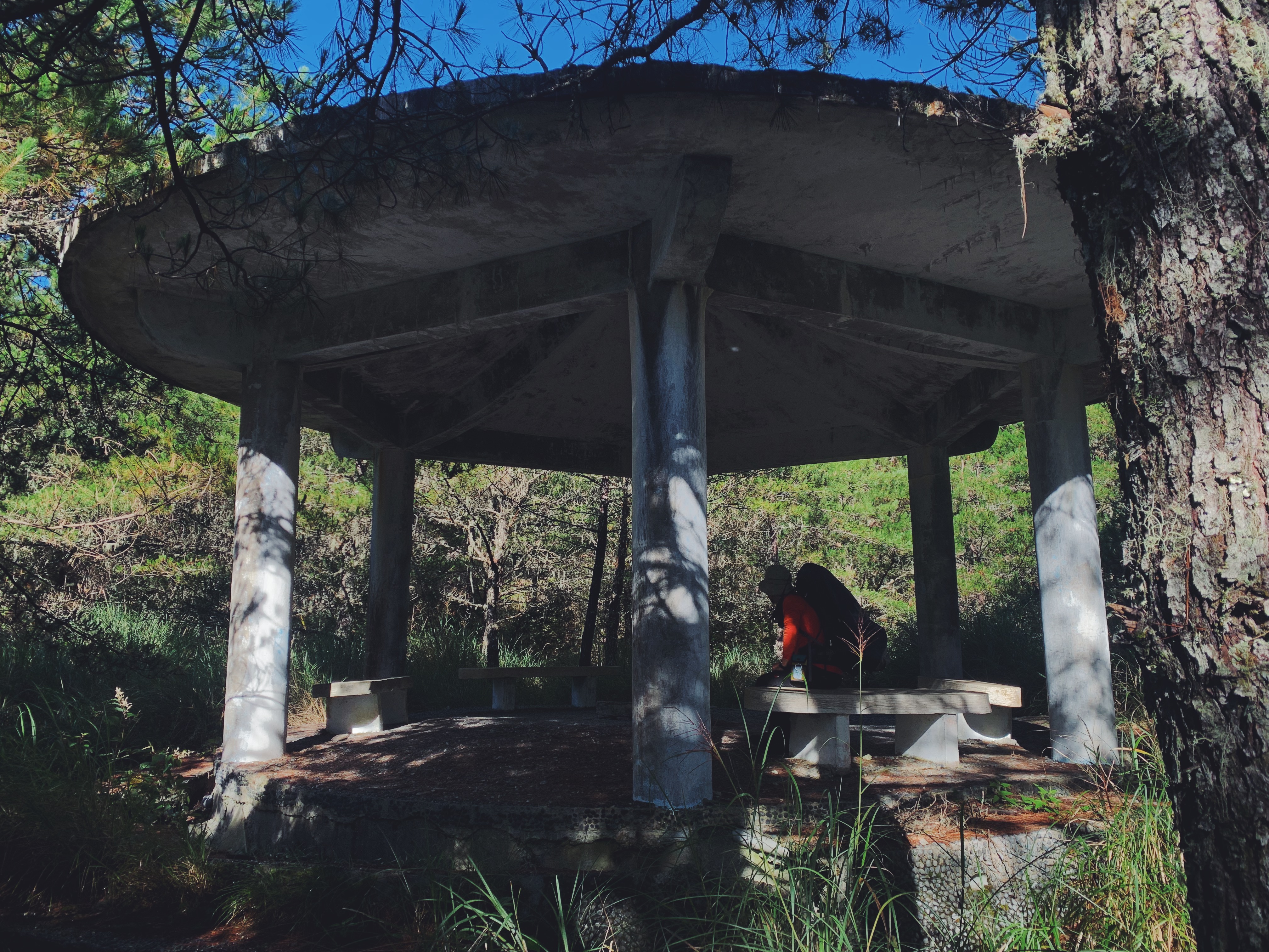 前一晚我們在登山口旁的廢棄小涼亭扎營,原本是想要在比較寬闊的開路紀念亭,但晚上的時候太暗沒有看到往紀念亭的叉路。早上六點天空染上一片清澈的藍色,在收拾裝備時也看到兩三隊要前往此路線的山友,而上次228時一組人都沒遇到,可能這個期間此路線大家也漸漸熟知了。此路線的登山口是大禹嶺隧道口附近的民宅的鐵鏽樓梯往上走,首先會看到「禹嶺尋梅」的大石碑,這個石碑是由當時的司法院長謝冠生所題。不知道是不是因為經過一段疫情期間少有人來,連樓梯的草也變得非常茂密,突然覺得有點擔憂等下要游的草會有多高。在殘破的階梯往上走後在一叉路是往右邊走,可以往左去看一下廢棄的中橫開路紀念碑涼亭,我看到其他人以前的照片中,原本涼亭內還有一個由于右任先生撰寫的紀念碑,不過這幾趟已經沒有看到了。
