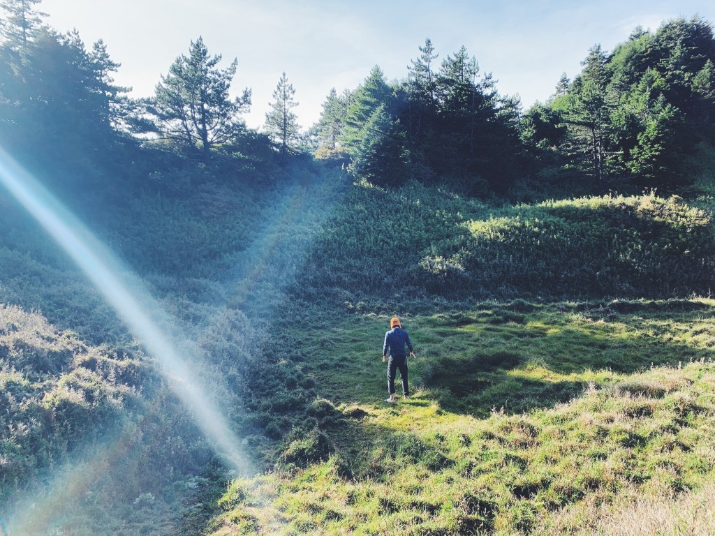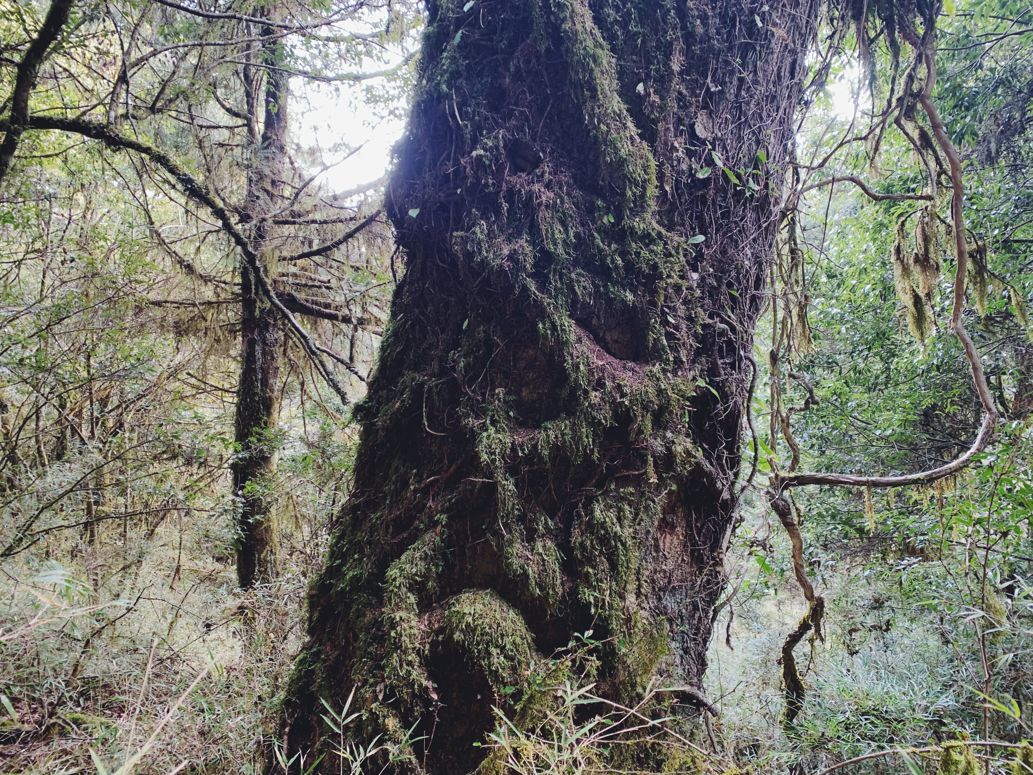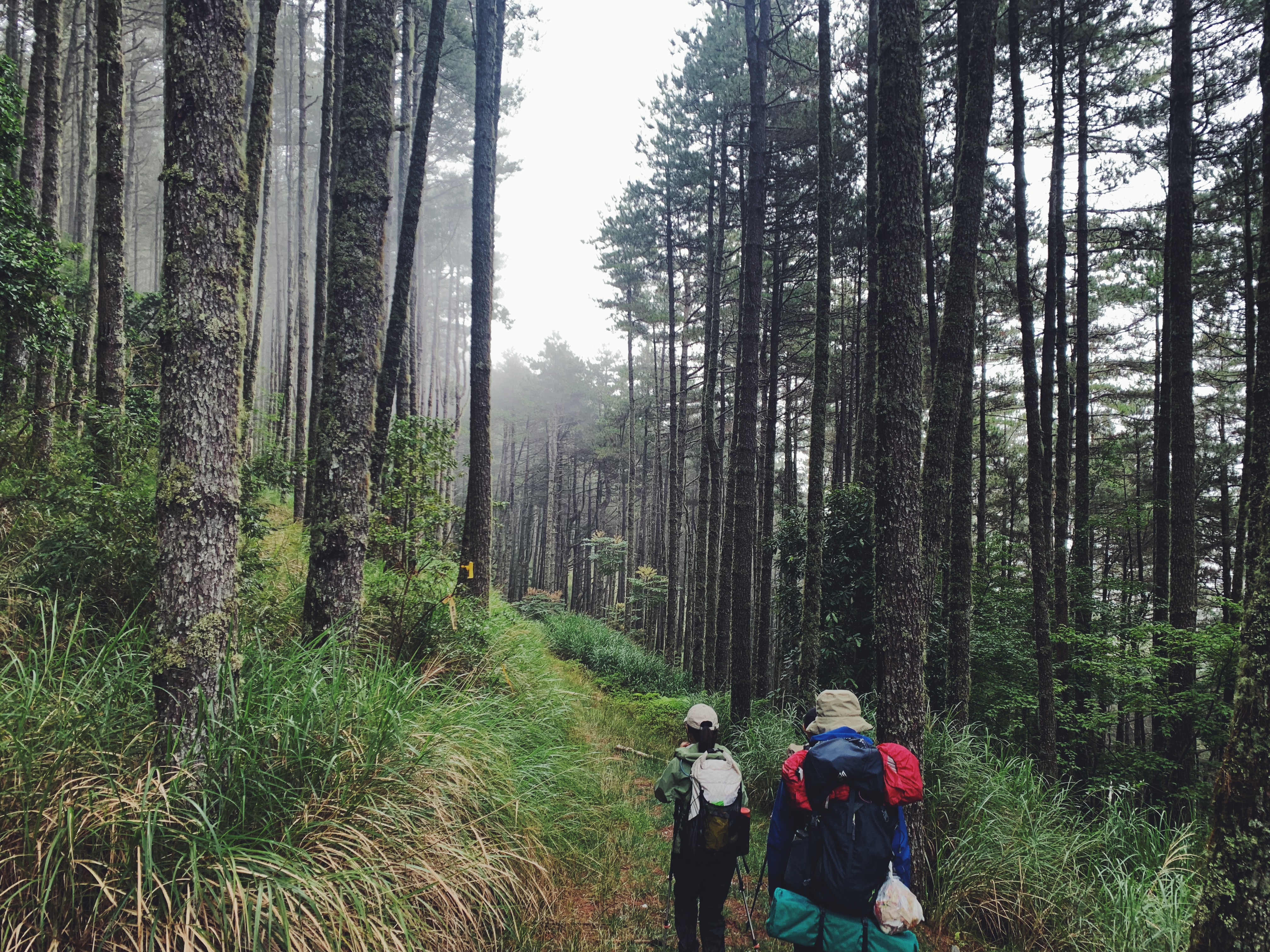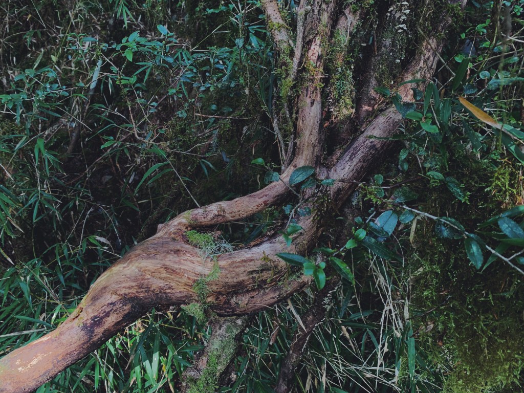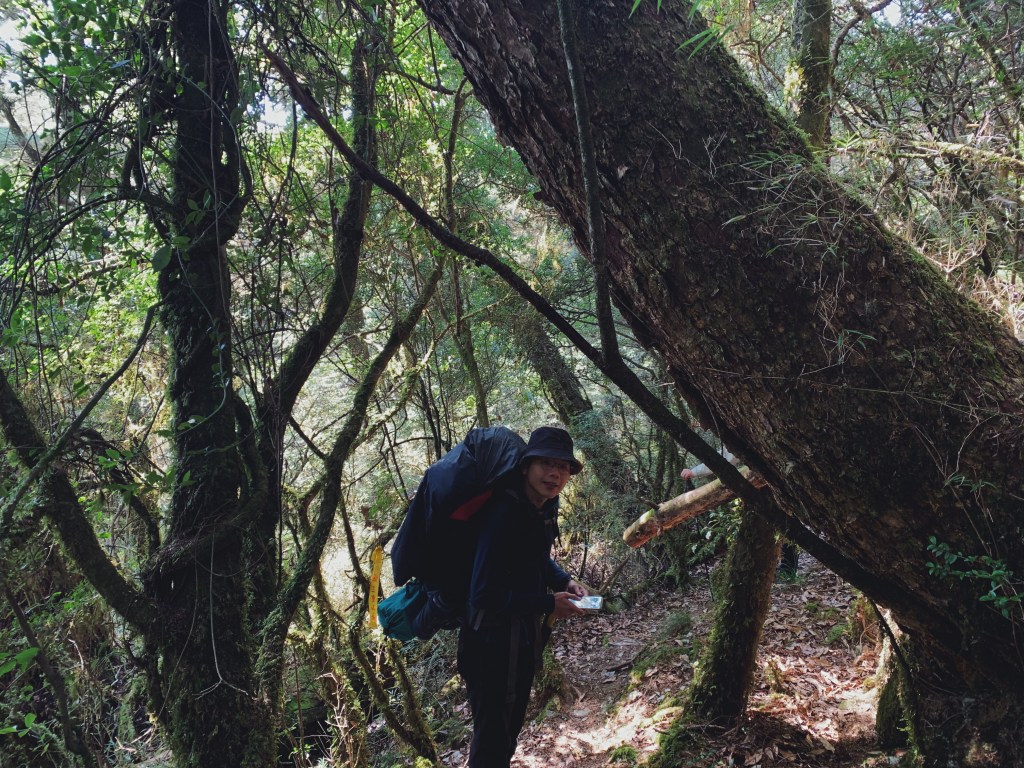 茂密的樹被毛絨絨的植披所包覆,樹木的粗壯的枝條蜿蜒著,大片的菇依著枯木生長,在辛苦的上切路段之前好好享受這個悠閒的氛圍。接著開始在草叢內上切,務必要記得戴手套,這裏有很多咬人貓和刺柏等,走路的同時要不停的撥前往的草,沒戴手套可能會崩潰。另外這個路段缺水,所以比較辛苦的部分也是因為要背足夠的水。上到稜線後開始會走上上下下的路段,雲霧也漸漸的起來,被霧包圍的森林都有股抑鬱的氛圍。一路上看到各種類型和顏色的菇,比上次多更多了,邊走邊看著這些療癒的菇舒緩心情。