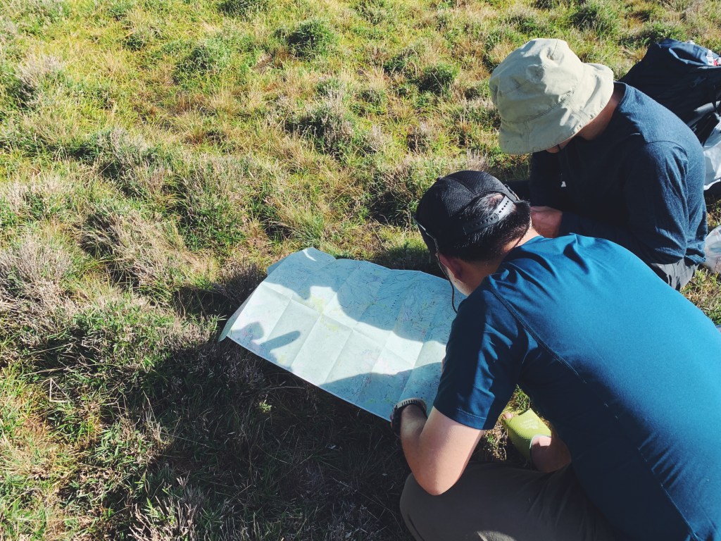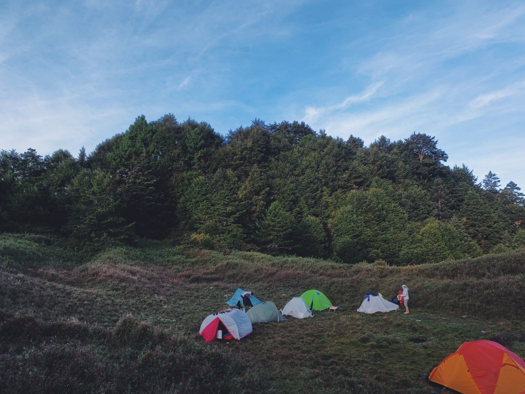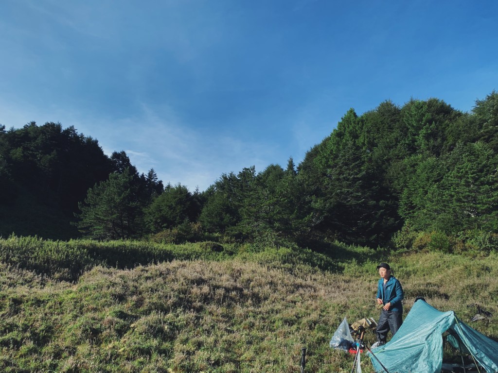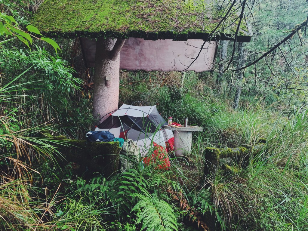 這一段下切必須一路切到乾溪溝,這裡完全沒有布條,應該是說可能原本有布條掉下來還有太茂密了根本也看不清楚。下到溪溝後後要開始上切,這時候我們看到一個布條就會很興奮,這裡根本就沒有路徑可言,手不停撥著茂密的箭竹奮力往上。而這時候開始下起雨了,溪溝濕溜溜的,有點狼狽的在雨中和濕搭搭的草叢中想辦法走到上面。走在前面的朋友在前方喊著”到了!”,到了上方終於一片寬廣的箭竹草皮映入眼簾。但因為雨越下越大,抵達的當下沒有很嗨的感覺,只有想著趕快把帳篷搭好,這場雨也下了許久。鄰帳因為雨下太大剛好搭在地勢比較低的地方,聽到他們帳篷積水的慘狀。