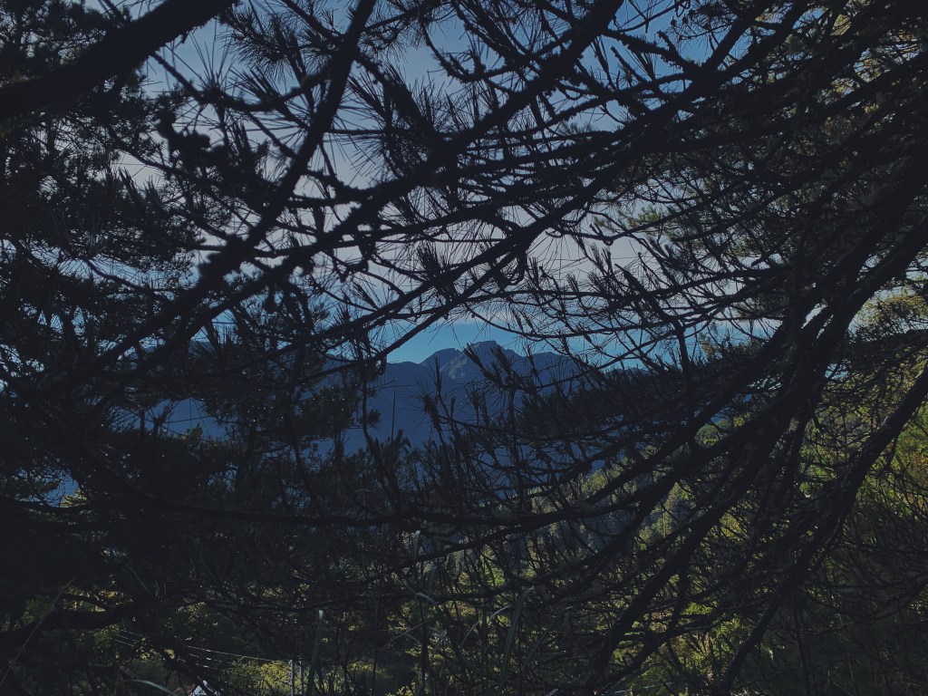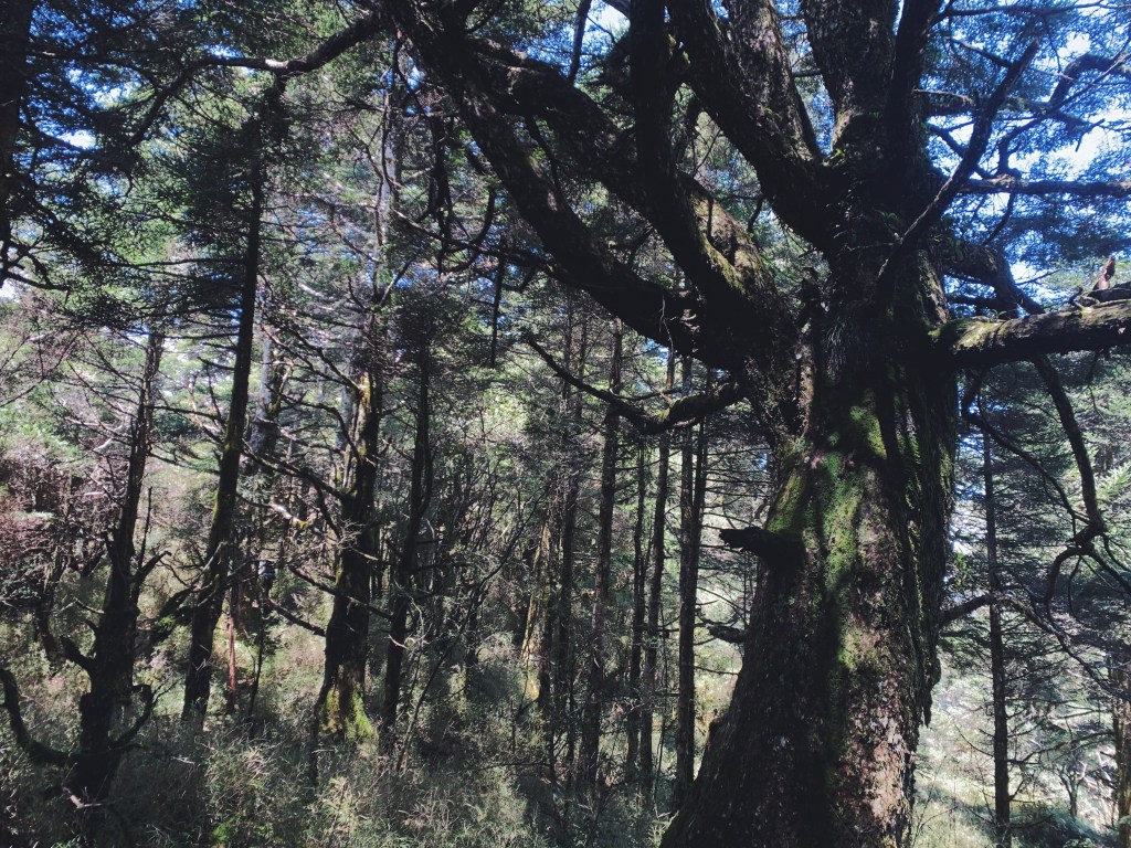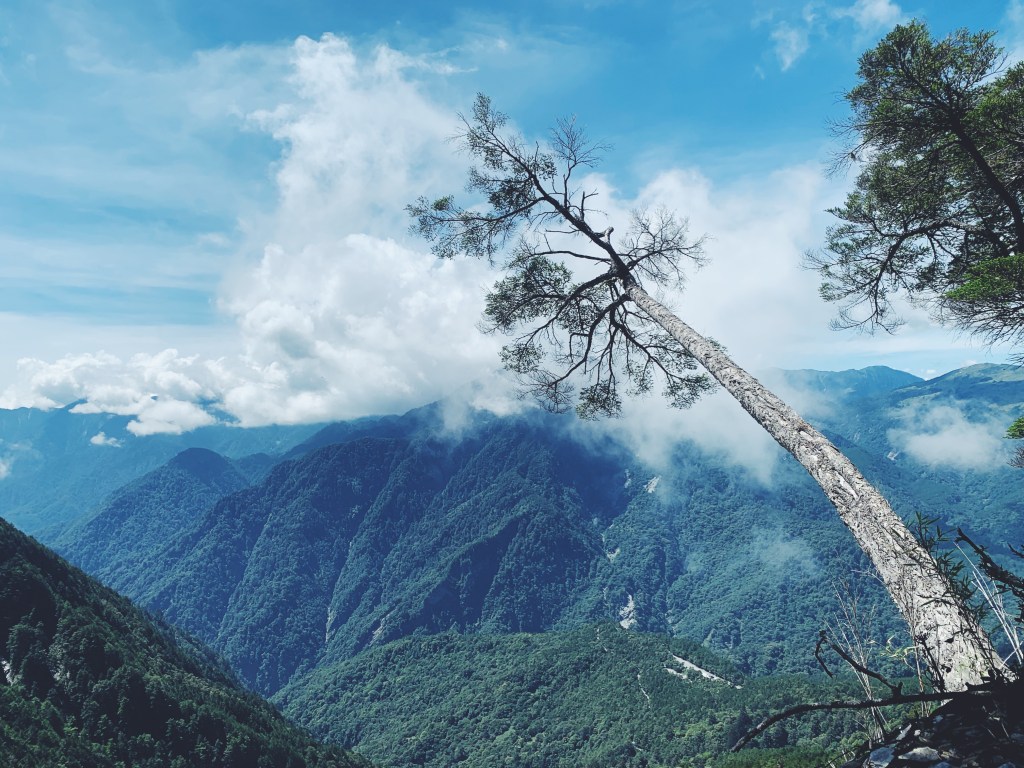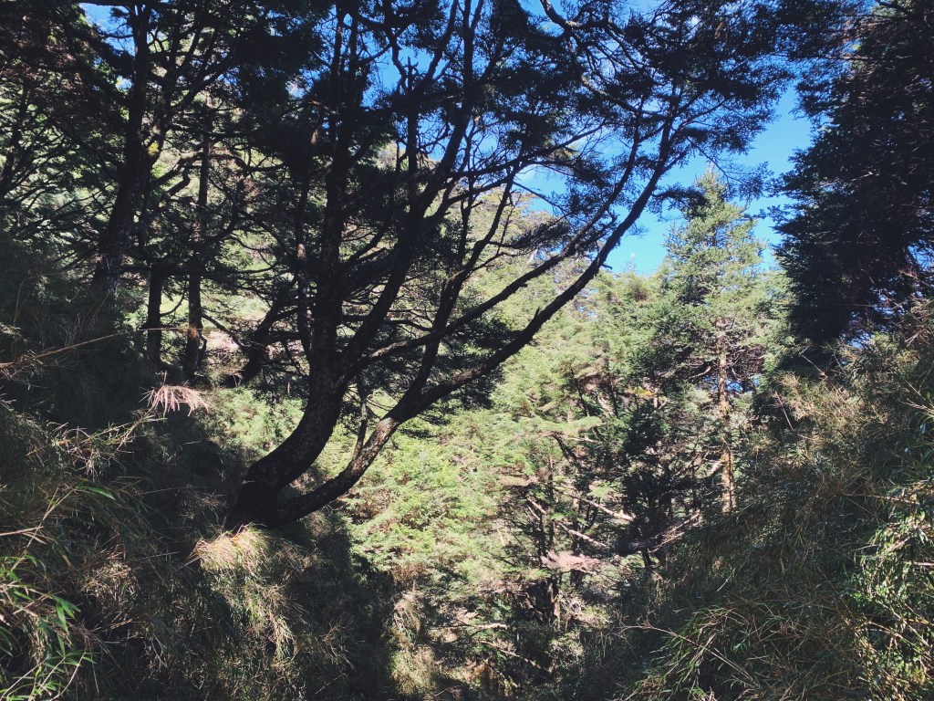 漂浮的雲朵冉冉升起,在藍空的畫布上渲染出白色的潑畫,在這個天氣下真令人想要持續耍廢,不過得還是面對等下的回程。收拾好裝備,穿好雨褲去面對濕淋淋的箭竹洗刷刷之旅。經過昨天的大雨溪溝變得更濕了,因為箭竹很密要看到腳下的路況也真的困難,每走一步都要大力撥開前方的草才能確定走下一步,不然一不小心就會有落差就會跌倒。到乾溪溝後要上切時這一段也會容易迷路,看到另一隊的大學生就誤走到雙塔上方了。在一番奮戰後終於回到雙塔旁,今天可以從這裡看到廣闊的展望,筆直的樹斜長在岌岌可危的坡上,能感受到樹的根用力的緊抓土地。