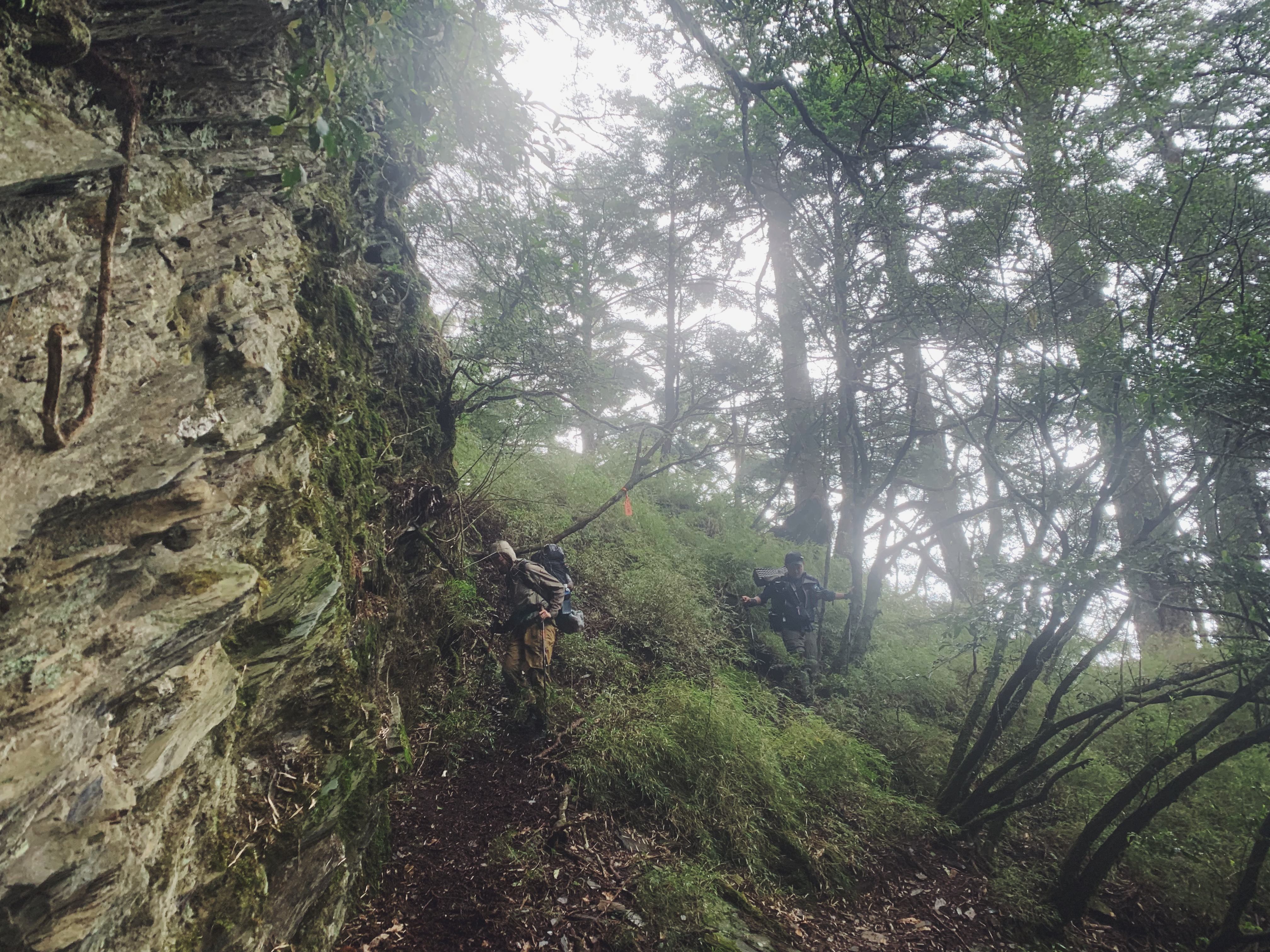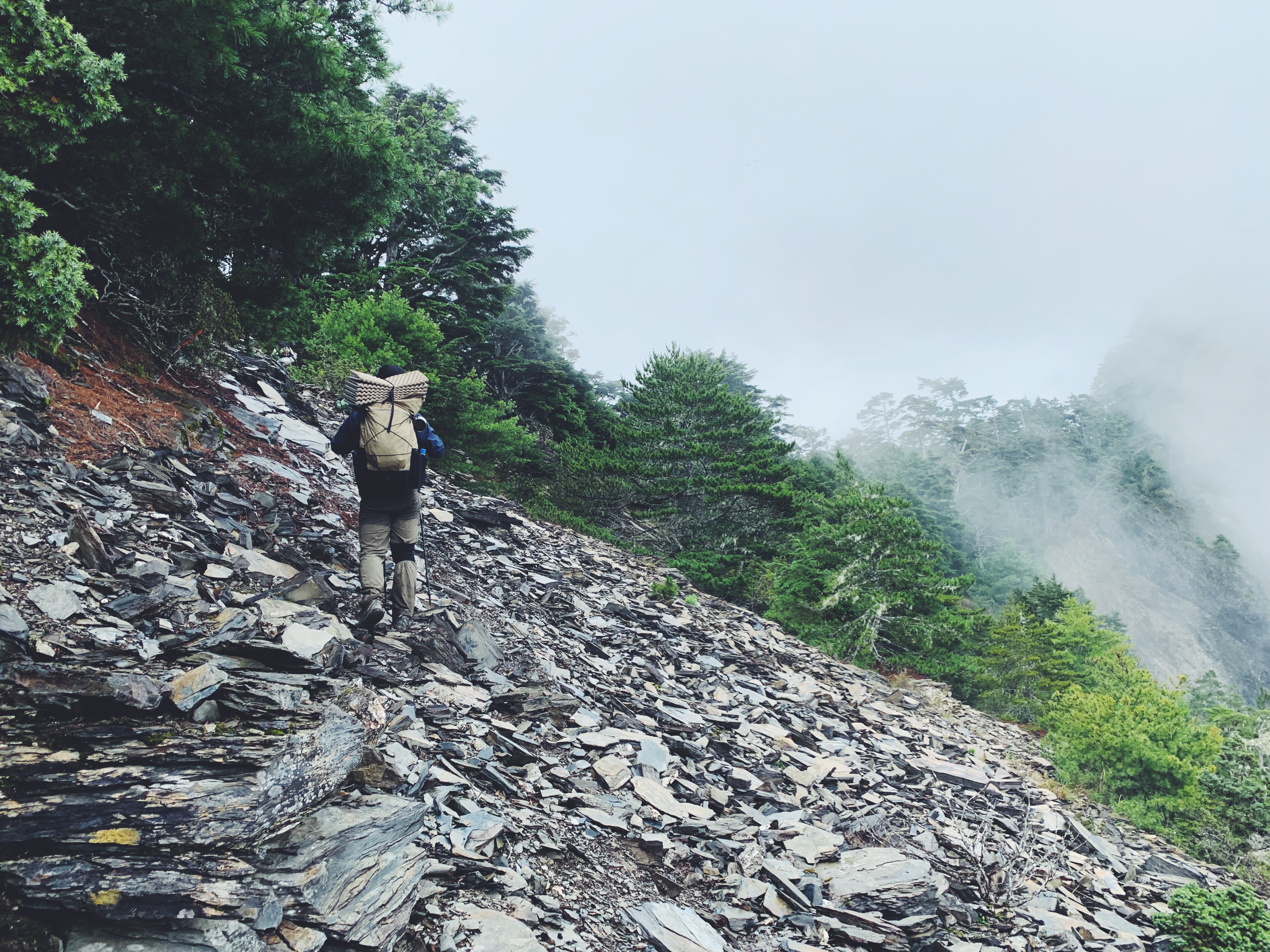 中間會行經一段碎石坡,上次走到這裡還可以看到藍天的景緻,且可以清晰地看到前方裸露的山側,猶如像是一塊蛋糕被切了一半可以看到肌理。不過這次起霧就在霧茫茫之中通過,這段碎石坡算蠻好走的,不過在走完碎石坡要接回稜線時有一塊石頭較難走上去,由於隊友在那裡跌倒所以我們找旁邊走上去會比較安全。接下來為了要繞過前方的陡峭山頭,路線轉為下切,而我們也到了上次迫降的地方。這時候路就變得很難找,那次也是因為天色變暗不好找路只好原地迫降。這個路段也無法扎營,大家免強找到可以躺平的地方鋪上地墊和睡袋直接睡了!不過那次看著整片山林睡也是蠻特別的體驗,其實睡得還不錯。