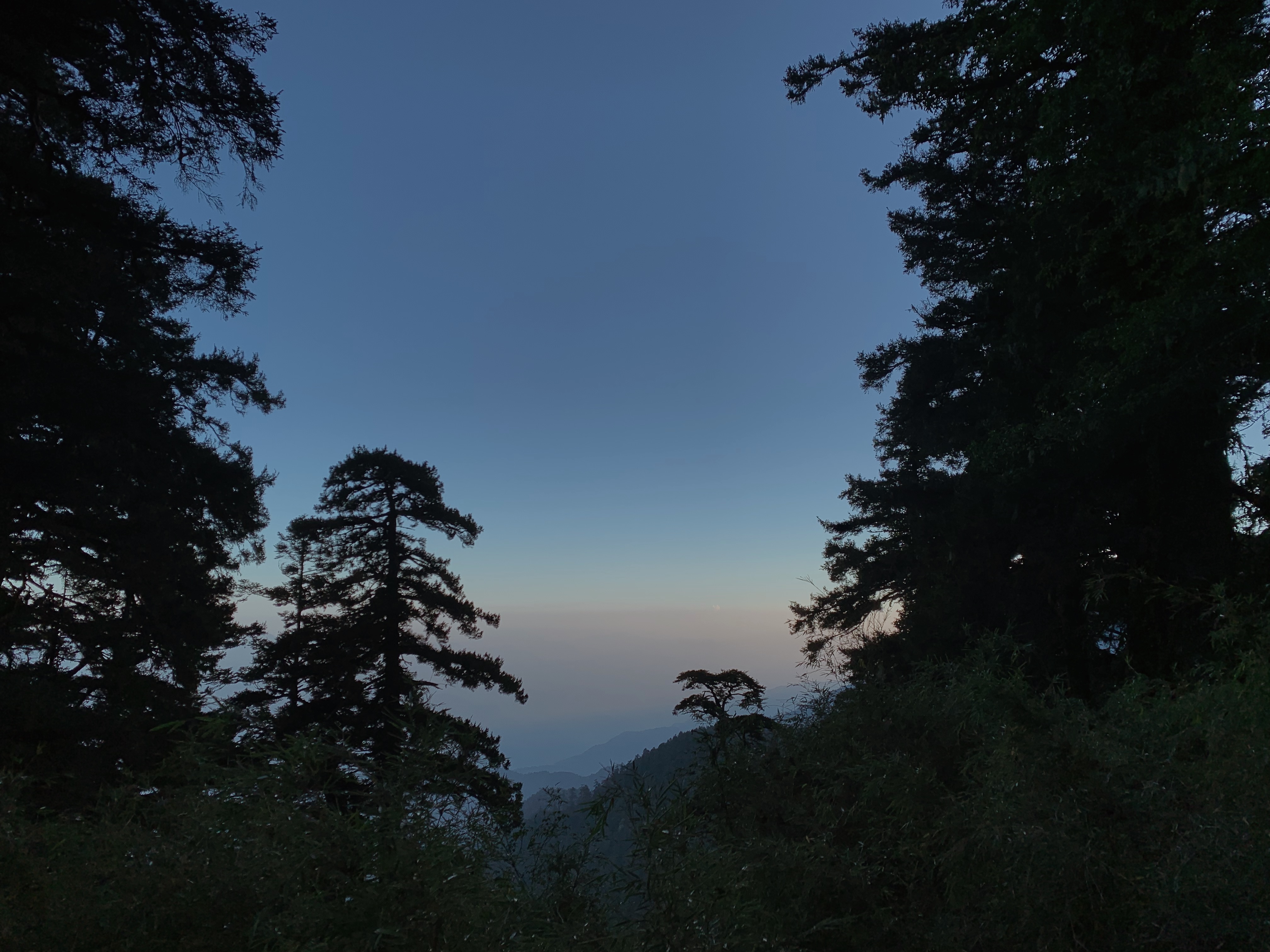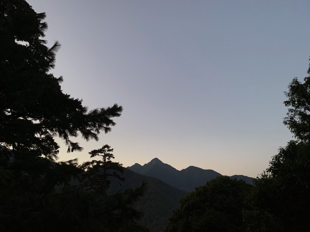接近黃昏時,在山屋準備著晚餐,一樣坐在山屋外的平台看著全山享用晚餐。因為疫情那些搭協作伙食的,協作將菜和飯放在外面,一個戶外buffet的概念。看著大家排著兩排,協作唱名確認人數並跟大家說明吃飯的小規範。有趣的是一隻水鹿就這樣盯著大家,這裡的人很多,我想那個水鹿想說你們現在吃飽喝飽,等下他就有鹽分大餐可以享用了!到了日落時分,亮橘色的夕陽渲染著淡藍色的天空,晚上明月高掛著,星斗在旁點綴著。