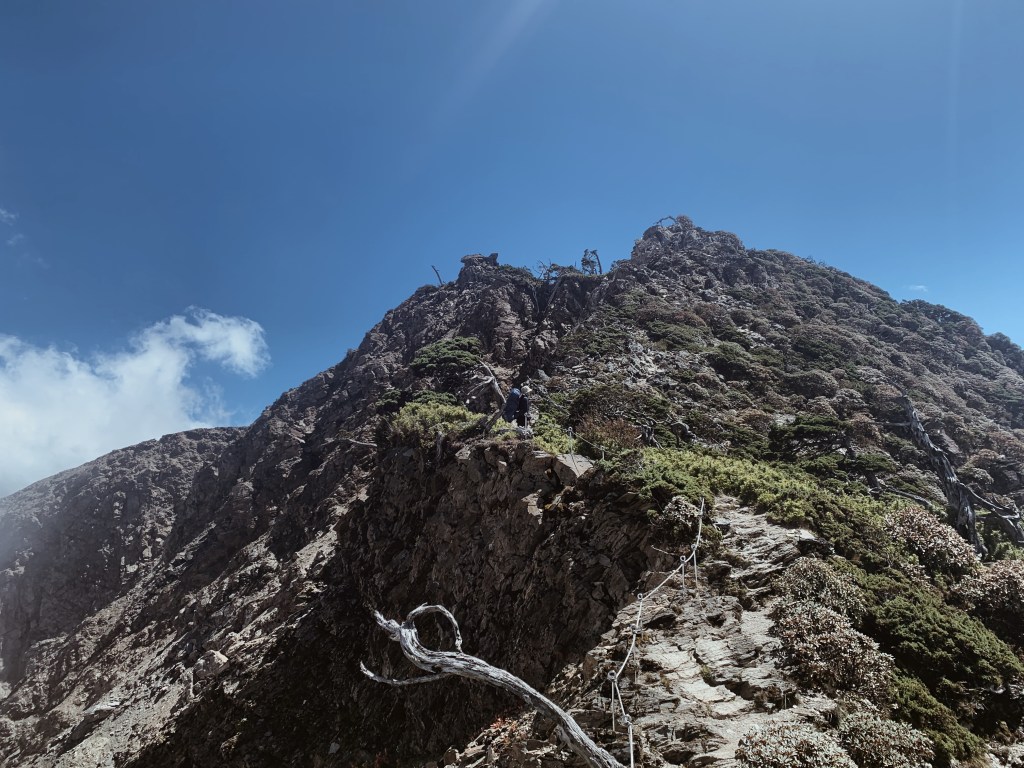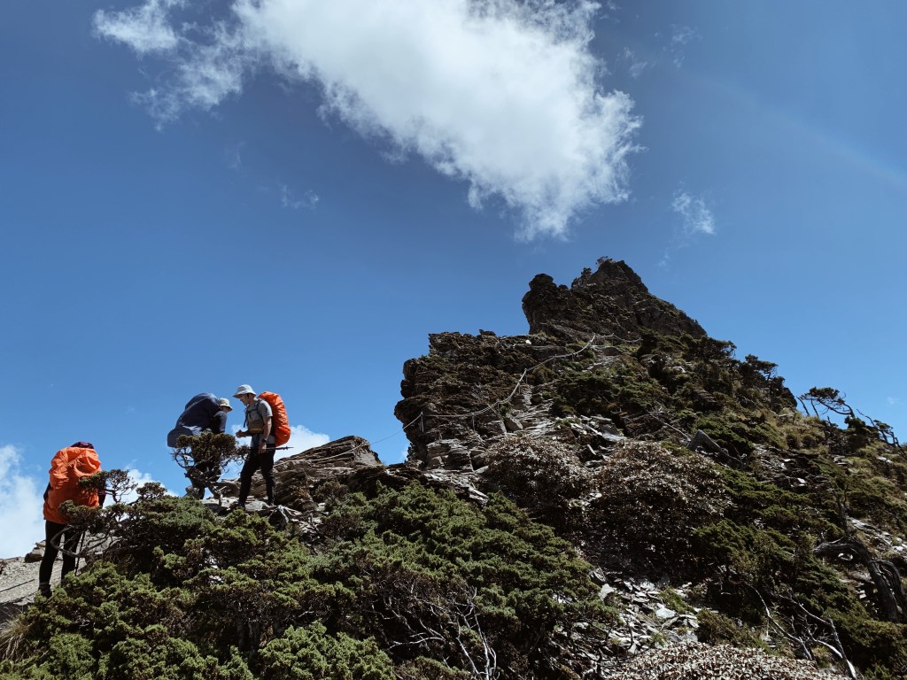 眼前的”五岩峰”的山形是個陡峭的岩脊,顧名思義我們將要跨越那五座岩峰。不過這一段比想像的好走多了,多虧了太管處架設的鐵鍊,只要看好踩點及拉好繩索都可以安全通行。這裡遍佈了展現各種姿態的玉山圓柏,枝幹因為風的長期吹拂呈現一面倒的樣子但依舊屹立不搖。這一段就像是看了一場玉山圓柏的現代舞表演,這場劇讓我看了如癡如醉。還在沈迷在圓柏的美之時,在那瞬間,嘩~ 南湖圈谷映入眼簾,心被這個無法言喻的美衝擊著砰砰跳。南湖東峰與主峰包圍著中間平緩的腹地,遠看小小的山屋像是遺世獨立般的散落在這個夢幻之境。