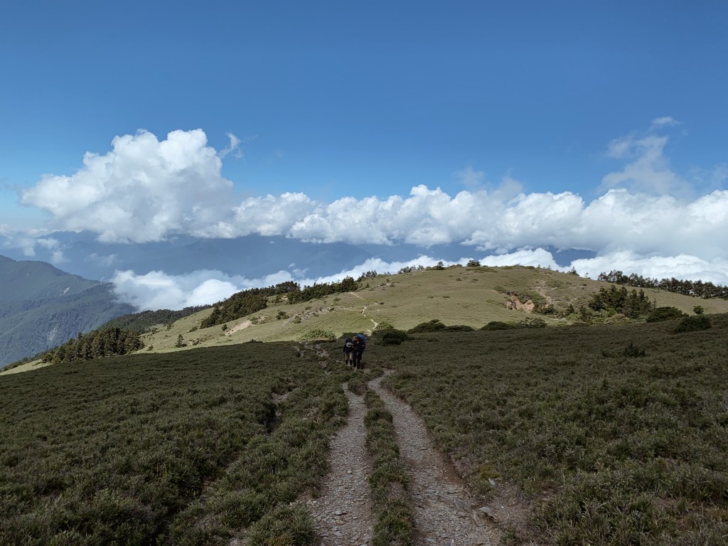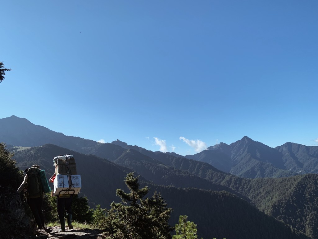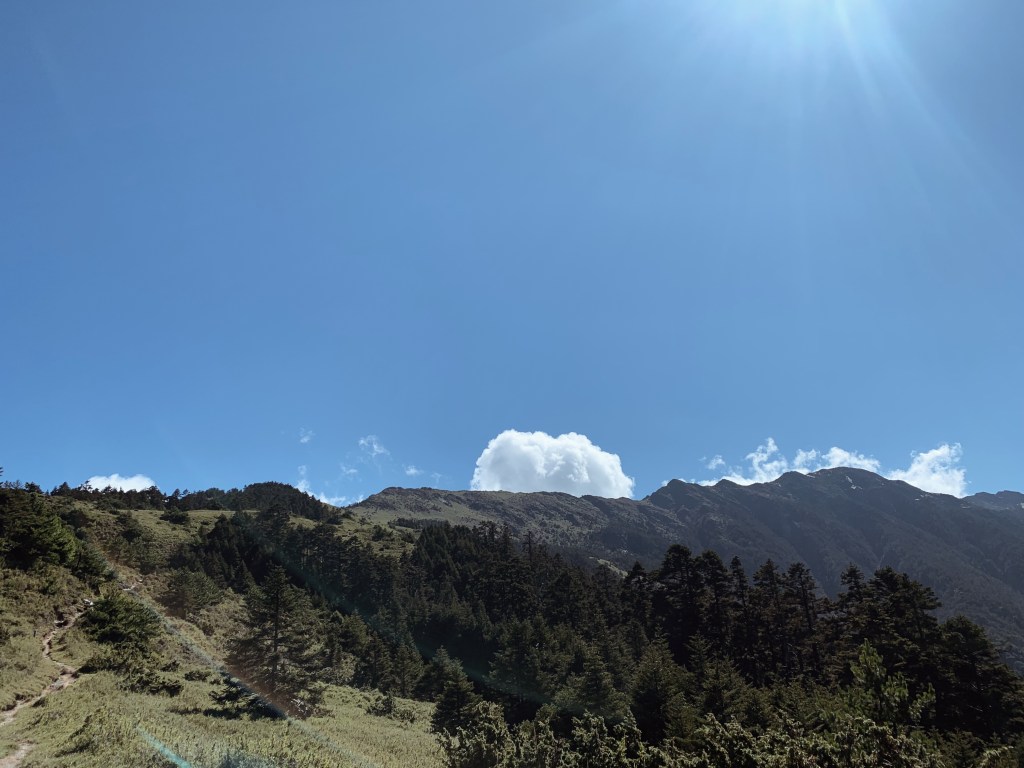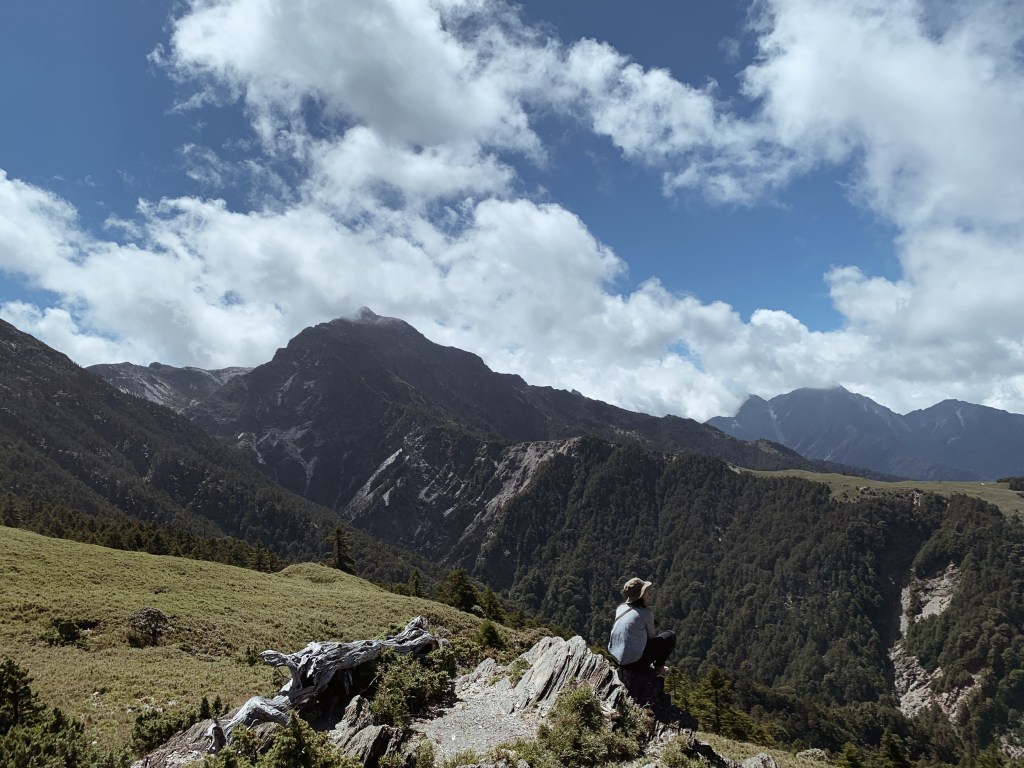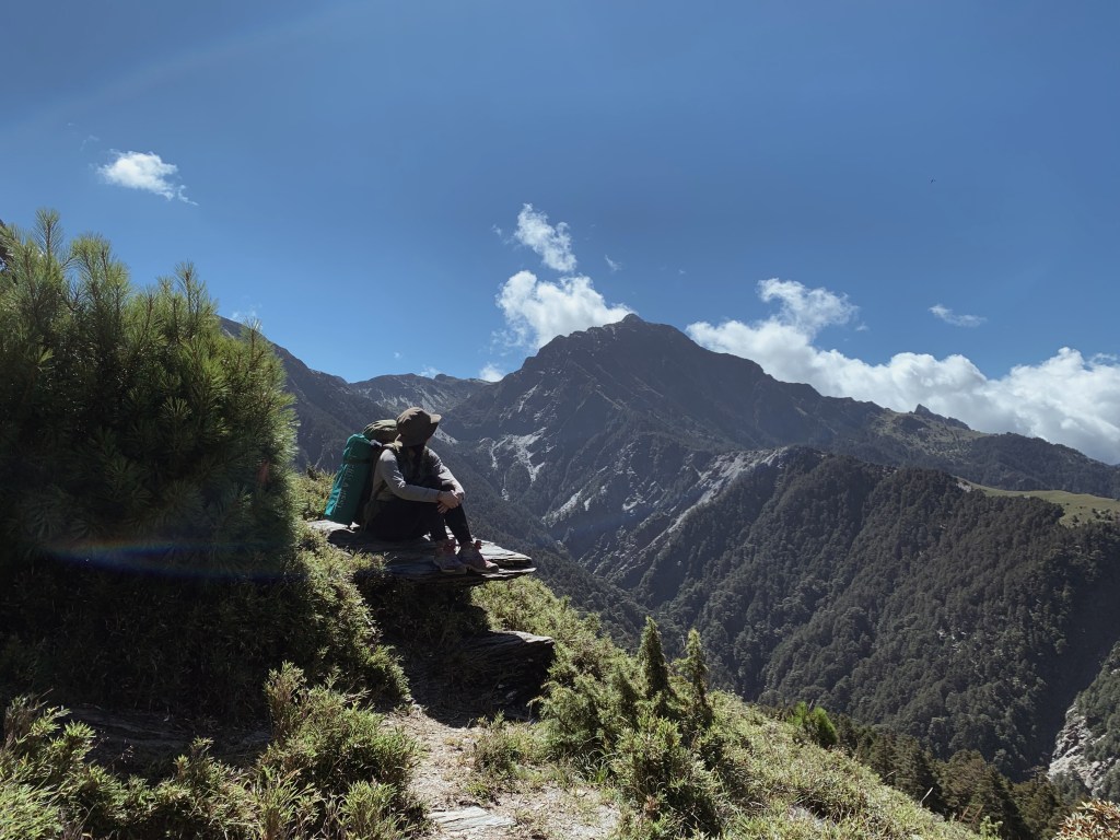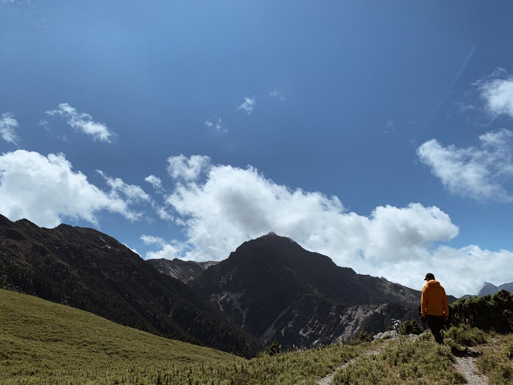 “哇!太美了吧!“ 在揭開樹林的布幕後,毫無遮掩的中央尖山就矗立在眼前。上到稜線的那一刻,那壯闊的山景呈現在眼前時,無盡的感動蔓延整個心。而今天的天氣也相當的好,沒有一絲雲霧,就這樣豪邁的衝擊我的感官。背滿食材的協作用緩慢的腳步但一路幾乎都沒有停歇,每次都很佩服他們的耐重力。太陽曬的身體暖呼呼的,就這樣今天開啟了華麗的序幕,滿心期待著接下來的劇幕。而也迎來了此行的第一座百岳 – 審馬陣山,標高3141公尺。