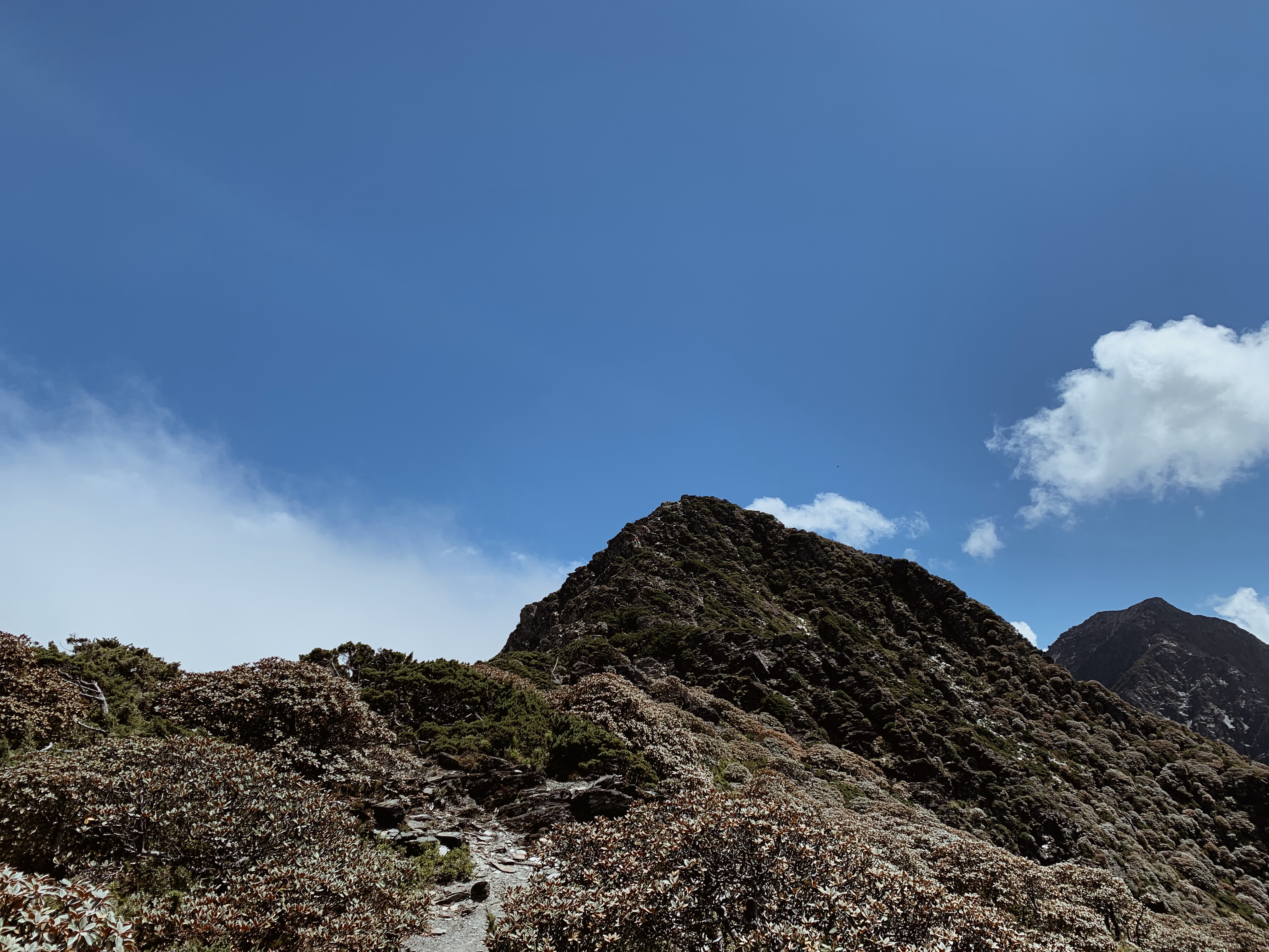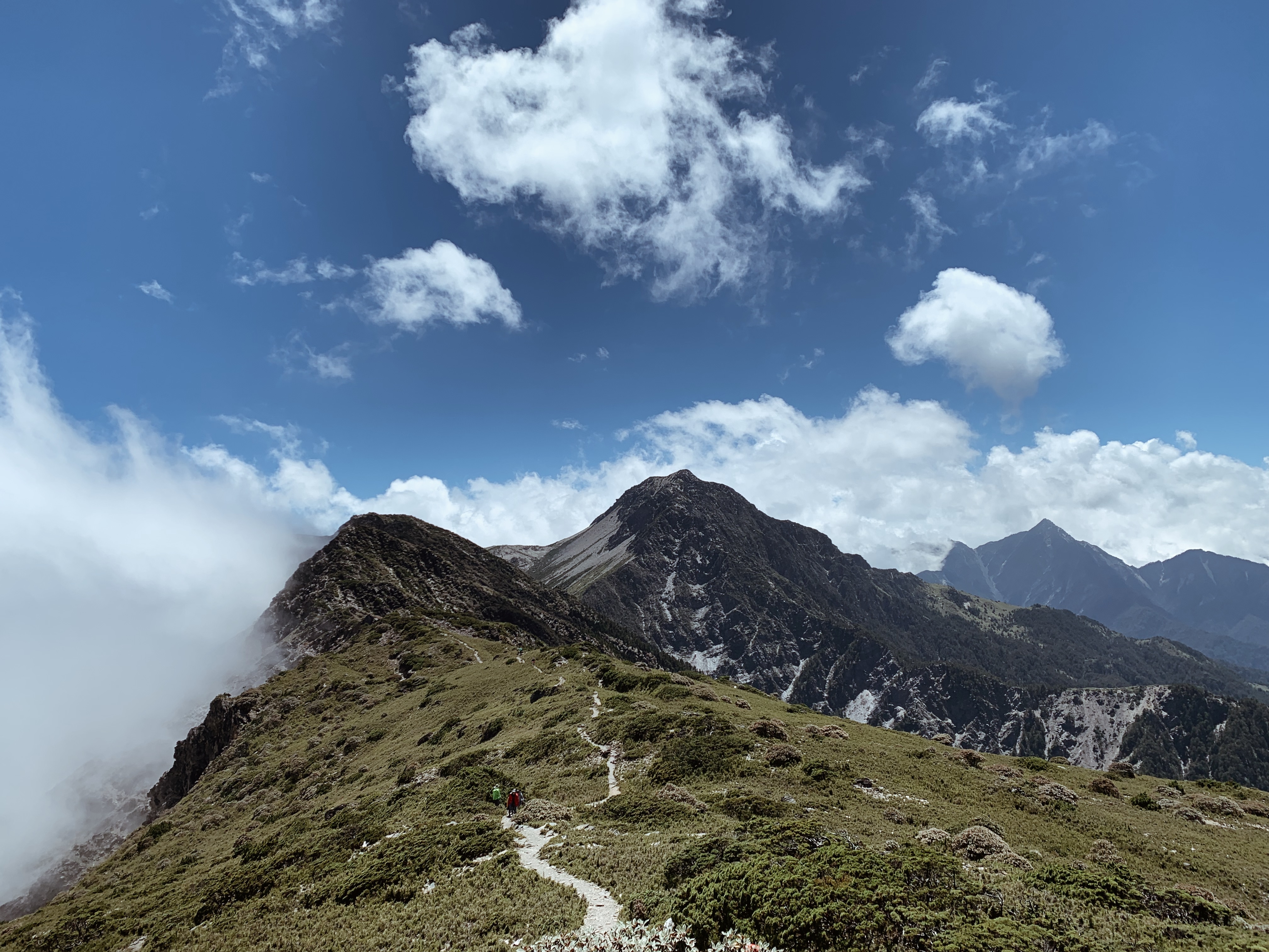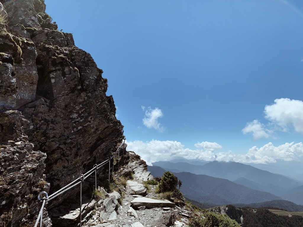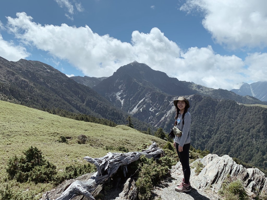 “哇!太美了吧!“ 在揭開樹林的布幕後,毫無遮掩的中央尖山就矗立在眼前。上到稜線的那一刻,那壯闊的山景呈現在眼前時,無盡的感動蔓延整個心。而今天的天氣也相當的好,沒有一絲雲霧,就這樣豪邁的衝擊我的感官。背滿食材的協作用緩慢的腳步但一路幾乎都沒有停歇,每次都很佩服他們的耐重力。太陽曬的身體暖呼呼的,就這樣今天開啟了華麗的序幕,滿心期待著接下來的劇幕。而也迎來了此行的第一座百岳 – 審馬陣山,標高3141公尺。