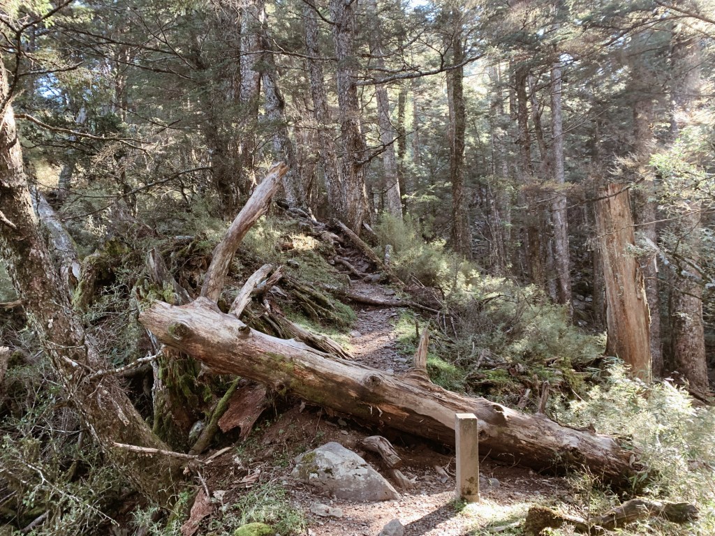 一剛開始就在樹林中穿梭陡上,松針鋪滿了整個地面,而陽光像是穿透著樹葉的間隙猶如舞台的燈光效果照耀在地上閃著。我們到了4.8K叉路口,到一平坦處時稍作休息,從這裡會是一小段好走的林道,每次走在這種林道就會心情愉悅,而且又踏上柔軟的松針腳步更為輕鬆。在6.8K處會看到太魯閣公園的告示牌,基本上從這裡開始就是國家公園的範圍了!告示牌對面也矗立了一棵高聳的神木,而接下來的路程將會是陡上到松風嶺,用緩緩的腳步不急不徐的隨著呼吸往上走,被林立的大片二葉松圍繞著。