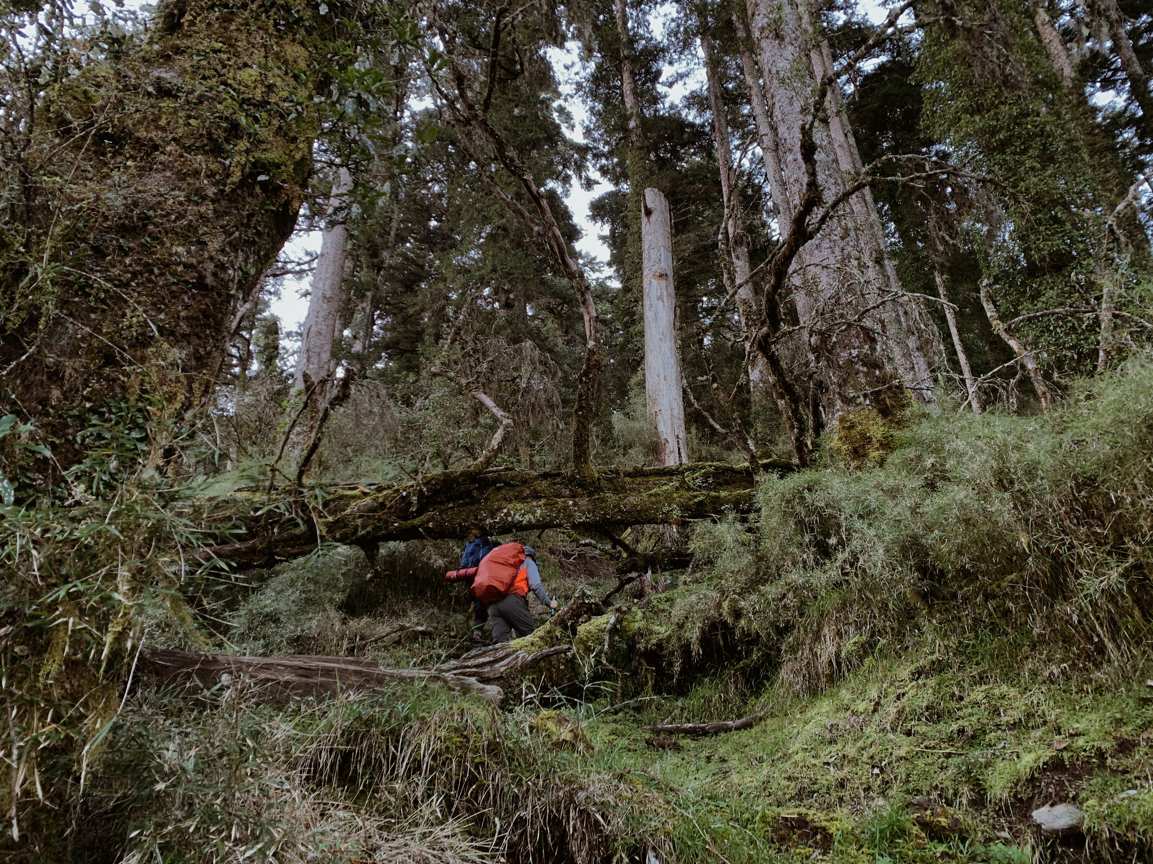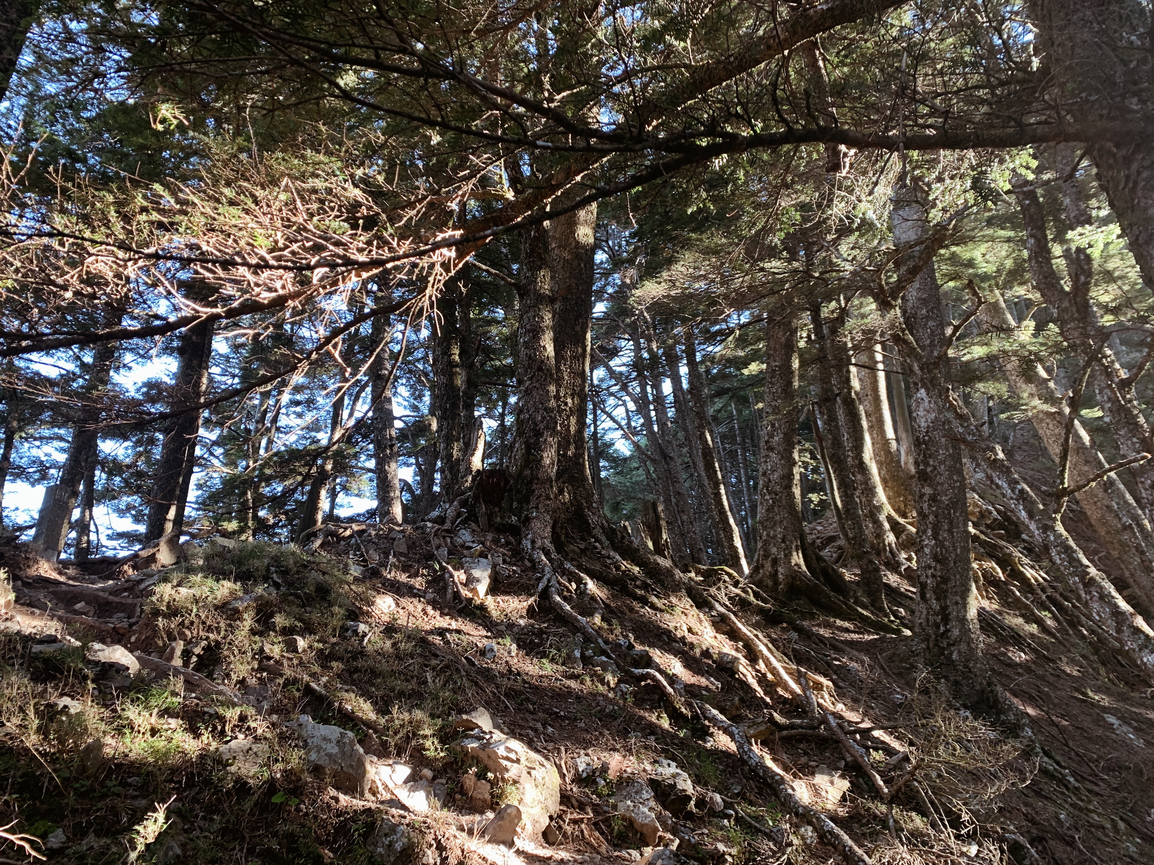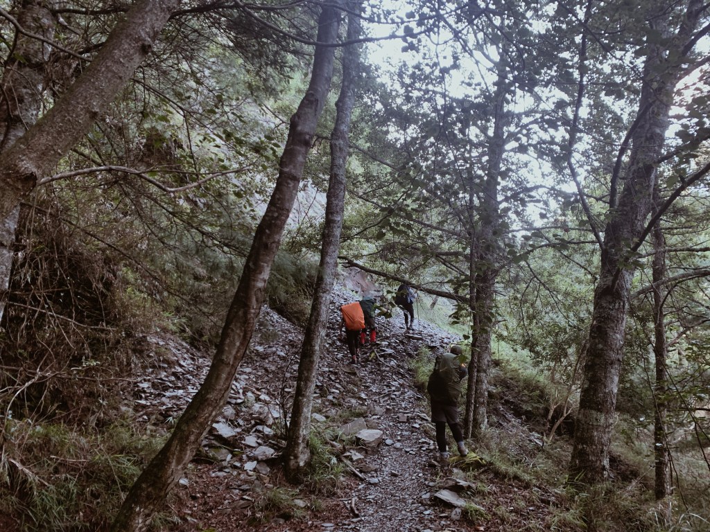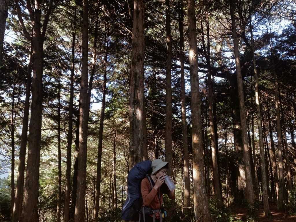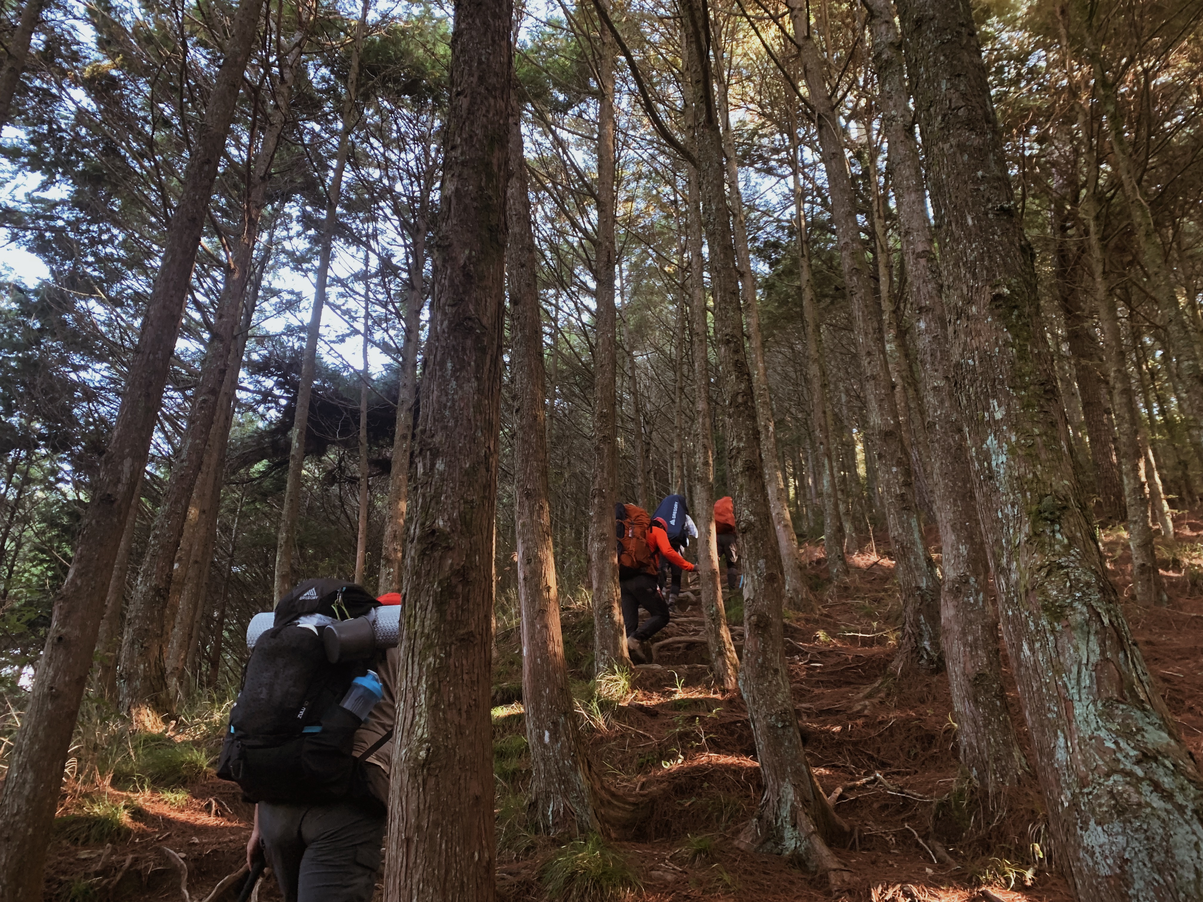 天還沒亮起我們就準備出發,離開山屋後會有一小段下坡,接下來就是努力的陡上了。每次摸早黑開始走時,我最期待清晨的那一刻,除了明亮帶來安全感之外,早晨中無瑕的天空與山巒的漸層總是讓人驚嘆。越走越高後,往回望從高聳的樹林的缺口處已經可以平視對面的山。與堆疊的倒木進行各種障礙賽,跨欄、匍匐前進和繞行。蔓延的樹根層層交疊,緊抓著土地生生不息。而這些樹根帶領我們一步步往上走,就這樣扎實的前進。
