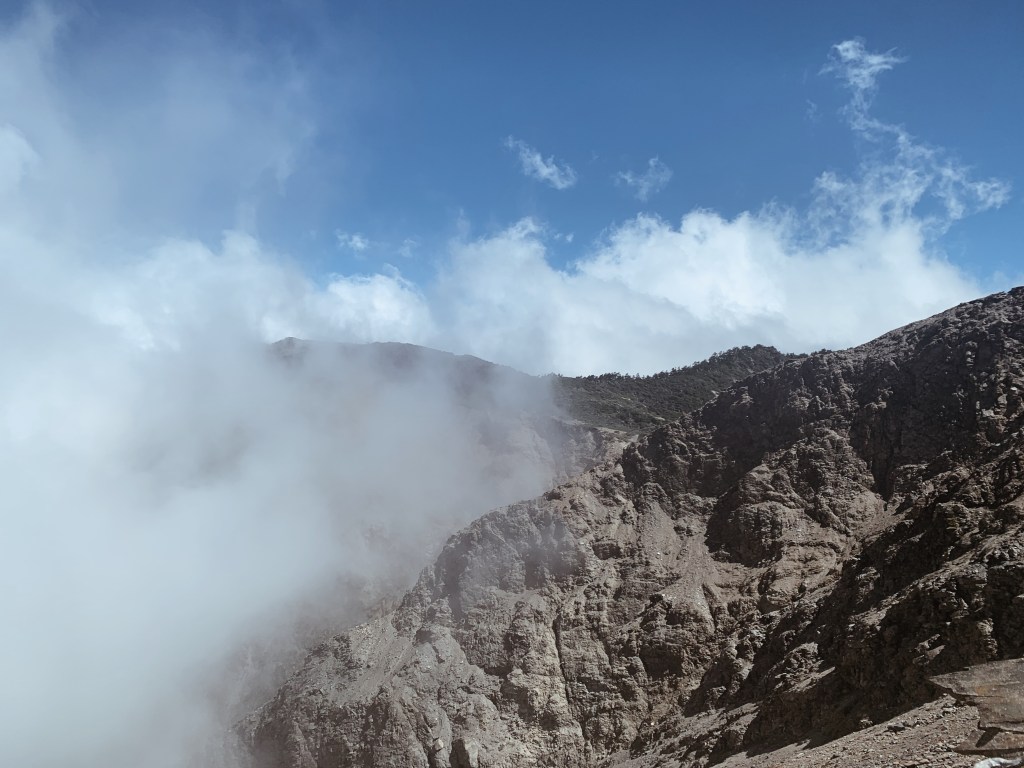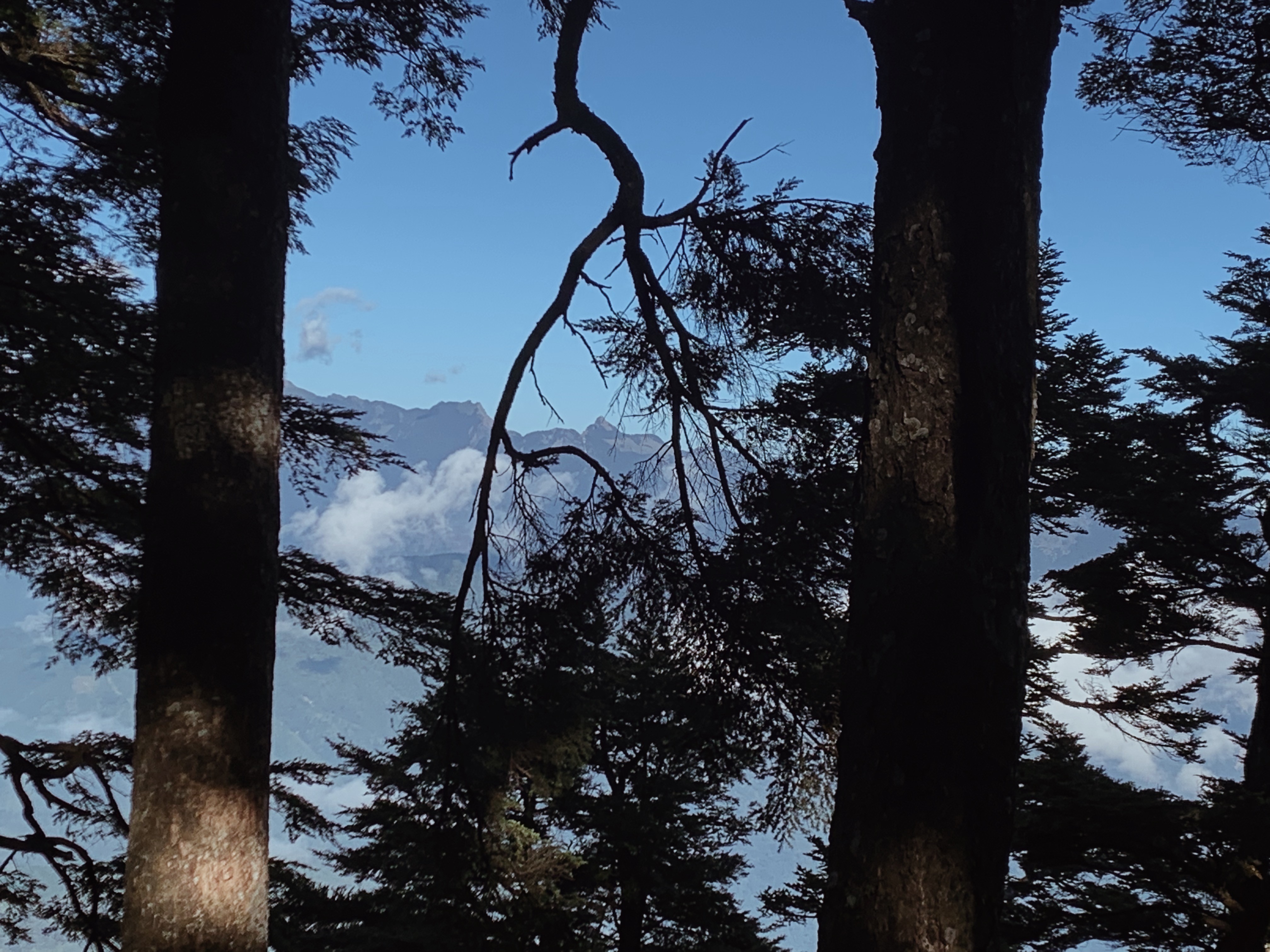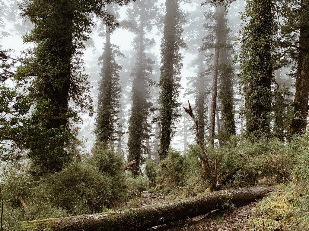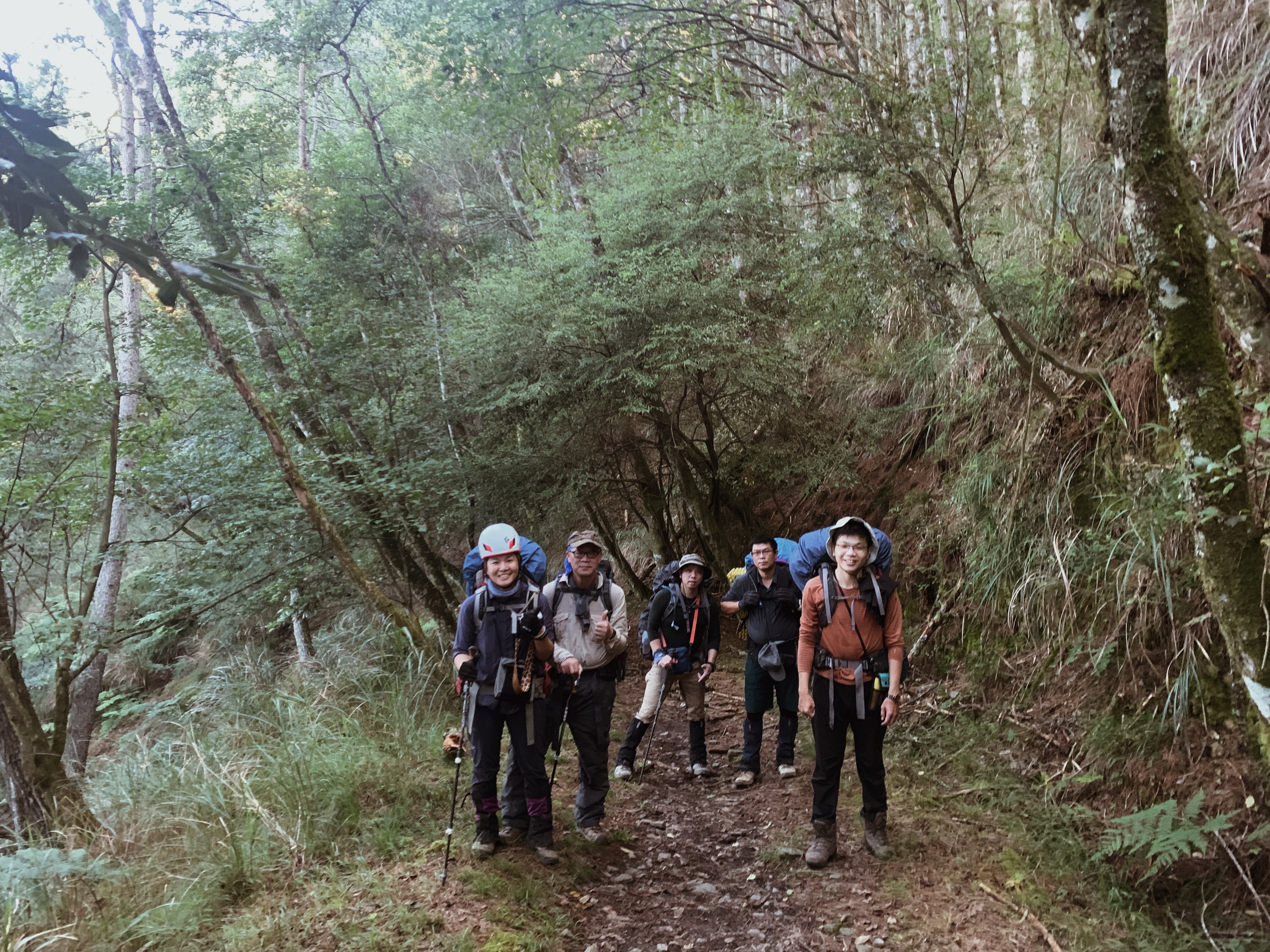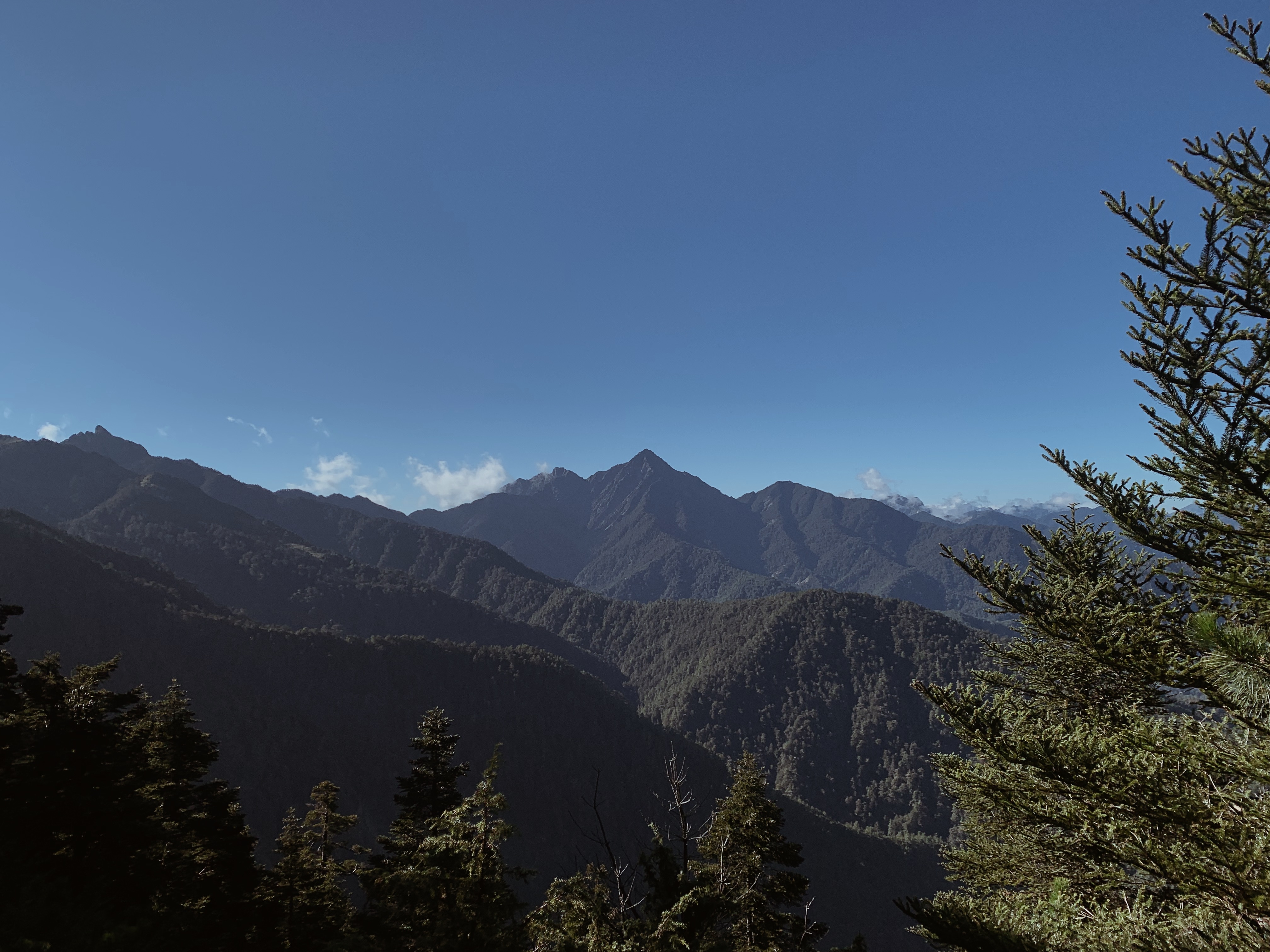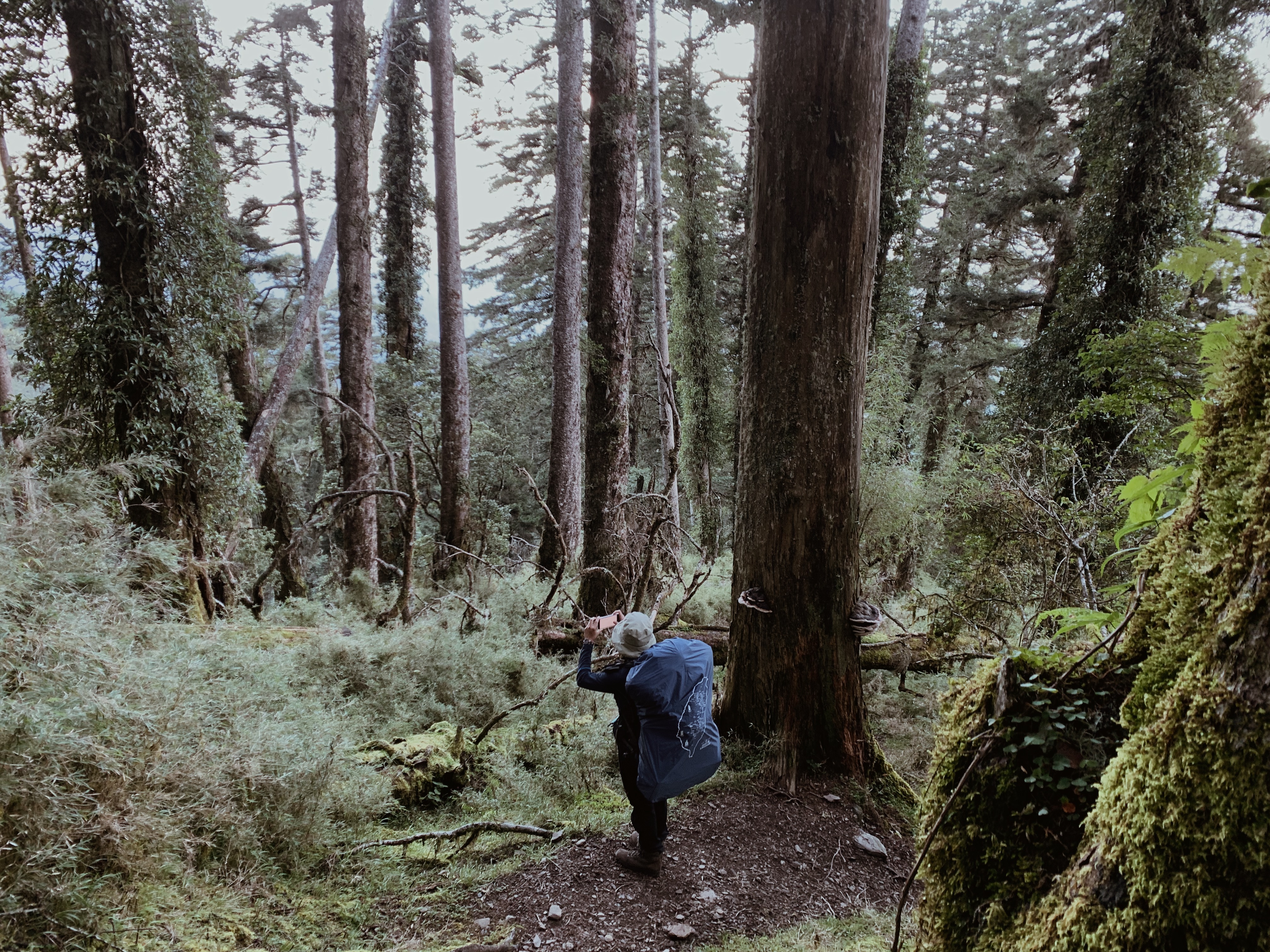 天還沒亮起我們就準備出發,離開山屋後會有一小段下坡,接下來就是努力的陡上了。每次摸早黑開始走時,我最期待清晨的那一刻,除了明亮帶來安全感之外,早晨中無瑕的天空與山巒的漸層總是讓人驚嘆。越走越高後,往回望從高聳的樹林的缺口處已經可以平視對面的山。與堆疊的倒木進行各種障礙賽,跨欄、匍匐前進和繞行。蔓延的樹根層層交疊,緊抓著土地生生不息。而這些樹根帶領我們一步步往上走,就這樣扎實的前進。