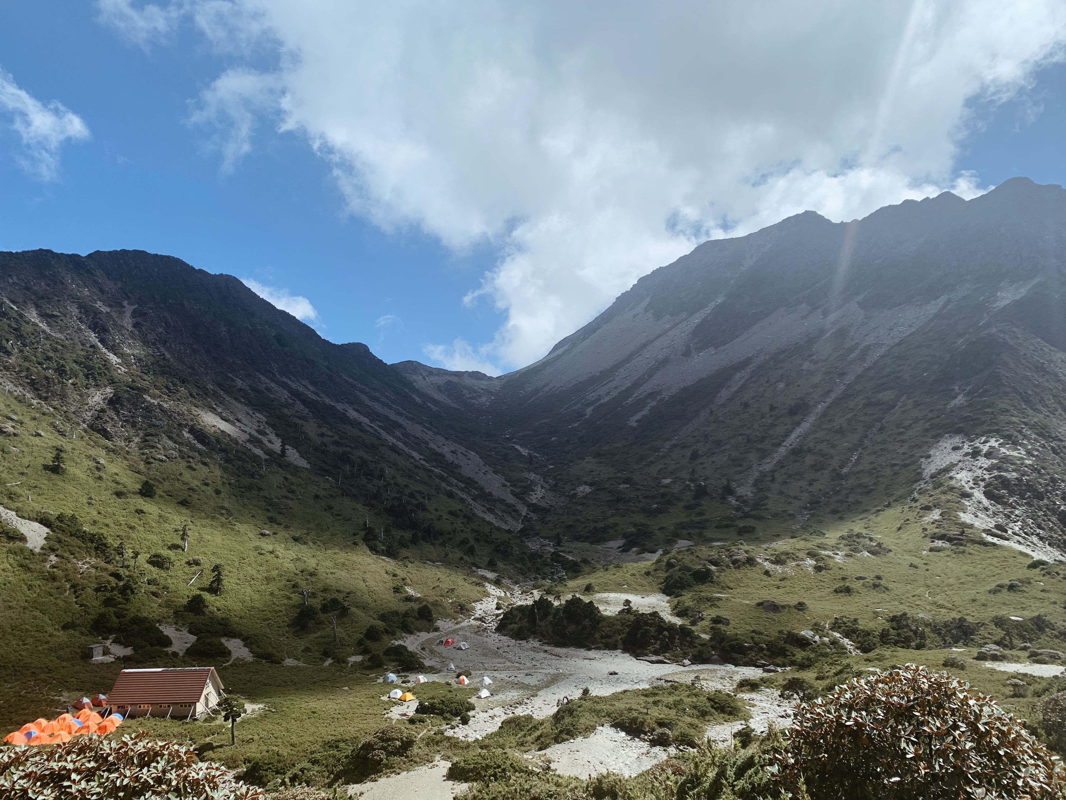 一路從至高處踩著碎石坡往圈谷前進,五顏六色錯落的帳篷是如此的顯眼。這裡保存著冰河遺跡,早在日據時期鹿野忠雄就提出這個論點。原本渺小的山屋就這樣離我越來越近,一路從高處滑到圈谷了。迫不急待的找了個位置搭好了帳篷,先去山屋參觀了一番,泡了杯奶茶坐在山屋旁看著周圍的風景實在是太幸福了。時間還早我去了大家口中可以收到訊號的網咖,發現從這裡看圈谷的角度也真的是非常美。