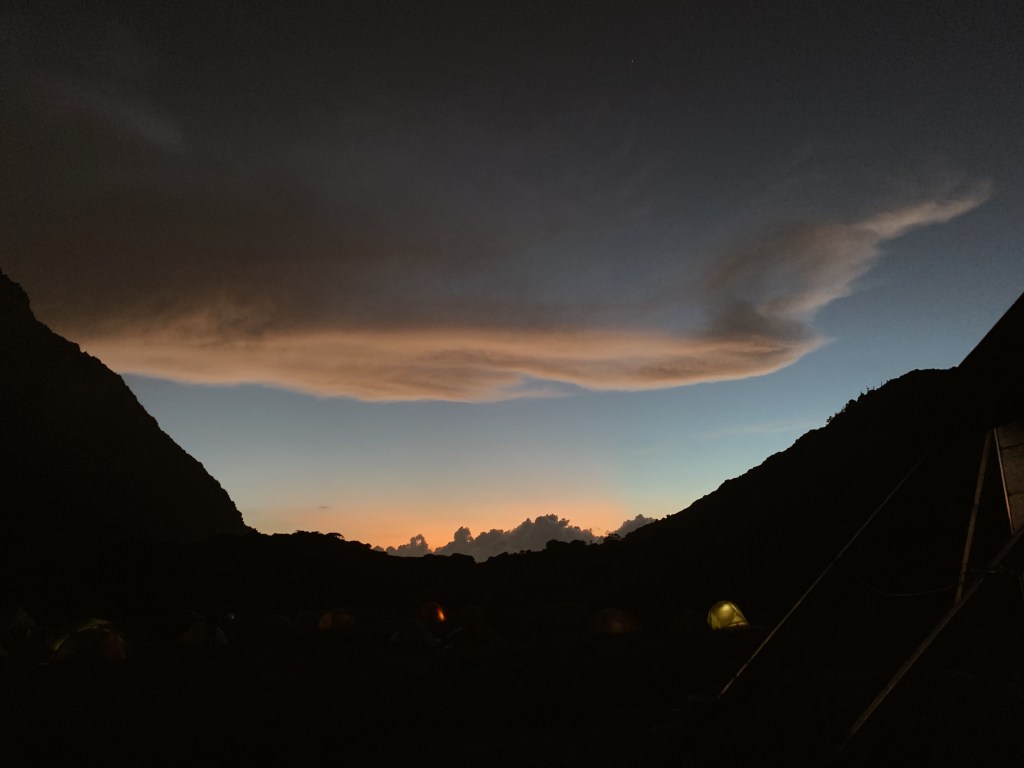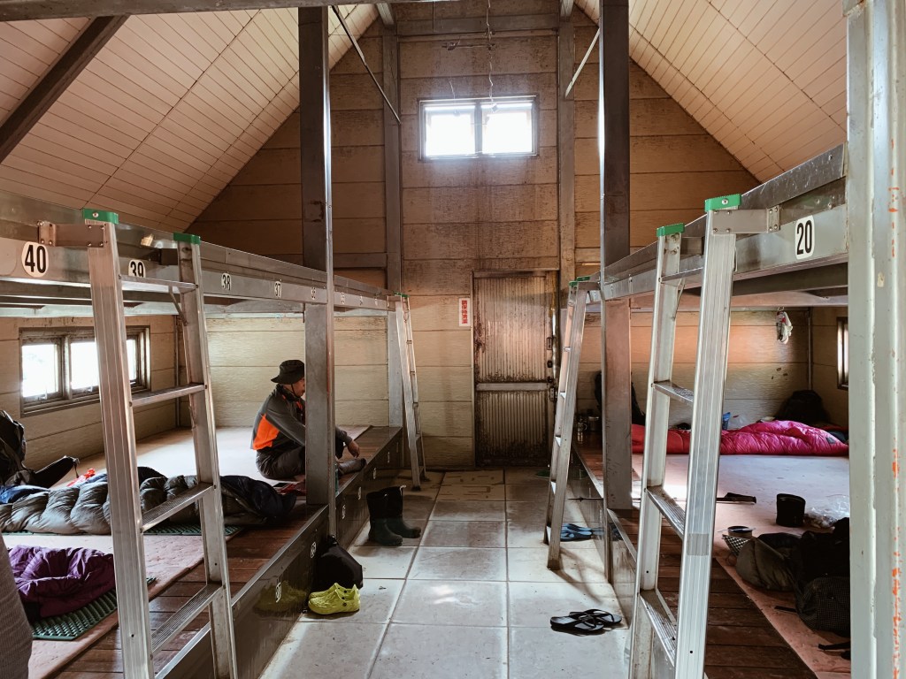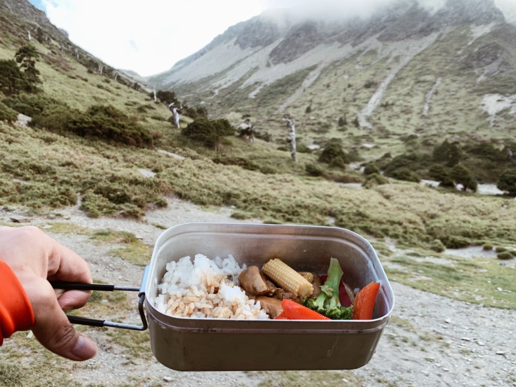 大概約下午一點就到了雲稜山屋,我們在接近山屋之前的腹地扎營。而山屋旁有雨水集中桶可裝水且有生態廁所,時間還早我們悠閒的喝了玉米濃湯。其他的山友也紛紛的抵達,看來這幾天會相當的熱鬧。晚上的菜單是蔬菜綠咖喱,在全聯發現了粉狀的椰漿,搭上綠咖喱粉或塊就可以煮成好吃的泰式綠咖喱了!煮起來真的很簡易,所以推薦給大家。入夜氣溫開始也變冷,今天也早點入睡來迎接明天的重頭戲-南湖圈谷。