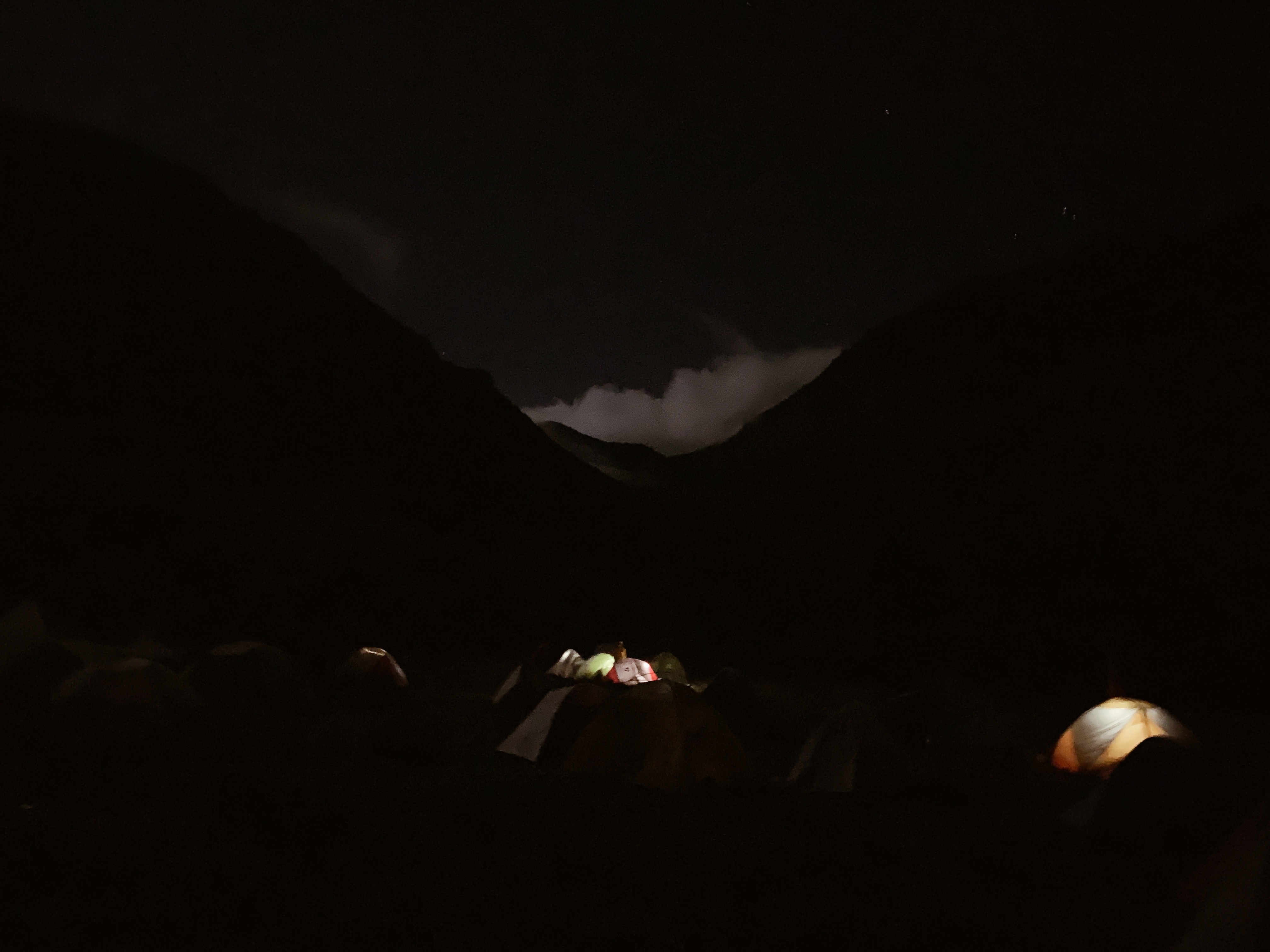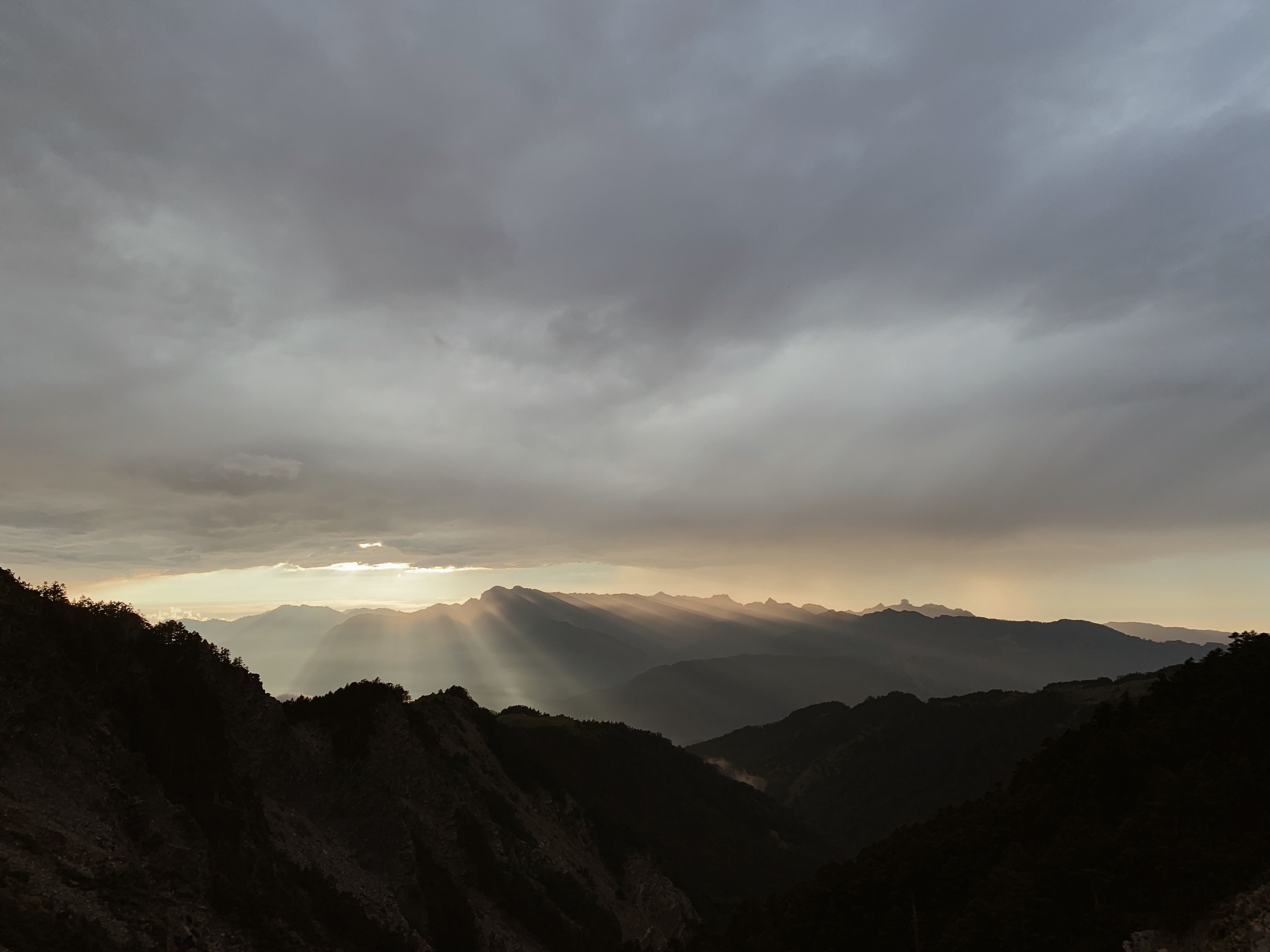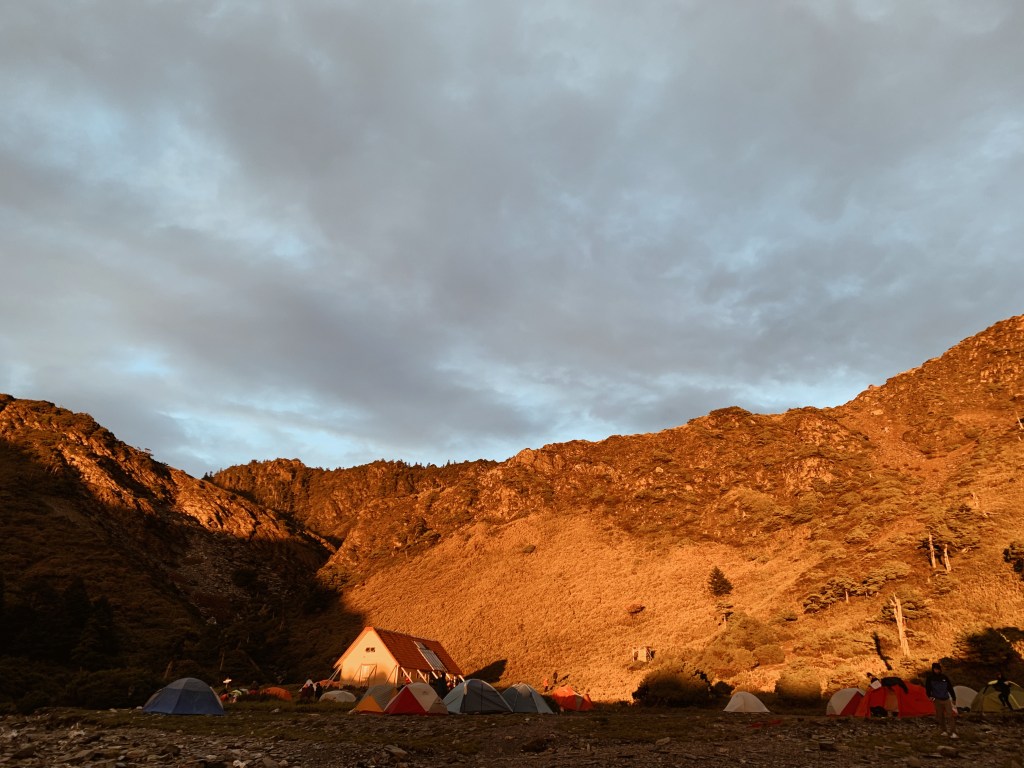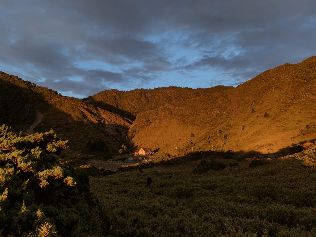 好在今天決定在圈谷的山屋中耍廢,因為約莫一點就開始下大雨了,如果決定去巴巴山肯定要會淋成落湯雞,而今天下的雨也毫不留情,也伴隨著轟轟的雷聲。許多要回程的山友看著大雨不知道要什麼時候出發的好,我能深刻體會他們的心情。下午聽著外面的雨聲睡著午覺,對比昨天的情況,今天過的還真是奢侈呀!而在接近黃昏時刻雨停了,我們走到所謂的網咖(有訊號的地方),太陽從濃厚的雲層下降,光灑在聖稜線形成一個清晰可見綿延的輪廓,大家都聚集到這裡來欣賞。而圈谷被夕陽照的閃閃發光,染金了整個圈谷,那畫面真的相當夢幻。