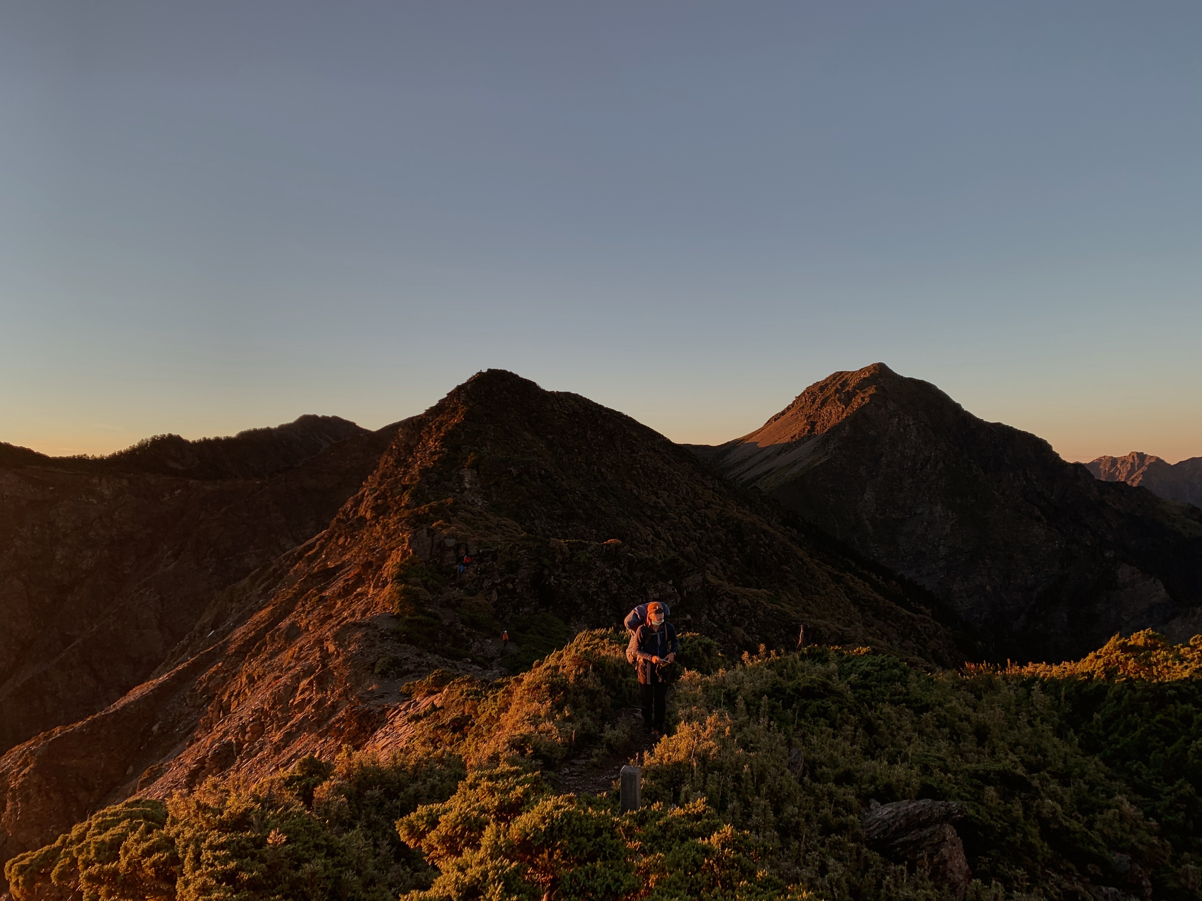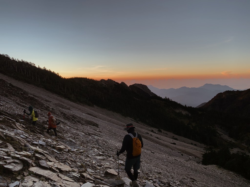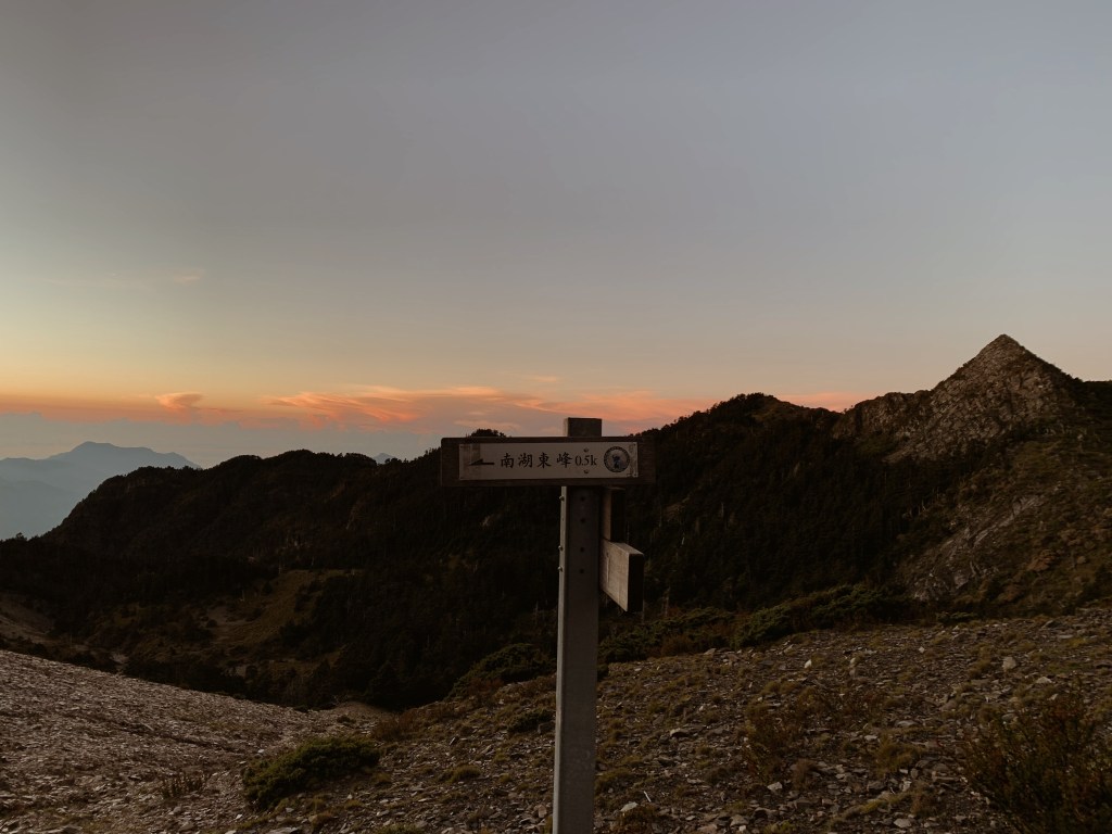 明亮的月亮還高掛在夜空,點燈的帳篷散落在南湖圈谷中,雲朵還沈睡在後方的山脈上。我們在明月的引領之下出發,路途中遠望前往南湖東峰山坡上整隊緩緩前進的頭燈,黑色的山形在夜晚中看起來是如此神秘。隨著太陽的露出,清晨的陽光讓山脈褪去那黑色面紗,我們也在不知不覺中走到南湖東峰和馬比杉山岔路口牌子。晨曦中成疊的橘色漸層染上了空中的畫布,也把後方的山塗染橘,像是冠冕般金色的皇冠。