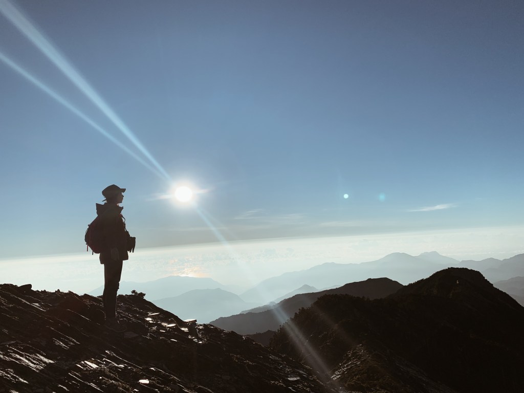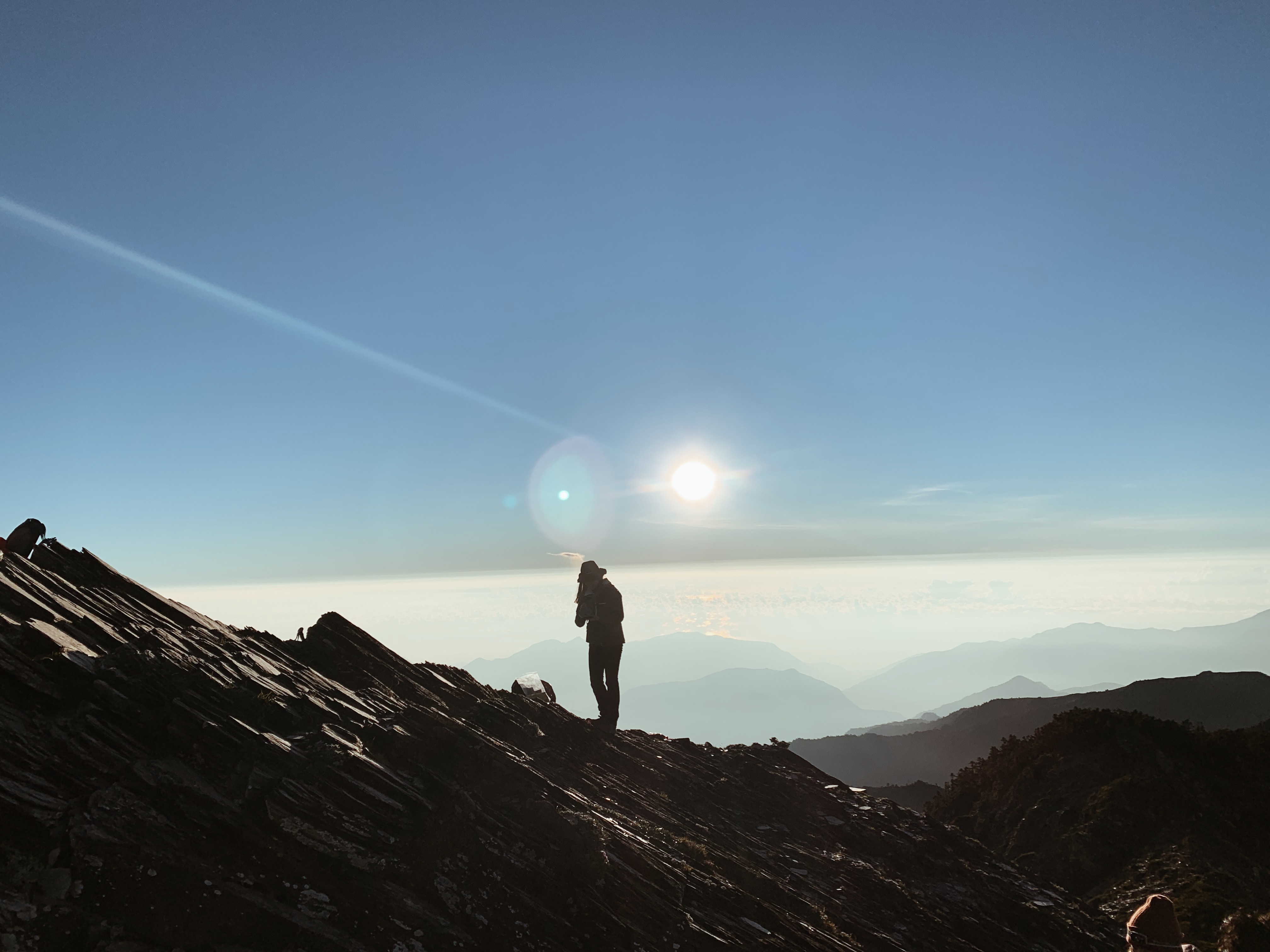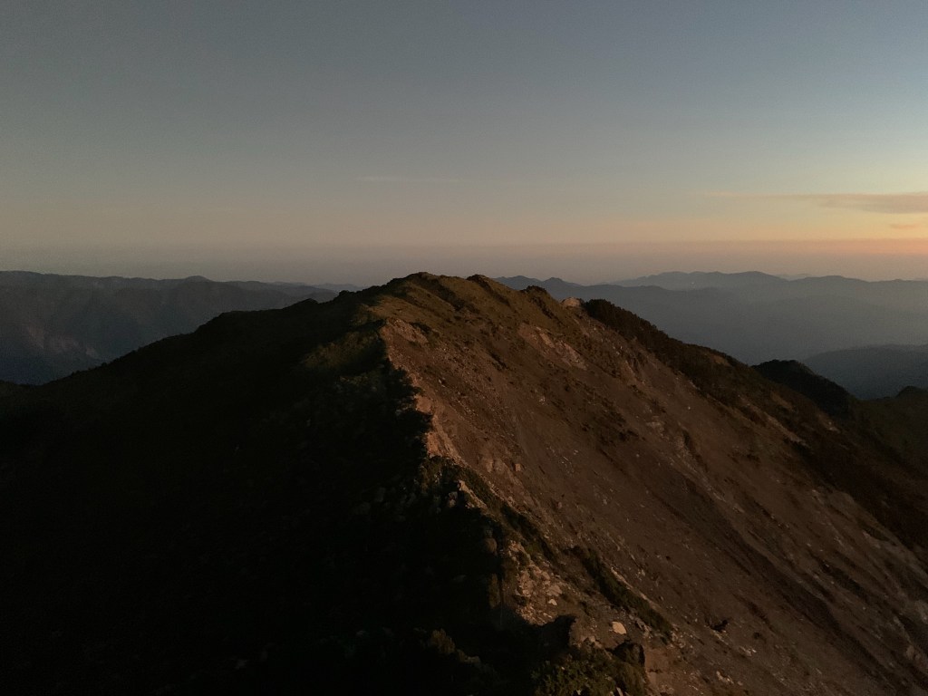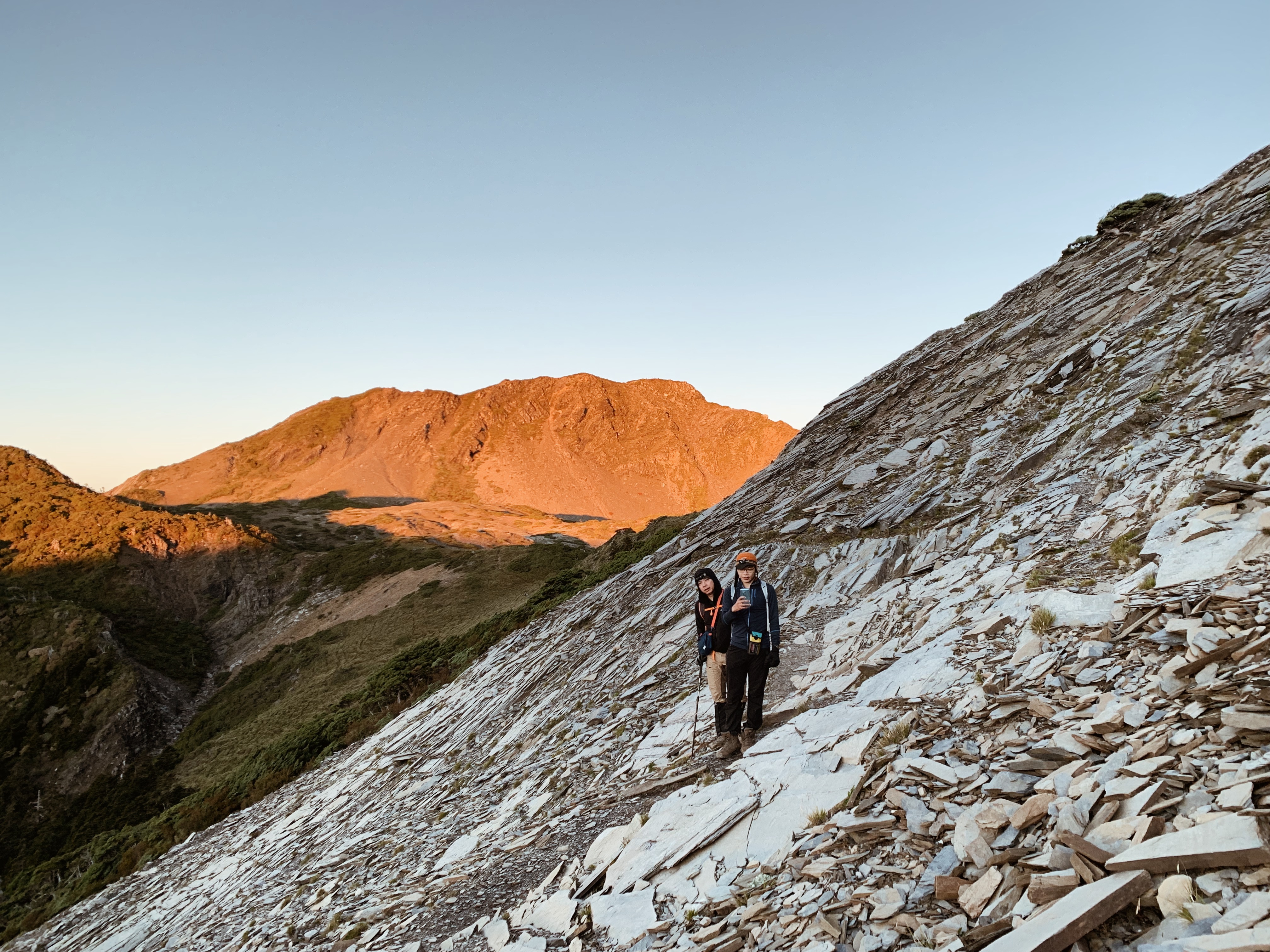 明亮的月亮還高掛在夜空,點燈的帳篷散落在南湖圈谷中,雲朵還沈睡在後方的山脈上。我們在明月的引領之下出發,路途中遠望前往南湖東峰山坡上整隊緩緩前進的頭燈,黑色的山形在夜晚中看起來是如此神秘。隨著太陽的露出,清晨的陽光讓山脈褪去那黑色面紗,我們也在不知不覺中走到南湖東峰和馬比杉山岔路口牌子。晨曦中成疊的橘色漸層染上了空中的畫布,也把後方的山塗染橘,像是冠冕般金色的皇冠。