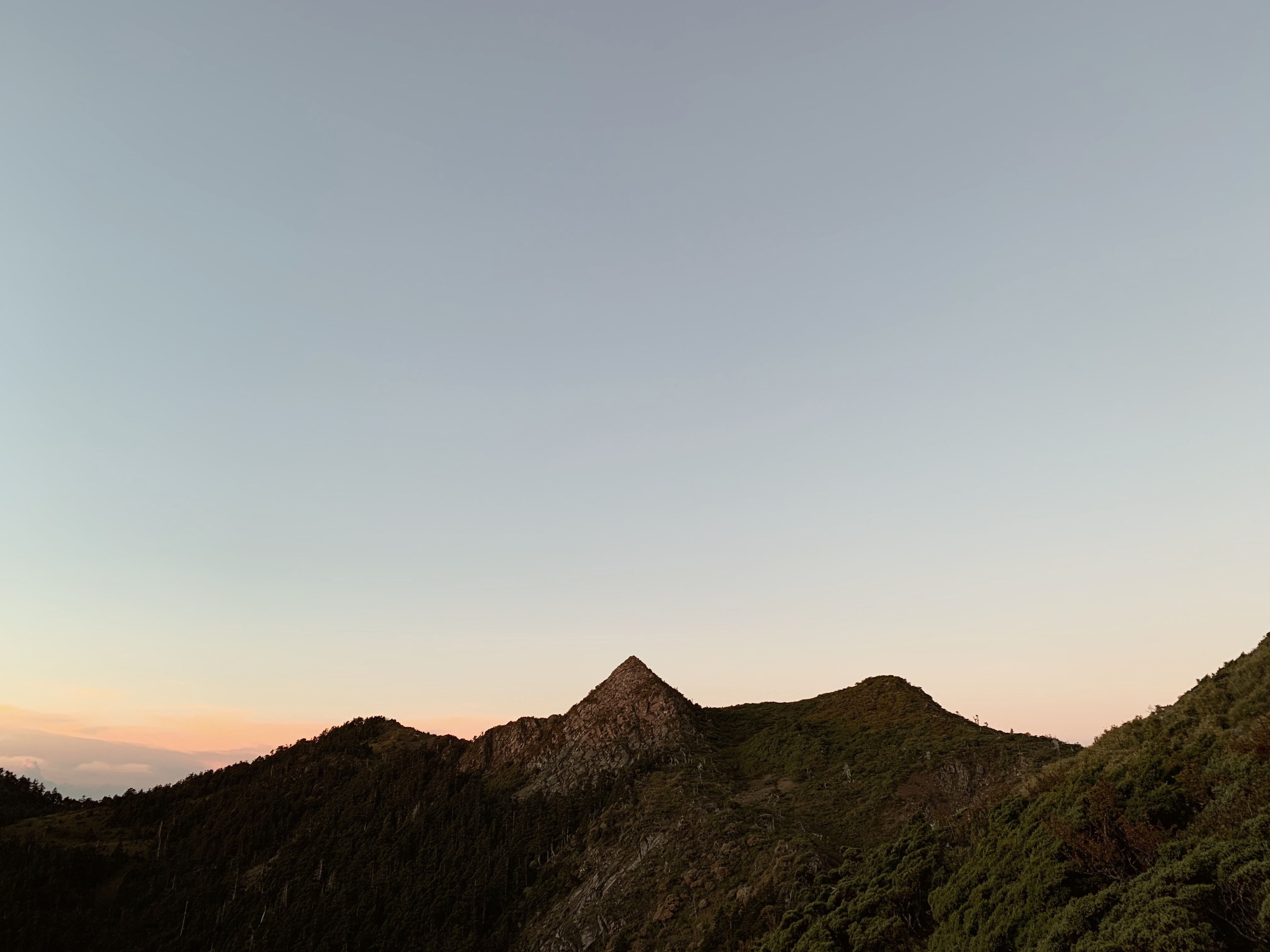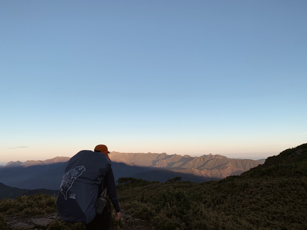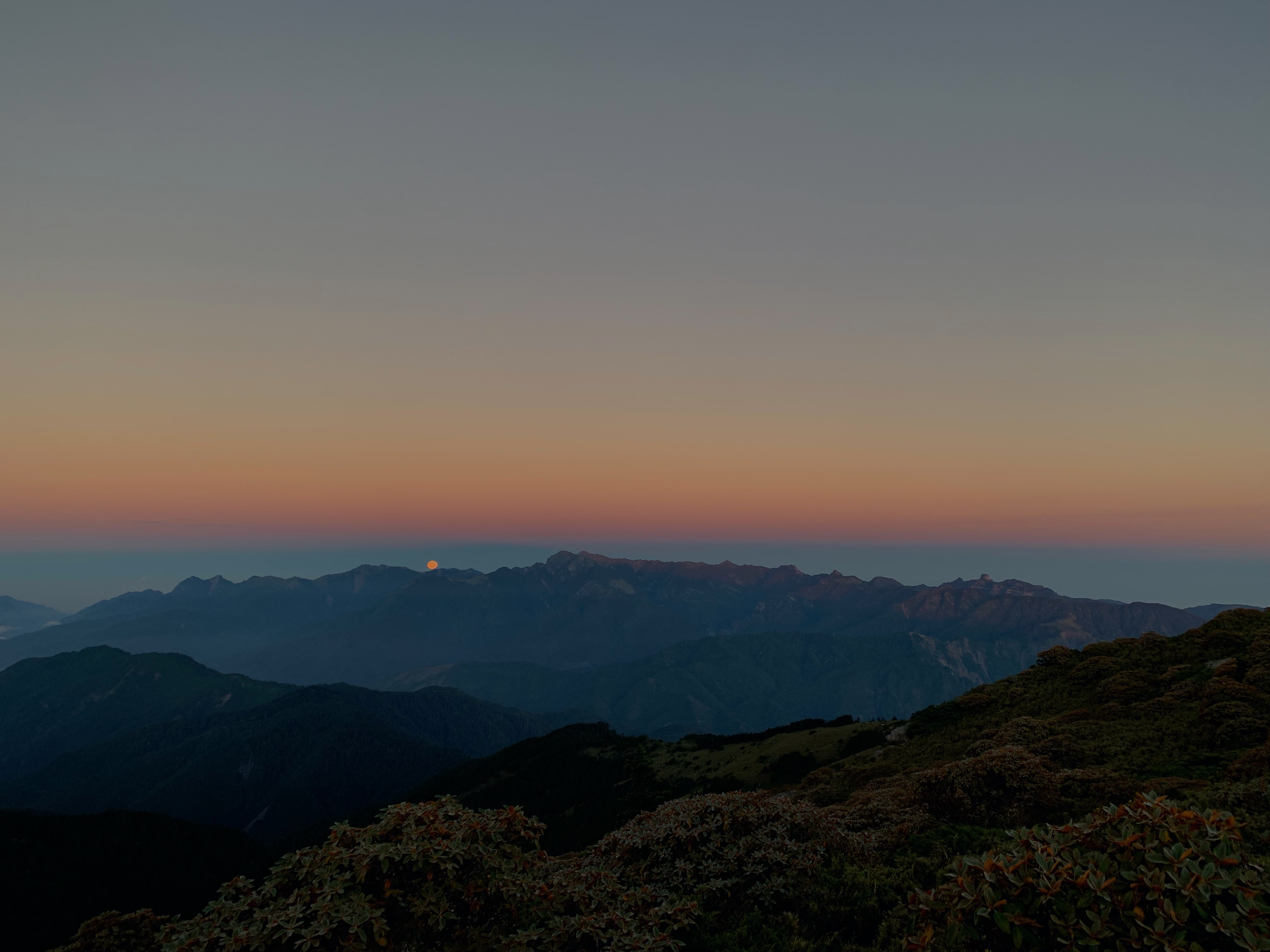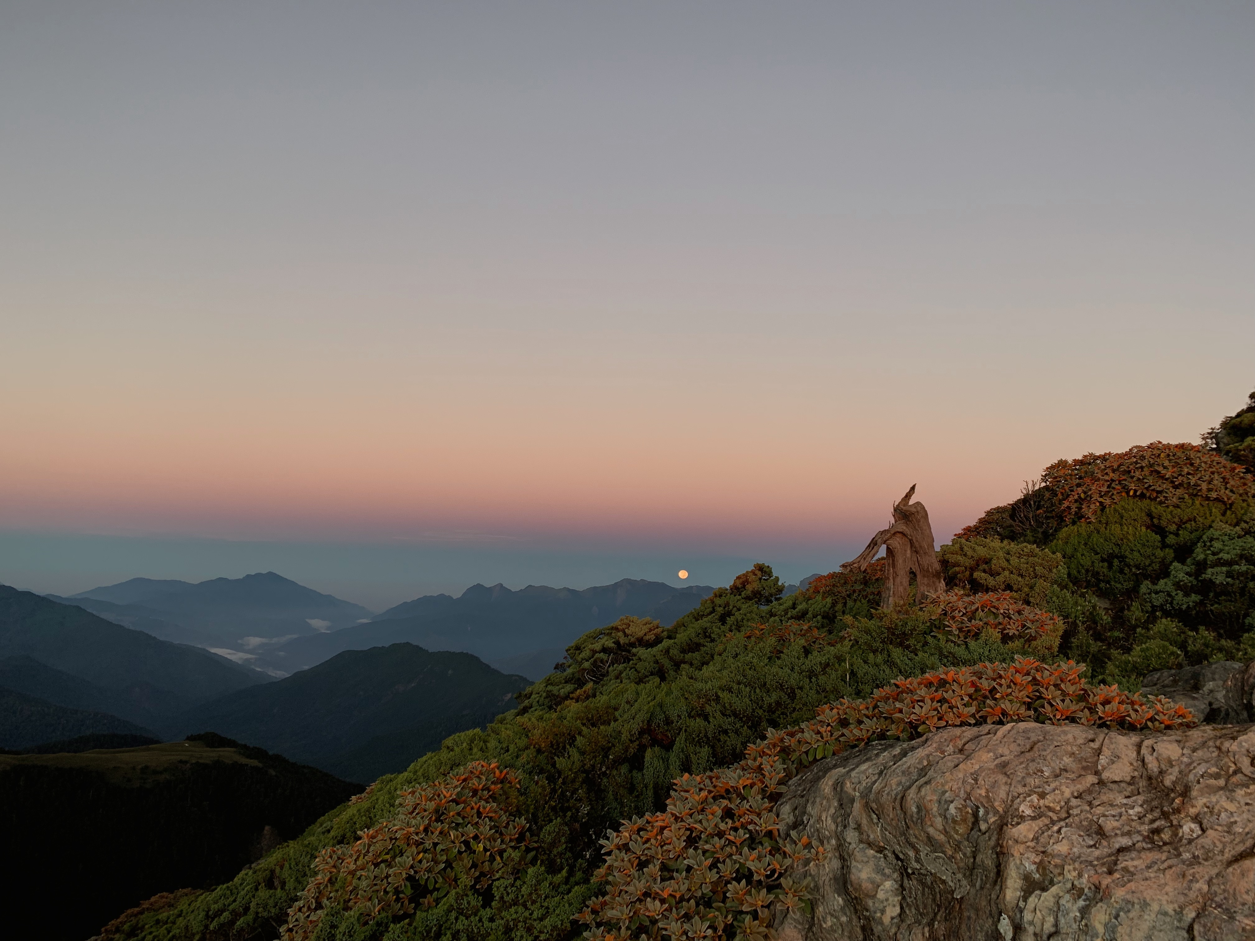 凌晨四點半從圈谷開始返程之路,在黑暗之中走上那段下圈谷的碎石坡,摸早黑走這段相對沒有這麼痛苦,緩緩的就走到上面了。此時一條筆直的紅橘光劃破了夜空,漸漸的暈開明亮,圓柏的剪影是如此的美麗。右方的太陽在橘色的光下蠢蠢欲動,黑夜即將轉為湛藍色,而左邊的景致也不遑多讓,正逢中秋月圓,滿月的月亮就這樣懸掛在聖稜線上,托襯在那又粉又藍的天空。剛好在制高點的五岩峰欣賞南湖帶來劇幕中最後的高潮,日出的光芒四射,就在這裡太陽與月亮為此劇做一個完美的謝幕。此趟南湖真的超乎期待的美,在起承轉合之中我有幸成為這個劇本裡的配角,期待再相見的那一天。