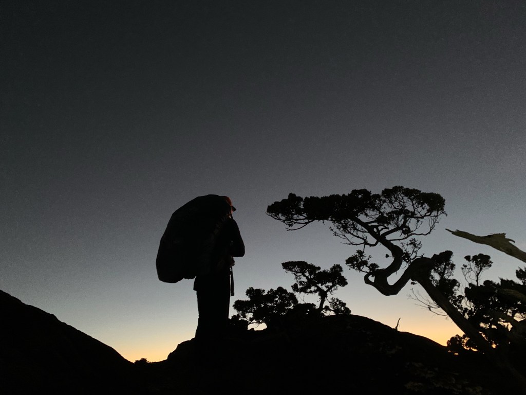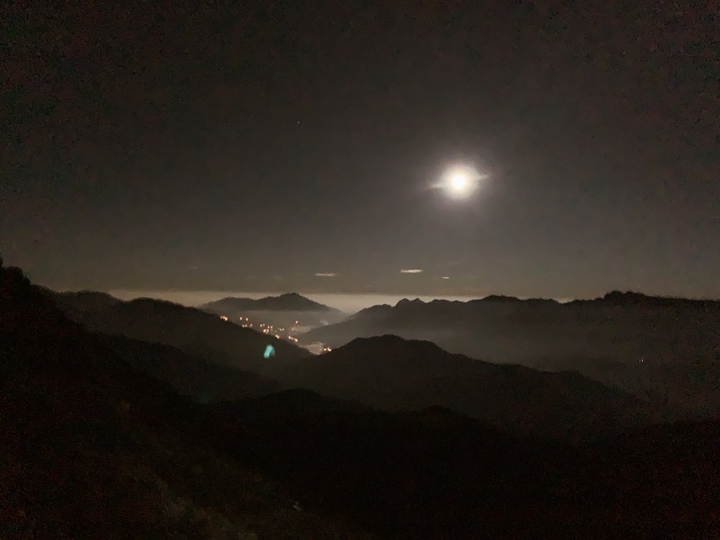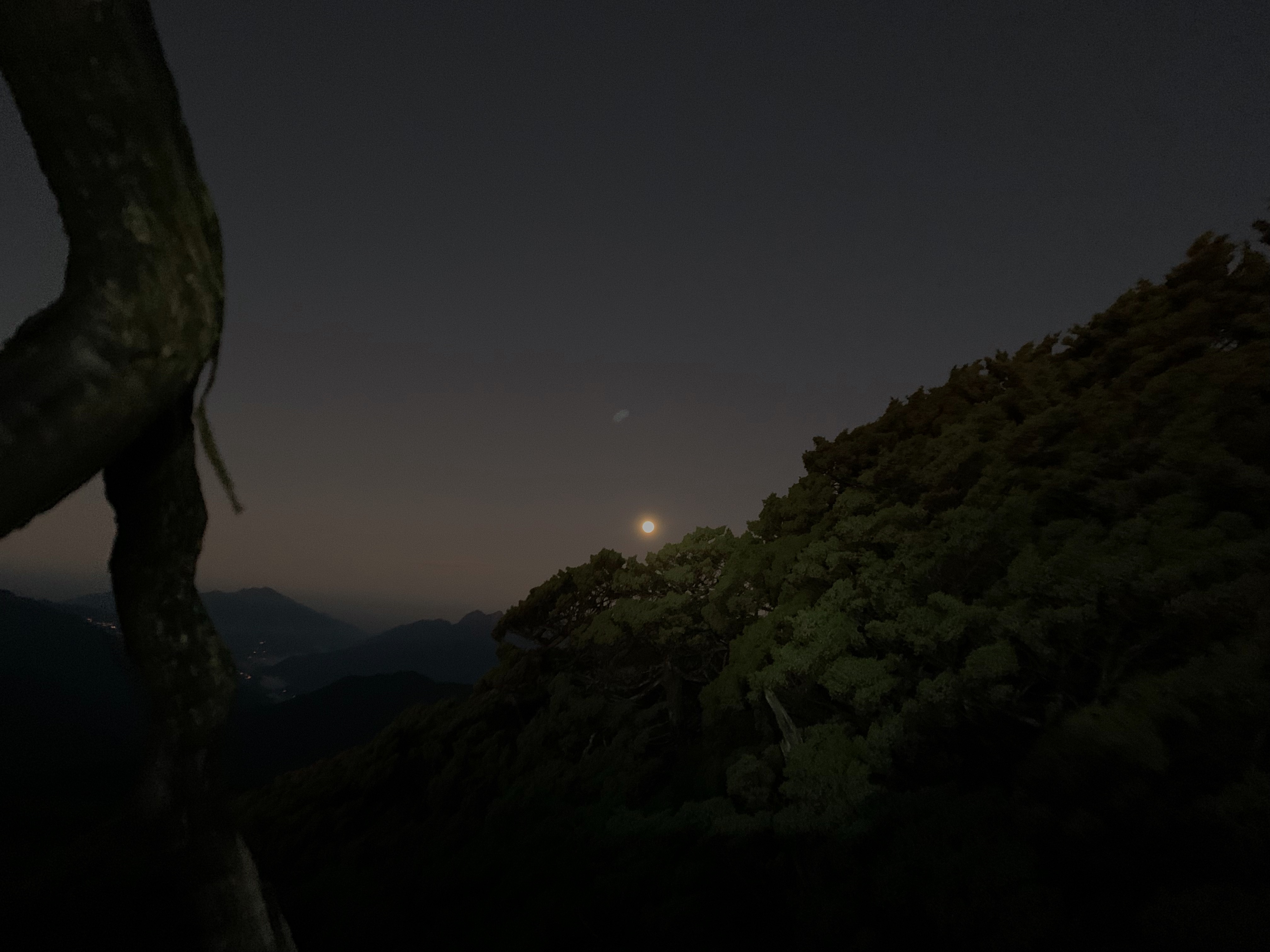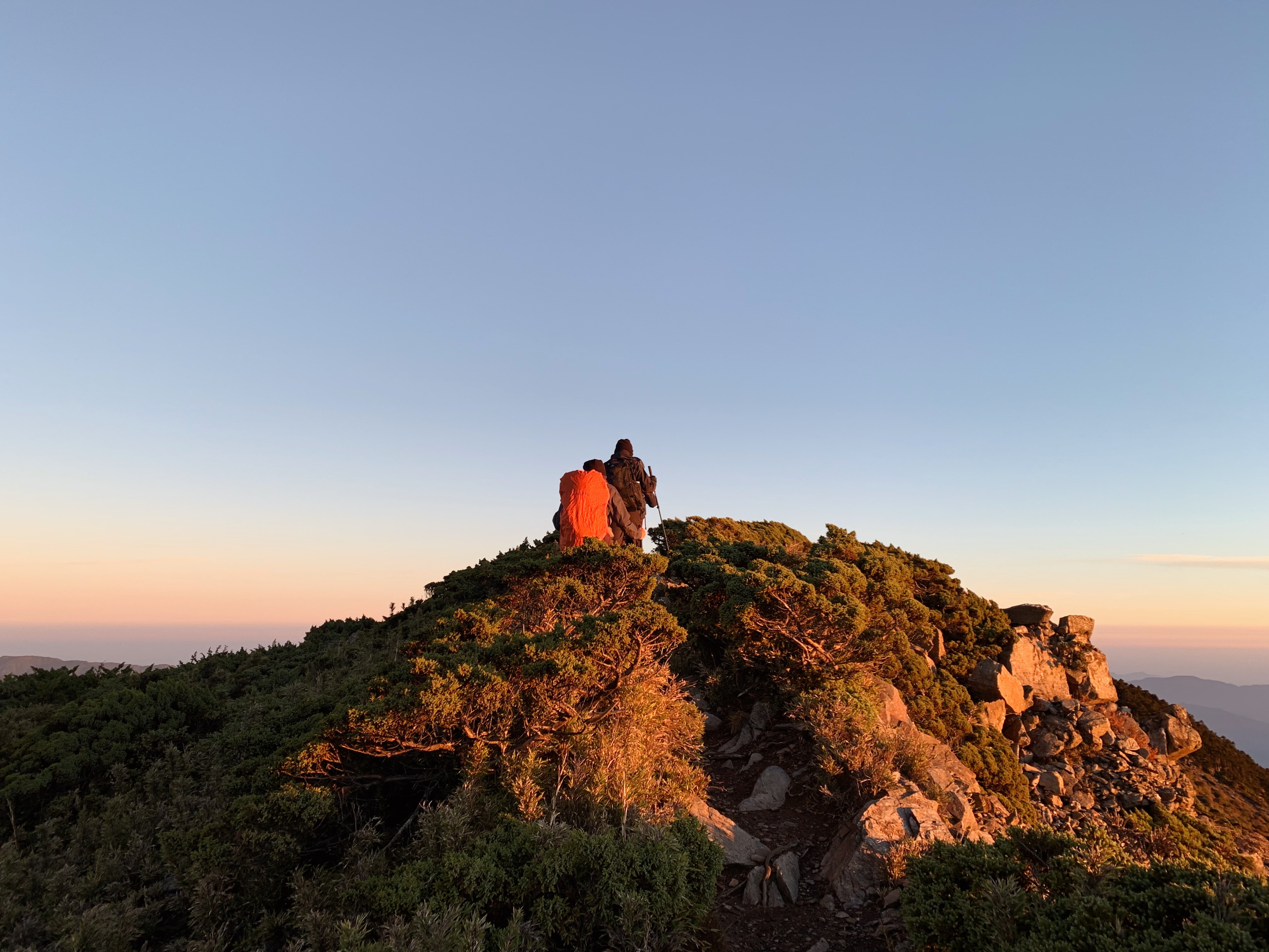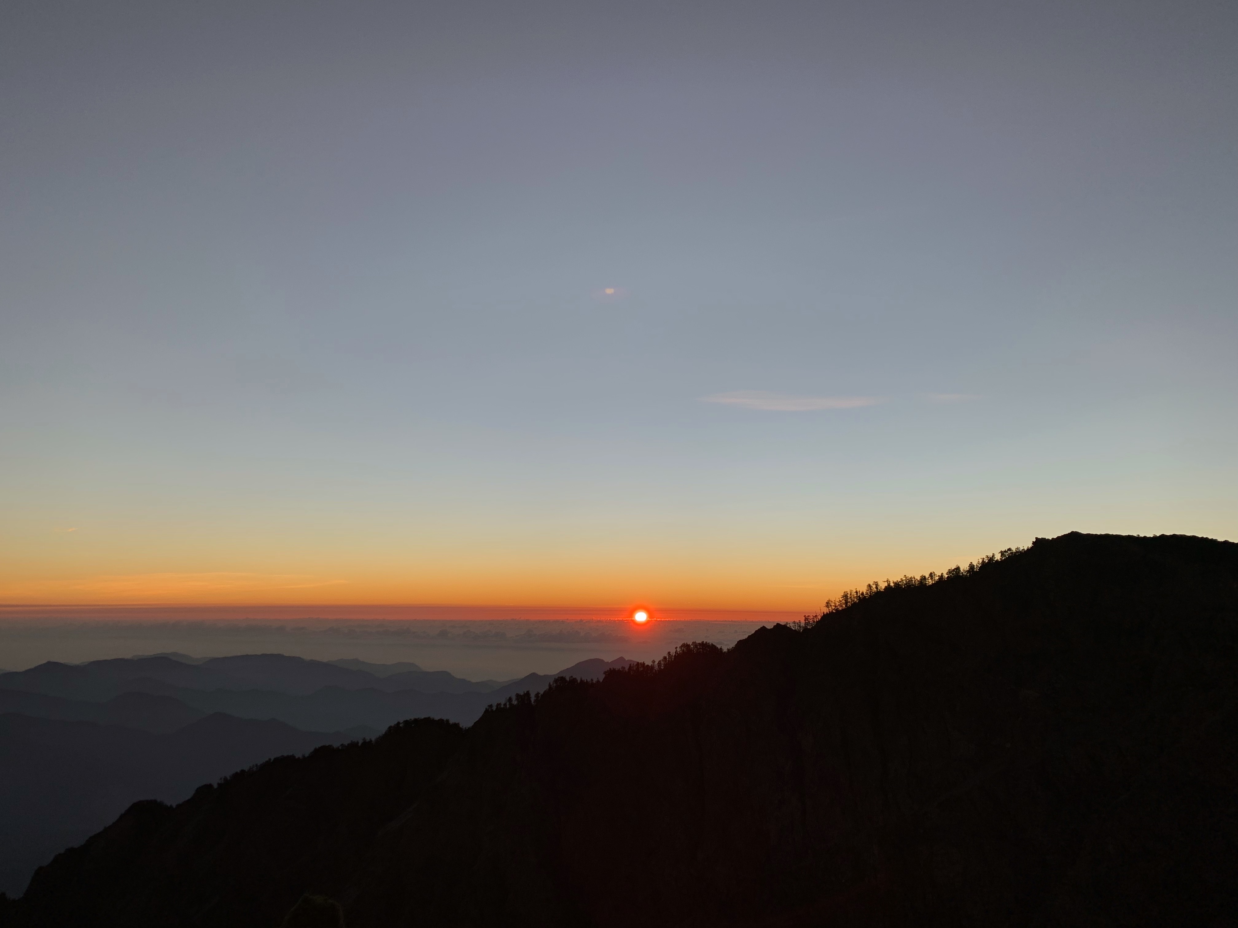 凌晨四點半從圈谷開始返程之路,在黑暗之中走上那段下圈谷的碎石坡,摸早黑走這段相對沒有這麼痛苦,緩緩的就走到上面了。此時一條筆直的紅橘光劃破了夜空,漸漸的暈開明亮,圓柏的剪影是如此的美麗。右方的太陽在橘色的光下蠢蠢欲動,黑夜即將轉為湛藍色,而左邊的景致也不遑多讓,正逢中秋月圓,滿月的月亮就這樣懸掛在聖稜線上,托襯在那又粉又藍的天空。剛好在制高點的五岩峰欣賞南湖帶來劇幕中最後的高潮,日出的光芒四射,就在這裡太陽與月亮為此劇做一個完美的謝幕。此趟南湖真的超乎期待的美,在起承轉合之中我有幸成為這個劇本裡的配角,期待再相見的那一天。