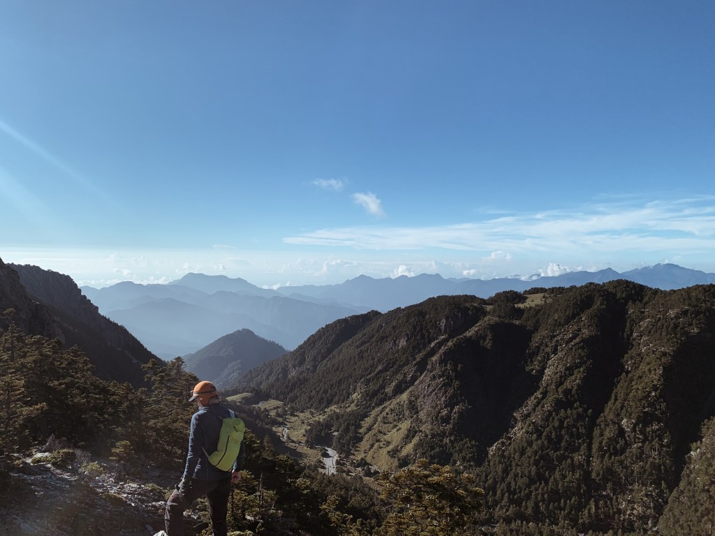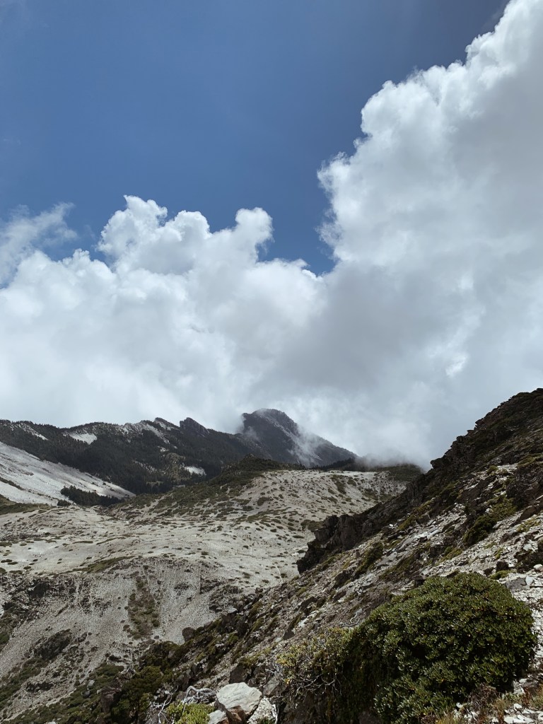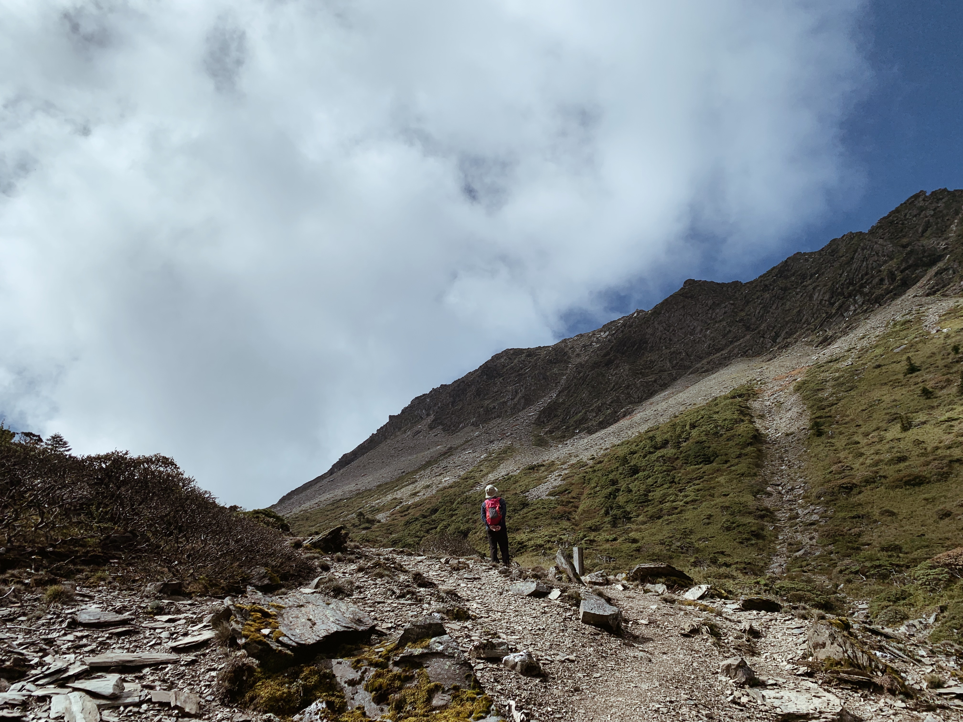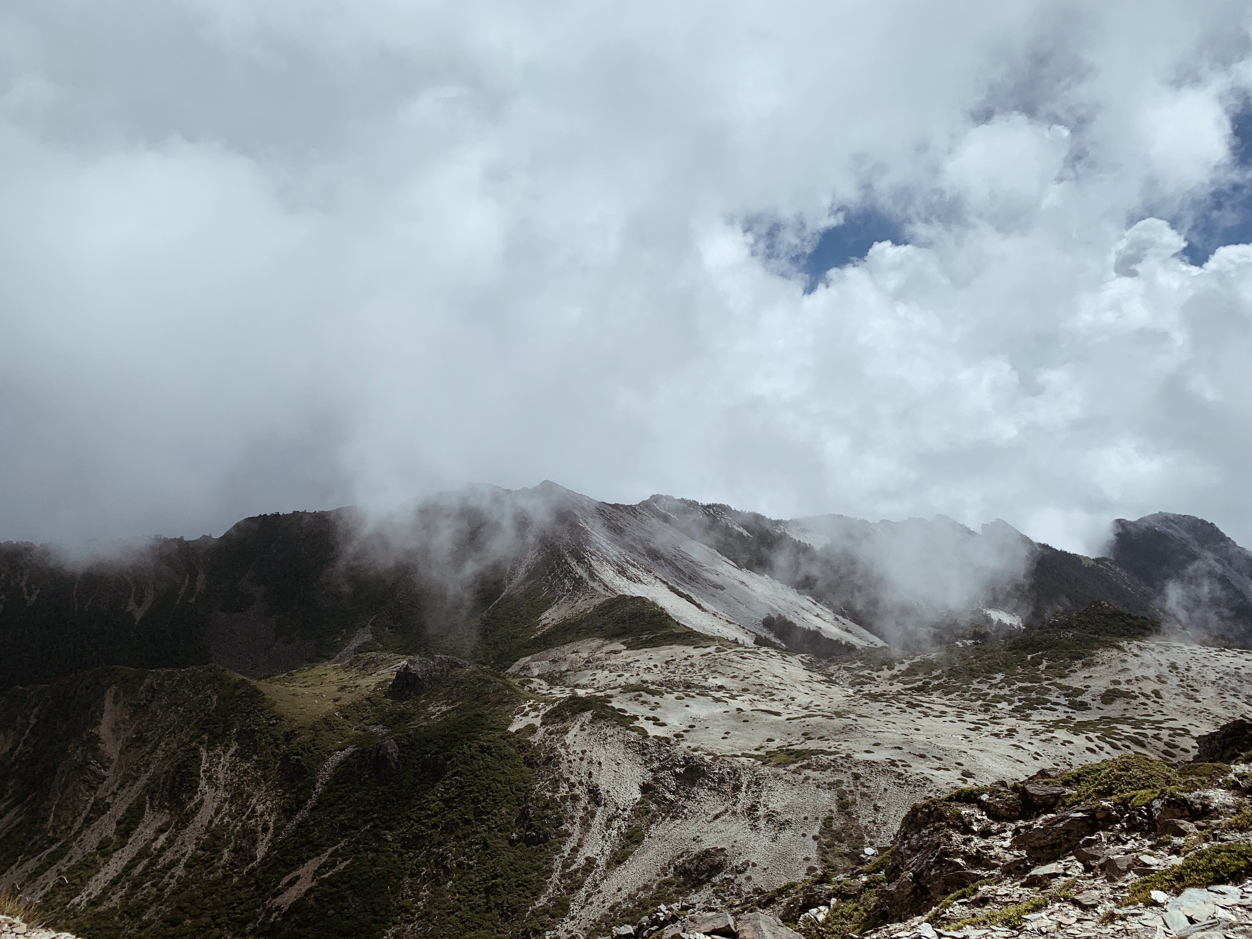 本來今天計畫是要走南湖大山、巴巴山以及南湖南峰的,但經歷了昨天的辛苦,我們決定睡到自然醒之後再去爬南湖大山就好。早上曬著暖暖的太陽實在是太幸福,把昨天溼答答的衣服拿出來曬,陽光把身體的寒氣逼出。我們悠閒的輕裝出發前往南湖大山,緩坡向上還可以回望圈谷的景緻,從圈谷到南湖大山相當的輕鬆,只有後段有些比較裸露的石塊要小心行走。今天不到11點,天空的雲就已經把藍天蓋住一大半,我們趁還有藍天的時候登上帝王之山,在山頂上被環繞的山景擁抱著。