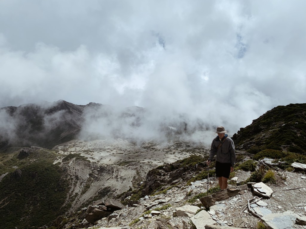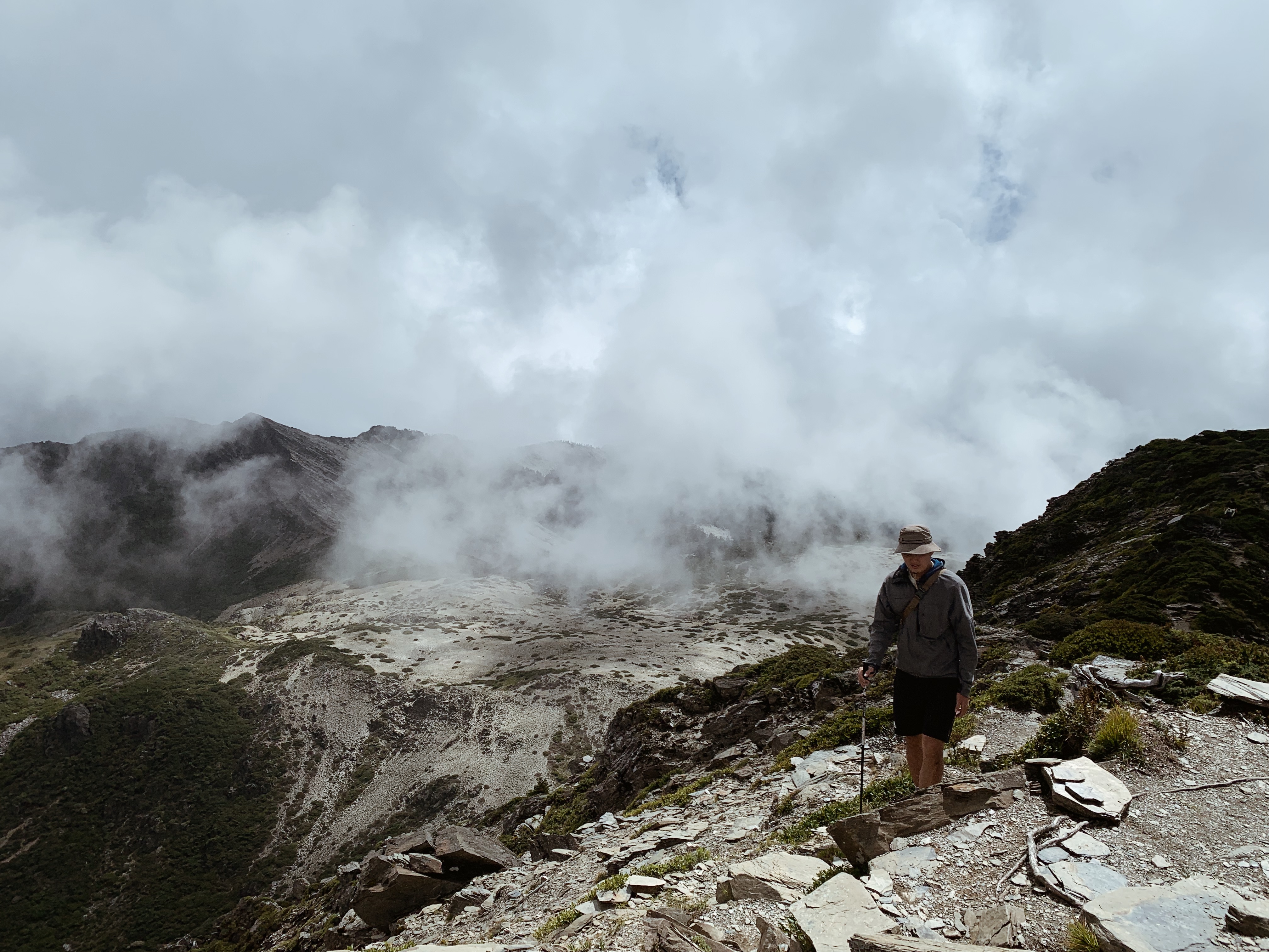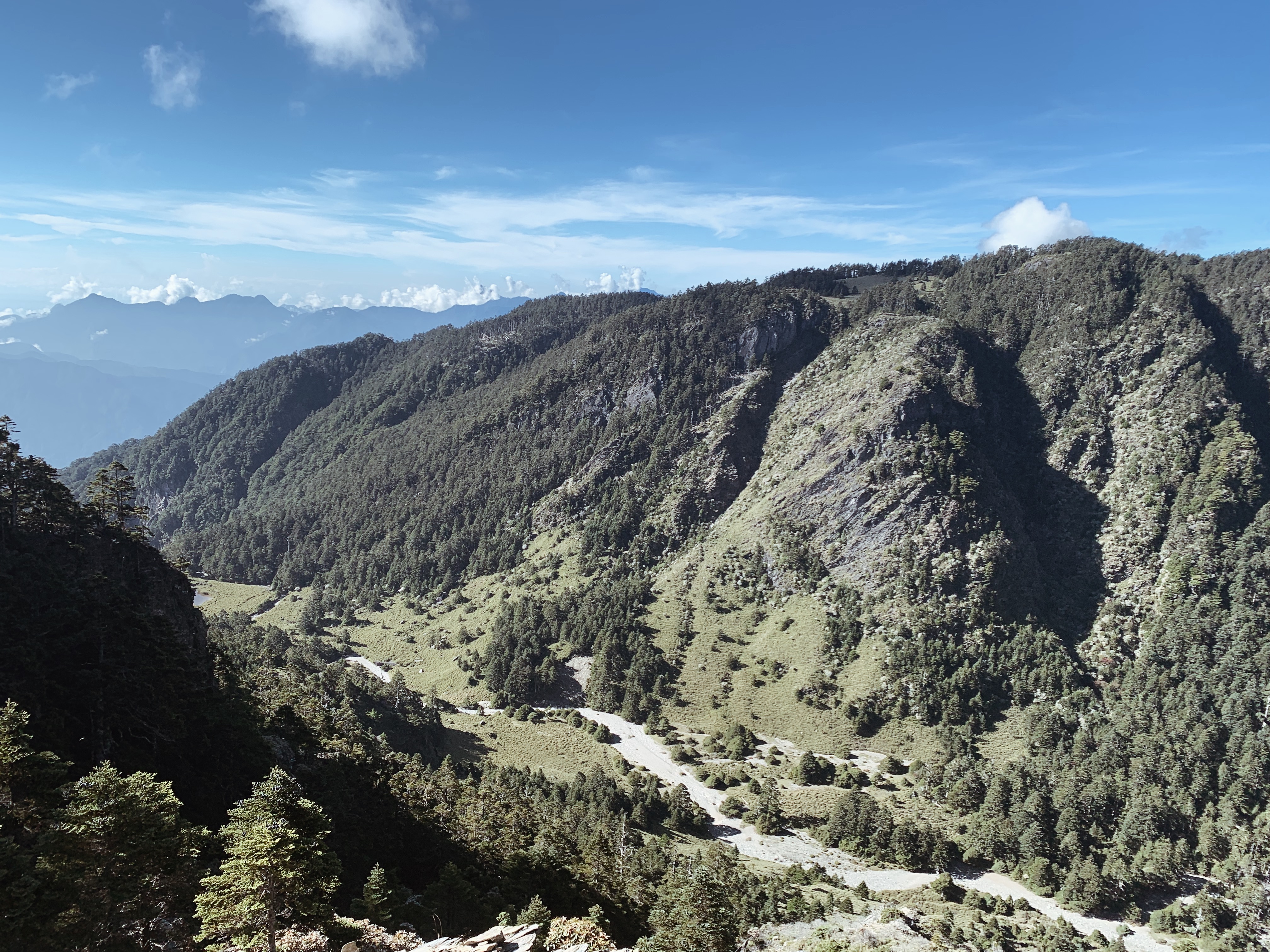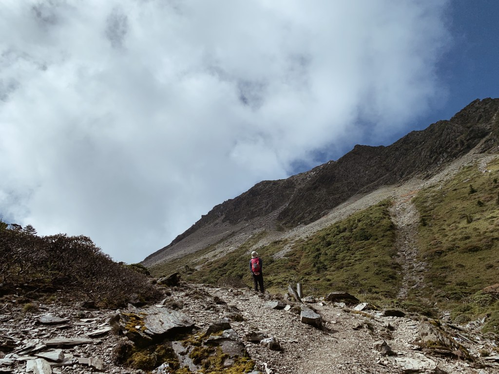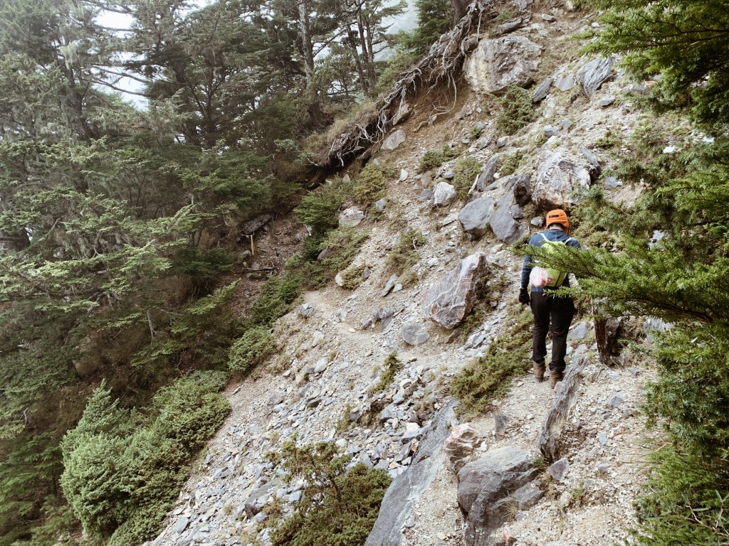 陶塞峰可以從東側上攀到頂端,不過我們還要趕路去馬比杉山,所以就沒有駐足太久,從旁沿著陶塞峰基座繞過。從這裡可以清晰看到下方的蜿蜒的溪溝,順延著兩邊的山脈包圍著。這裡路徑必須攀爬岩石地形,小心翼翼的拉繩並注意腳下的踩點。這時候周圍的雲開始靠攏,當我們到達奇形怪石區時,天空已經被白雲籠罩了!心裡覺得不太妙,因為看來天氣已經開始轉變了。