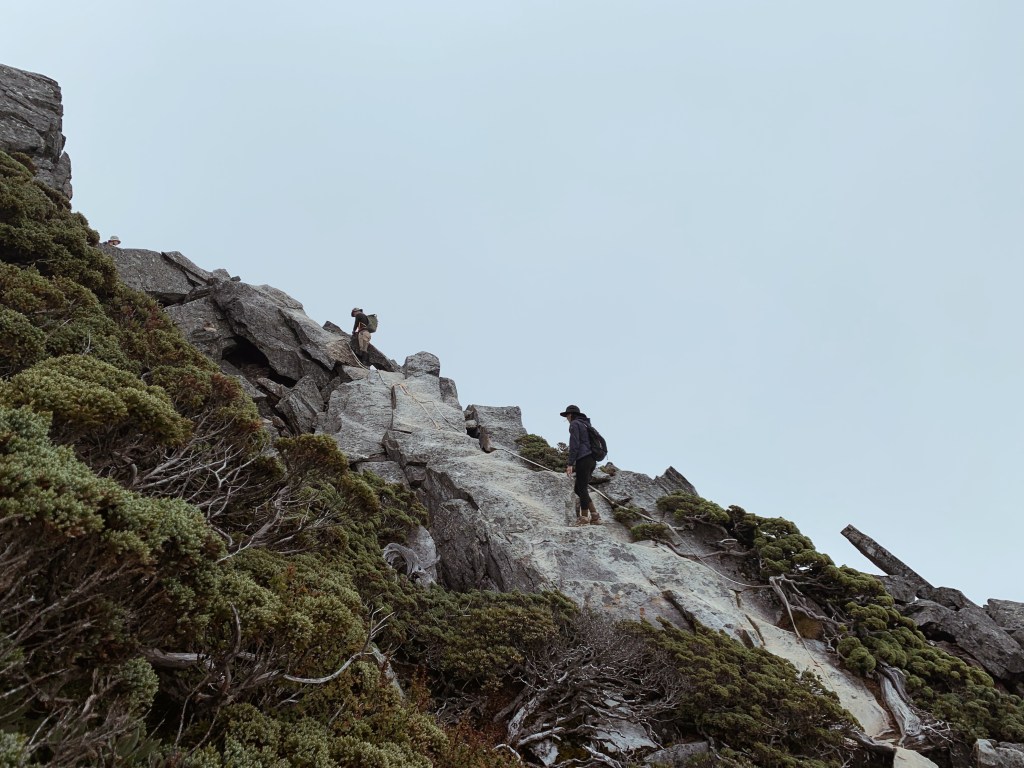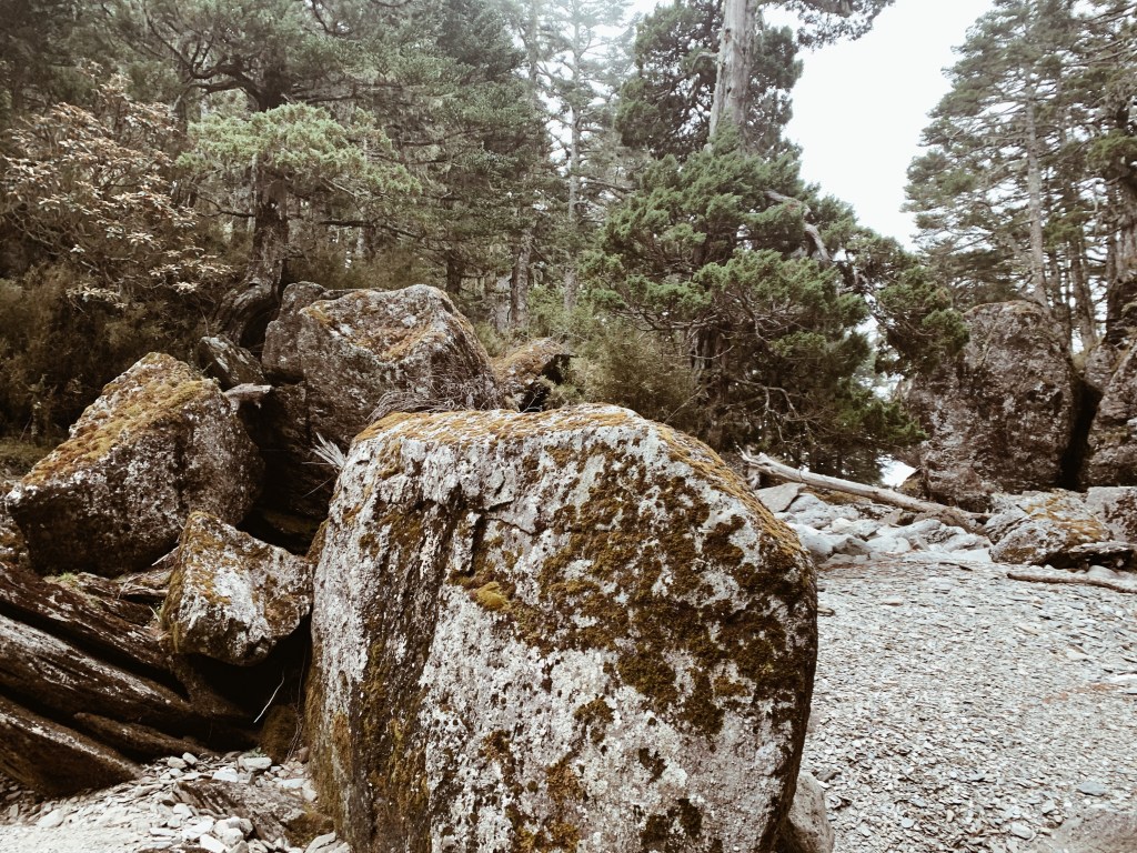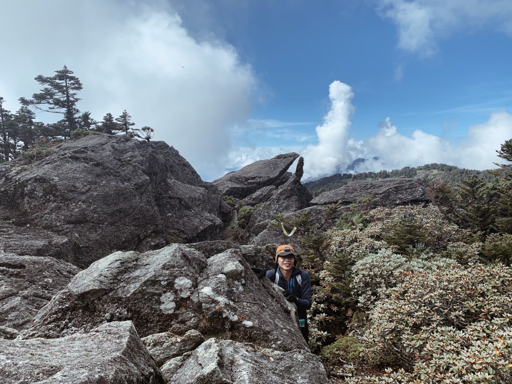 而我們就像是入侵了外星人的基地,各種形狀的岩石巨塊堆疊著,雲霧飄渺氣氛顯得更為詭譎,有兩塊岩石形狀就像是大小霸一樣。從這裡地形開始變得有些難走,必須跨越巨大的岩石並要小心不能跌落間隙,讓懼高的我走的戰戰兢兢的。因為天色看起來很不對勁,接下來就一直在趕路,馬比杉山被稱為遠的要命王國不是叫假的,走到後面都無暇拍照了!