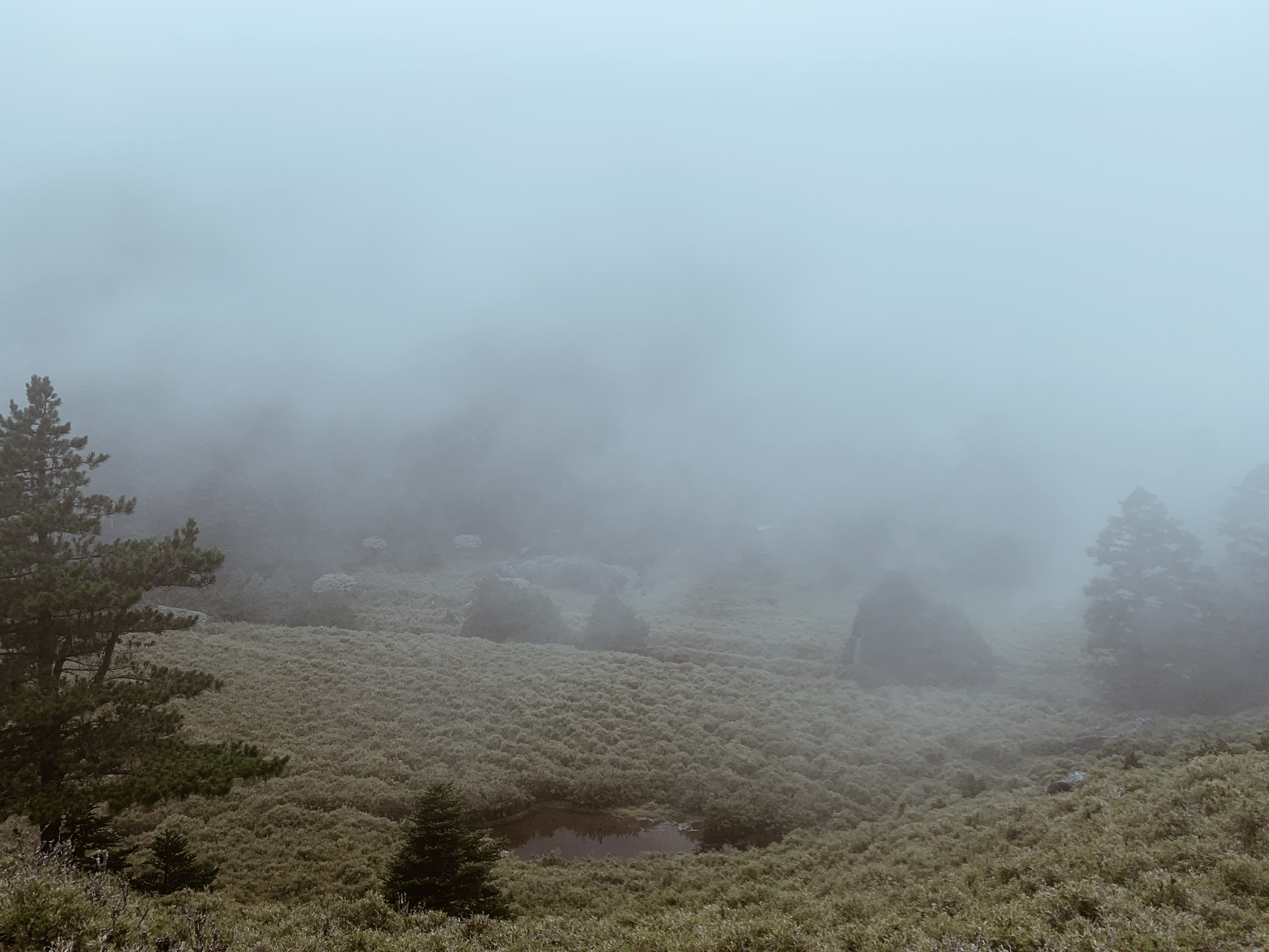 走在溪谷時雲霧已經完全覆蓋,看天池也在迷霧之中,如果天氣好的話這個谷地一定很迷人。回程我們也有去反方向的石洞獵寮看一下,幾塊巨石但不確定石洞的入口在哪。我們沿著乾溪溝持續前進,在上攀之前我們先在一個山壁處裝了水,接下來開始點點細雨。覺得不太對勁,穿上雨褲之後雨唏哩花啦的下下來,要爬的石頭變得很滑,因為體力下降讓我有些累到崩潰,淚水和雨水交織在我臉上。