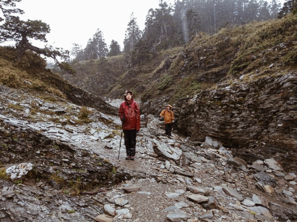 雨水像是潰堤般下不停,溪溝被灌了許多水,有時候根本避不開只能整隻腳泡在水裡,全身濕透溫度也降低。霎那間雷聲轟動,那個雷聲更是在谷地中迴盪,彷彿像是災難場景,心裡的恐懼油然而生,縱使無力只能前進。最後要走回東峰叉路口的時候簡直是心力交瘁,雨已變成了冰雹,上到叉路口時終於有種安心的感覺。回到山屋時,還好留守圈谷的隊友立即給我們熱騰騰的奶茶,真的很感謝有他們,在帳篷中換下濕透的衣服時整個冷的在發抖,回想剛剛的場景就像是惡夢一般。但老實說撇除氣候增加了回程的困難度,其實馬比杉山的路途有許多驚豔的美景。