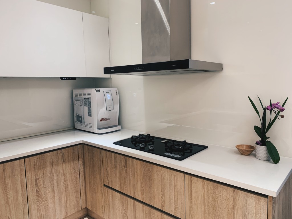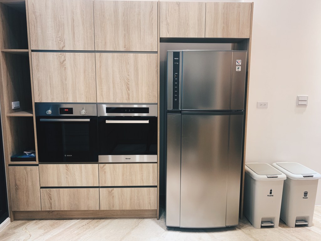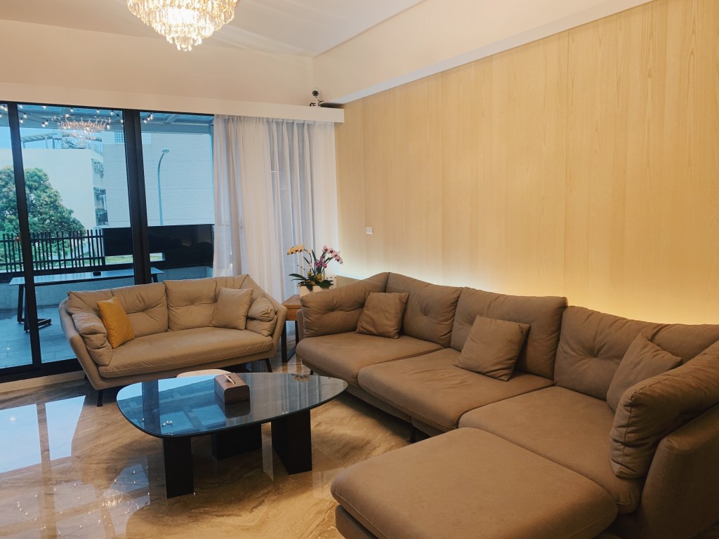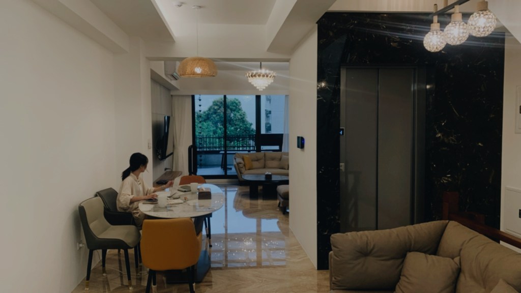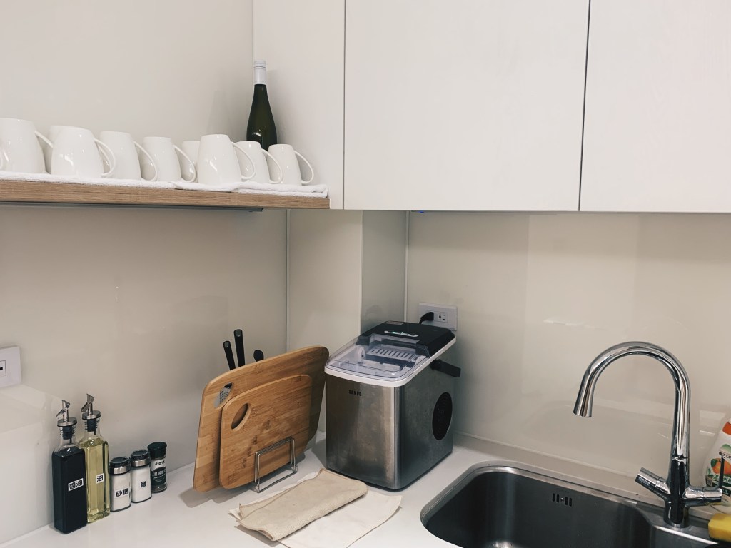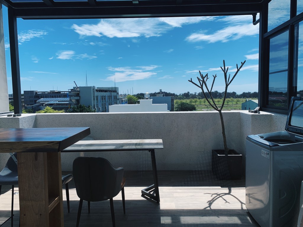 民宿的管家立即下來接待我們,帶領我們入住並且為我們介紹民宿內的設施。這整棟共六層樓,房間座落於三樓到五樓,而二樓是活動的空間包含客廳和廚房。民宿設有電梯,很適合全家老小一起來包棟,就不用扛著行李走樓梯,免除許多行動上的困難。到了二樓的公共空間,我簡直是徹底驚艷!不僅是內部空間的設計簡約大器與明亮,還有那些滿足住客所需的設施。寬廣的客廳有大座的沙發,打開電視還有內建Netflix,旁邊是個外推日式氛圍的大陽台。上去五樓還有個陽台的小吧台,旁邊還有洗衣和烘乾機可以使用。